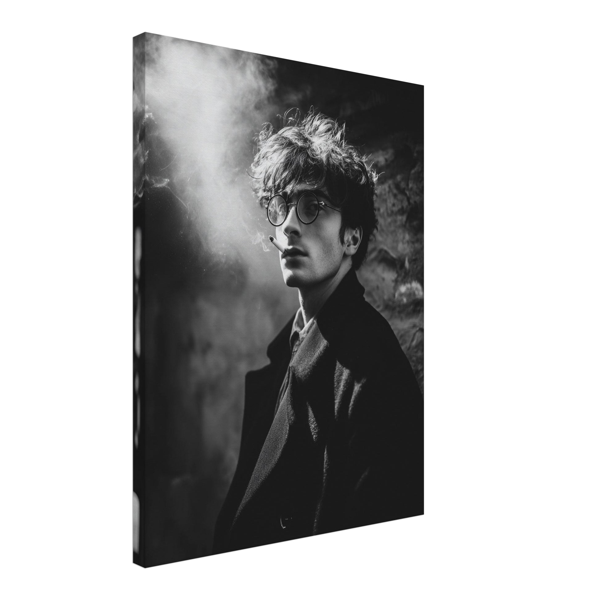 Aus einer dunklen Fläche heraus entwickelt sich langsam das Porträt. Licht zeichnet Stirn, Nase und Mund, während der Rauch wie eine weiche Schicht zwischen Motiv und Raum liegt. Die Leinwand bringt Struktur in die feinen Grautöne und verstärkt die Atmosphäre. Im Schlafzimmer oder im Wohnzimmer entsteht so ein ruhiger Fokus, der weder dominiert noch verschwindet. Das Leinwandbild verbindet Klarheit mit Zurückhaltung und schafft eine zeitlose, ausgeglichene Raumwirkung.