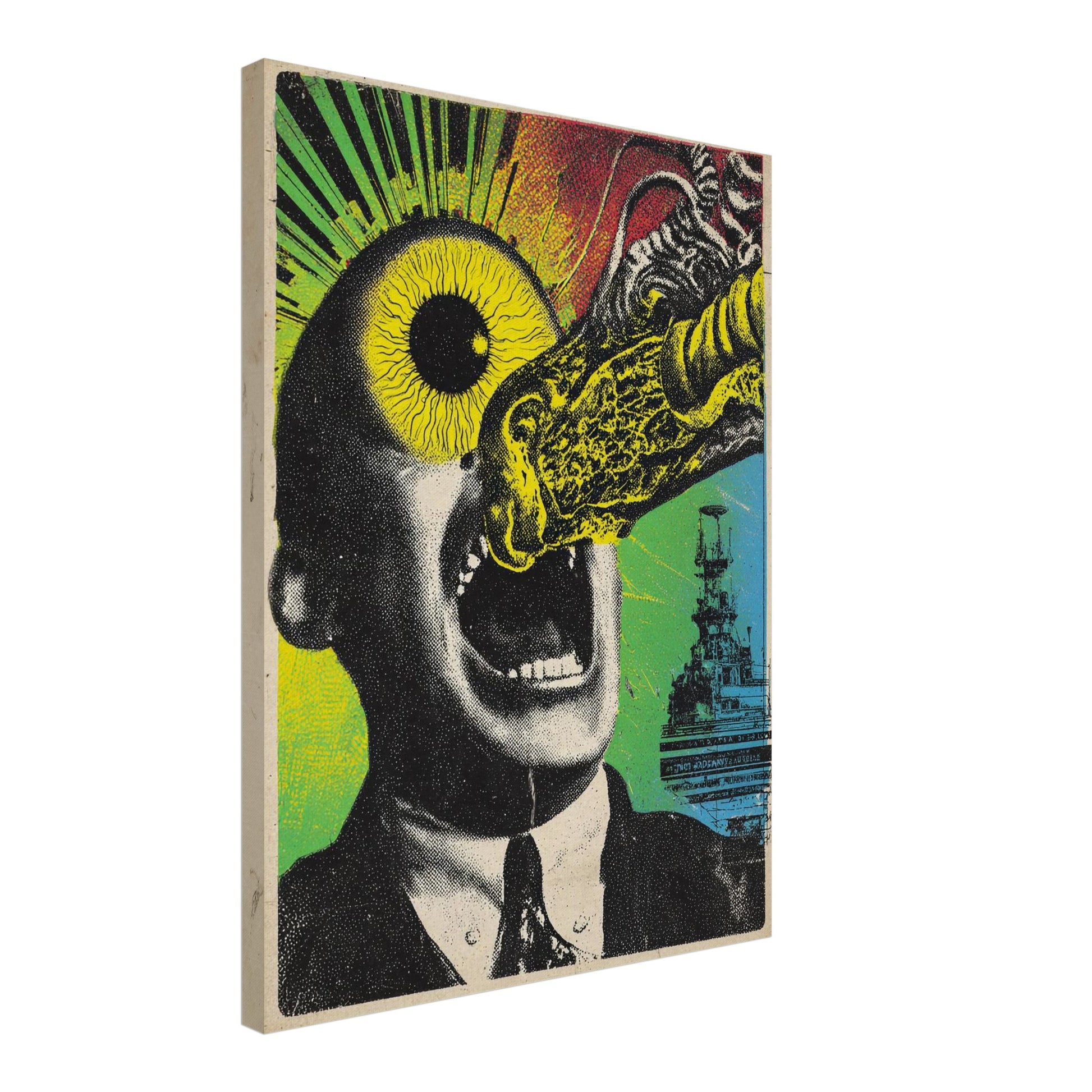 Dieses Psychedelic Art Canvas ist ein elektrisierendes Sinnbild für Bewusstsein und Chaos. Das gigantische, gelbe Auge scheint zu explodieren und bricht in Wellen von Licht und Farbe hervor. Das Psychedelic Design verbindet surrealistische Collage-Elemente mit modernem Grafikstil und erzeugt so eine intensive, fast greifbare Spannung. Ideal für das Wohnzimmer oder kreative Arbeitsbereiche, zieht diese Komposition als Teil der Psychedelic Bilder jeden Blick auf sich. Ein Psychedelic Meisterwerk voller Bewegung, Symbolkraft und visueller Explosion.