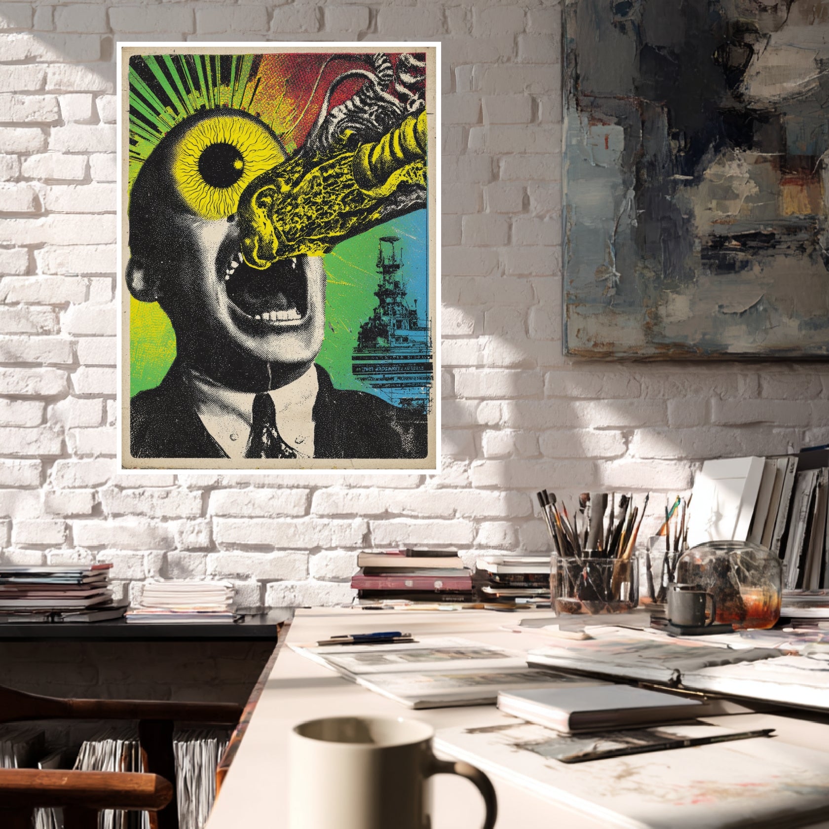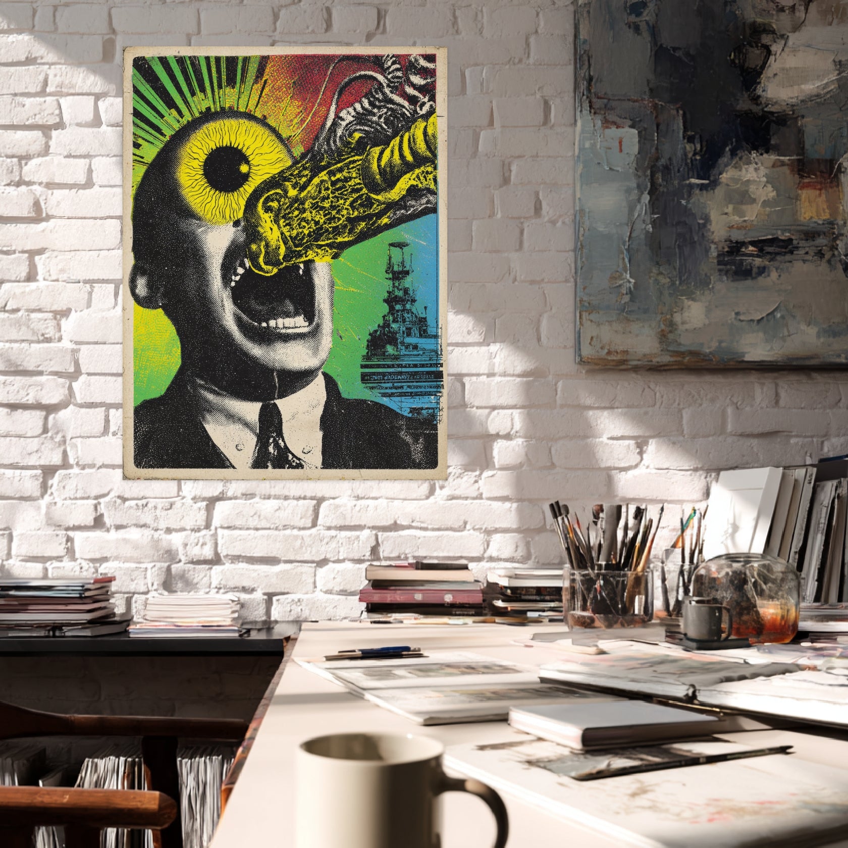 Ein visuelles Beben durchzieht dieses Psychedelic Art Poster: Der Mann mit dem explodierenden Auge steht im Zentrum einer grellen Farbsymphonie aus Gelb, Grün und Rot. Sein offener Mund und das pulsierende Licht symbolisieren einen Moment ekstatischer Entladung – zwischen Schock und Erleuchtung. Das Motiv verkörpert den radikalen Ausdruck des Psychedelic Style und zieht den Blick magnetisch an. In einem Wohnzimmer oder Flur wird dieses Psychedelic Kunstwerk zum Mittelpunkt der visuellen Wahrnehmung – provokant, rebellisch und voller Energie.