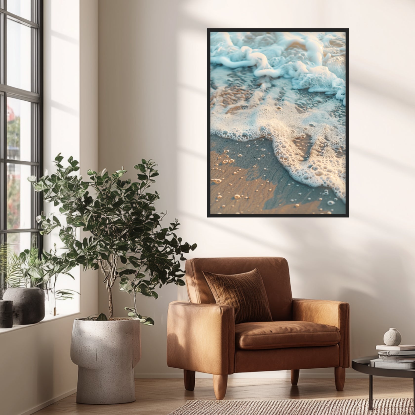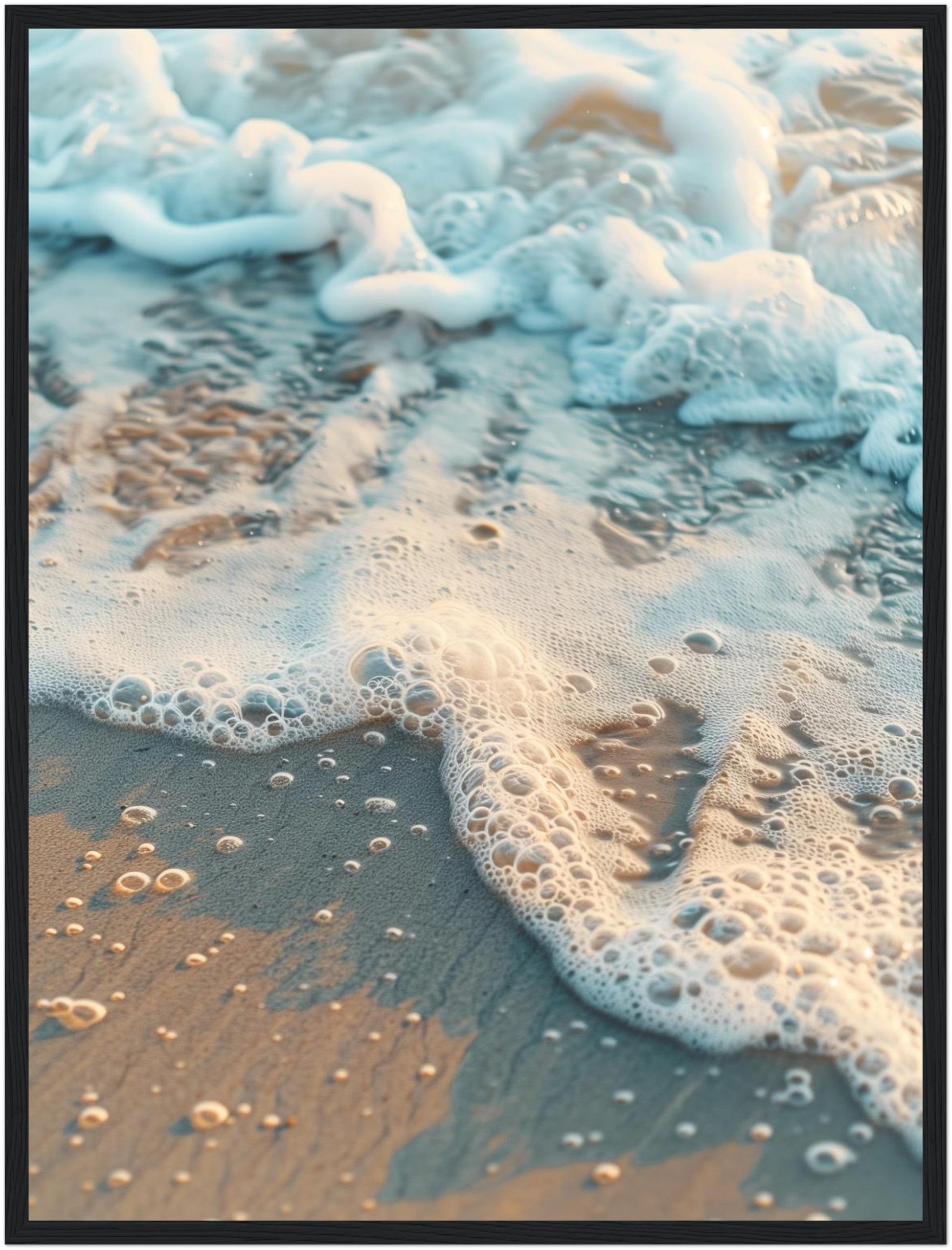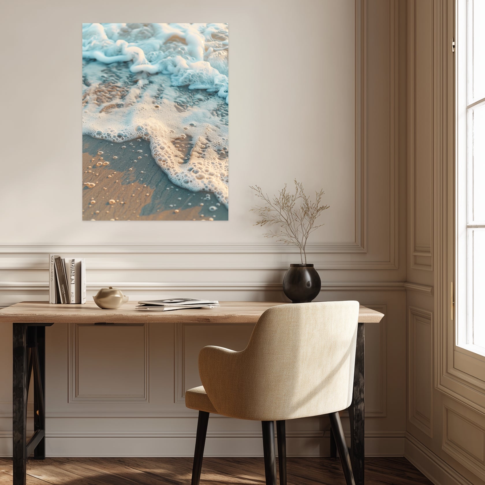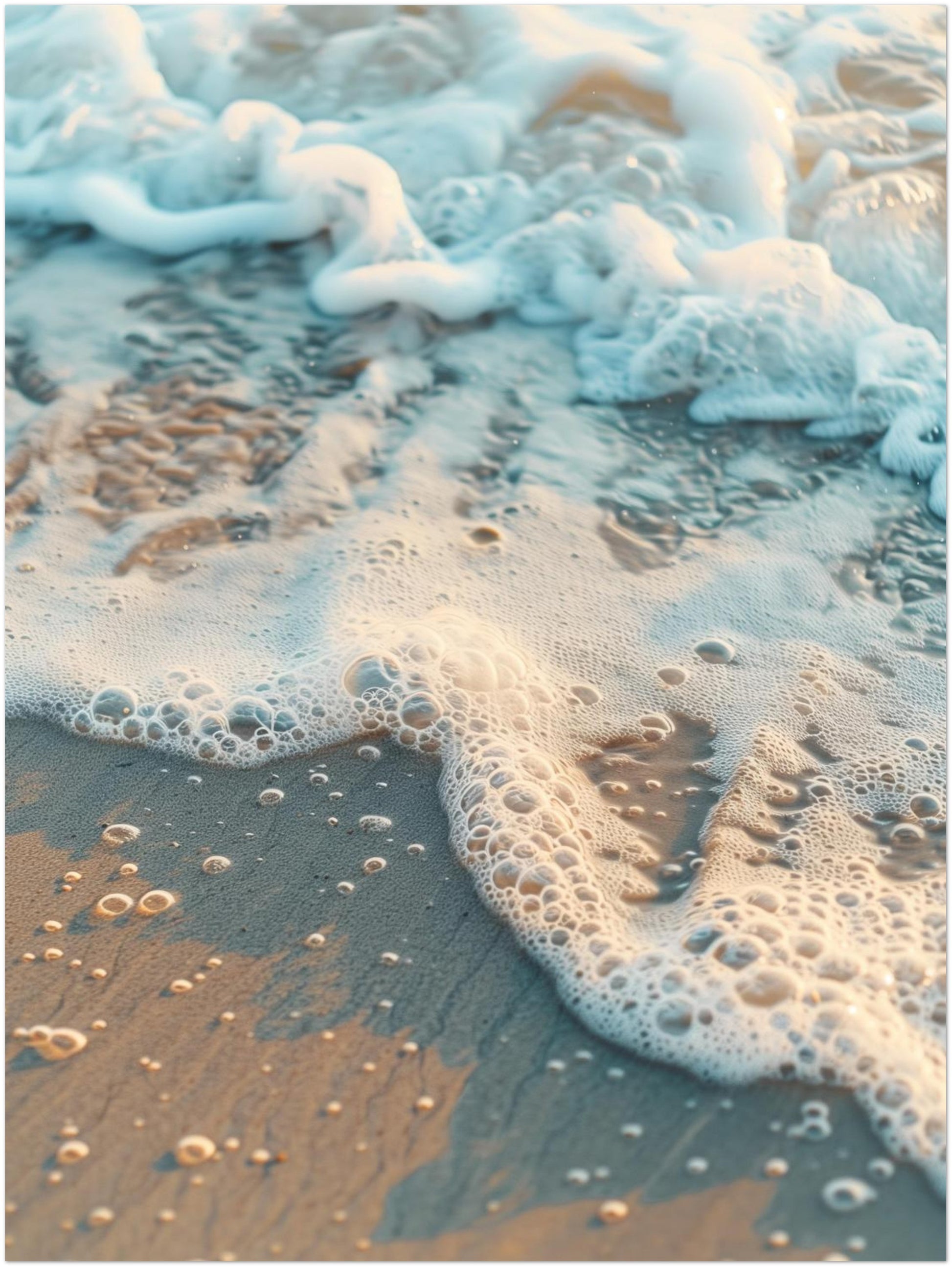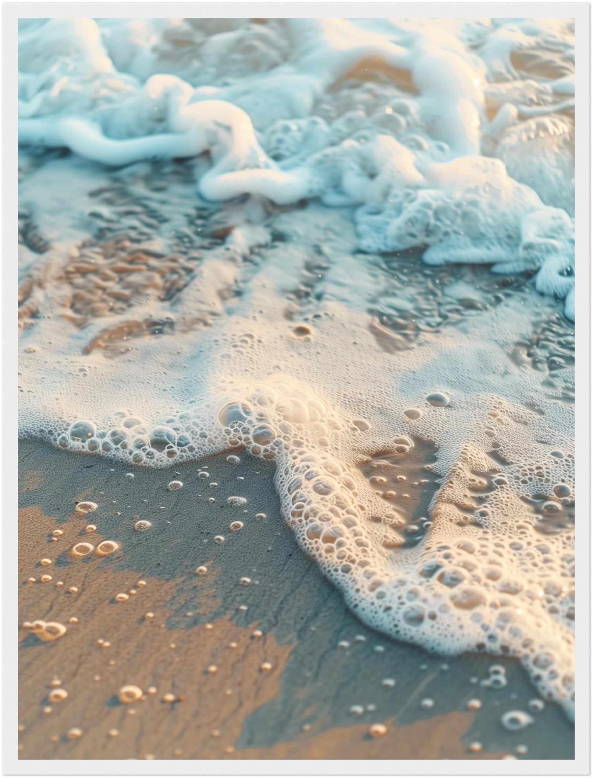 Das Meerschaum auf nassem Sand Poster konzentriert sich auf die feinen Details der Küste. Der helle Schaum bildet sanfte Linien auf dem dunkleren Untergrund und erzeugt eine ausgewogene Komposition. Lichtreflexe bleiben zurückhaltend und unterstreichen die ruhige Landschaft. In Wohn- oder Arbeitsräumen wirkt dieses Poster offen und klärend. Die Natur zeigt sich hier still, reduziert und zugleich präsent.