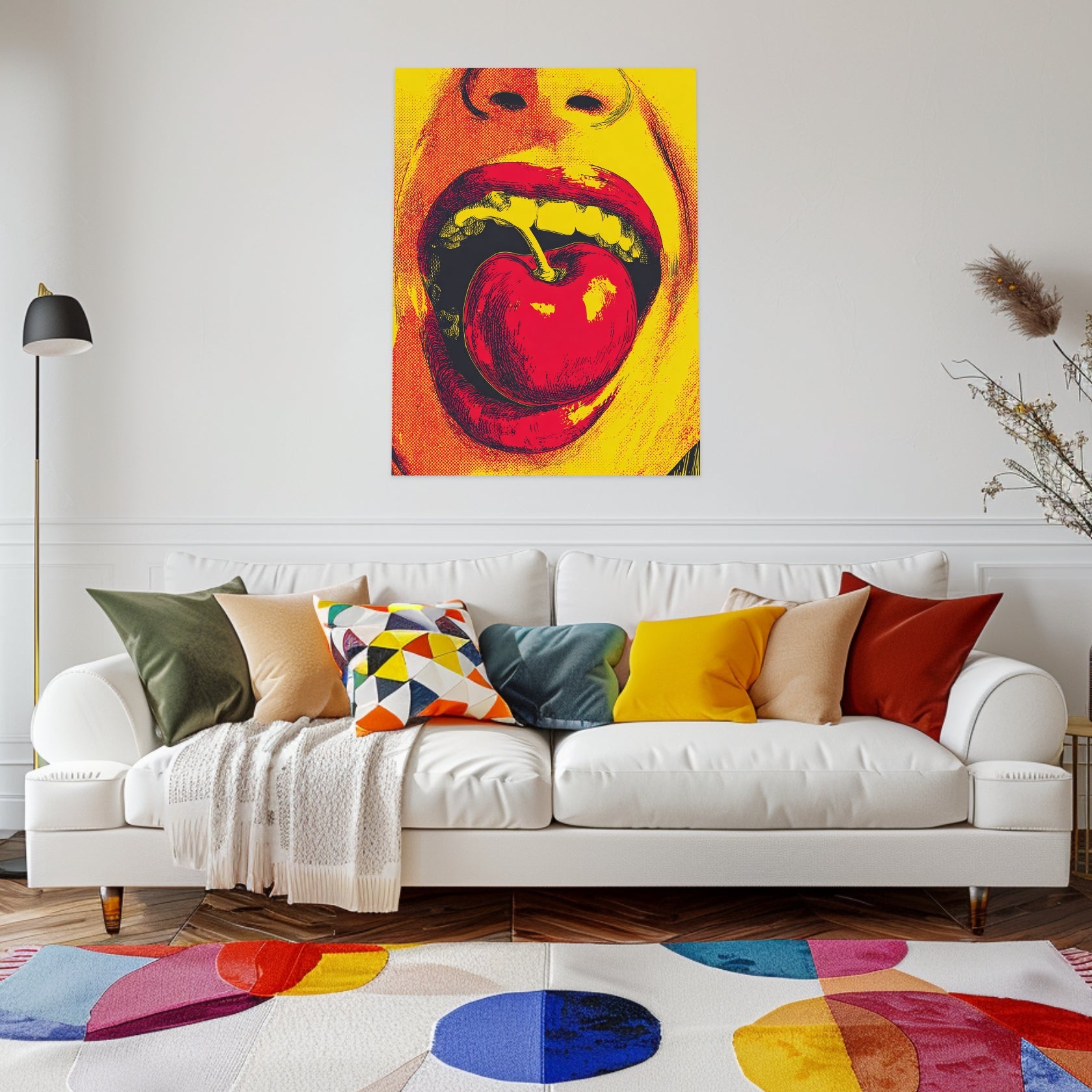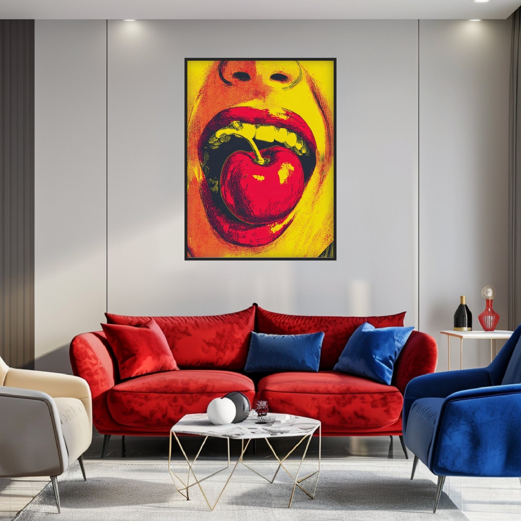 Ein Feuerwerk der Kontraste – leuchtendes Gelb, tiefes Schwarz, elektrisches Rot. Das Pop Art Poster „Mund mit Kirsche“ zeigt den Moment purer Verführung: geöffnete Lippen, glänzende Frucht, ein Hauch Provokation. Diese Bildsprache ist klar, direkt und sinnlich. Es ist Popular Art, die mit Energie vibriert und das Alltägliche in ein Symbol der Rebellion verwandelt. Das Motiv bringt Dynamik und Mut in jeden Raum – ob Wohnzimmer oder kreative Loftküche. Ein Pop Art Motiv, das laut spricht und in kräftigem Popart Stil den Nerv der Zeit trifft. Kunst, die man nicht nur sieht, sondern spürt.