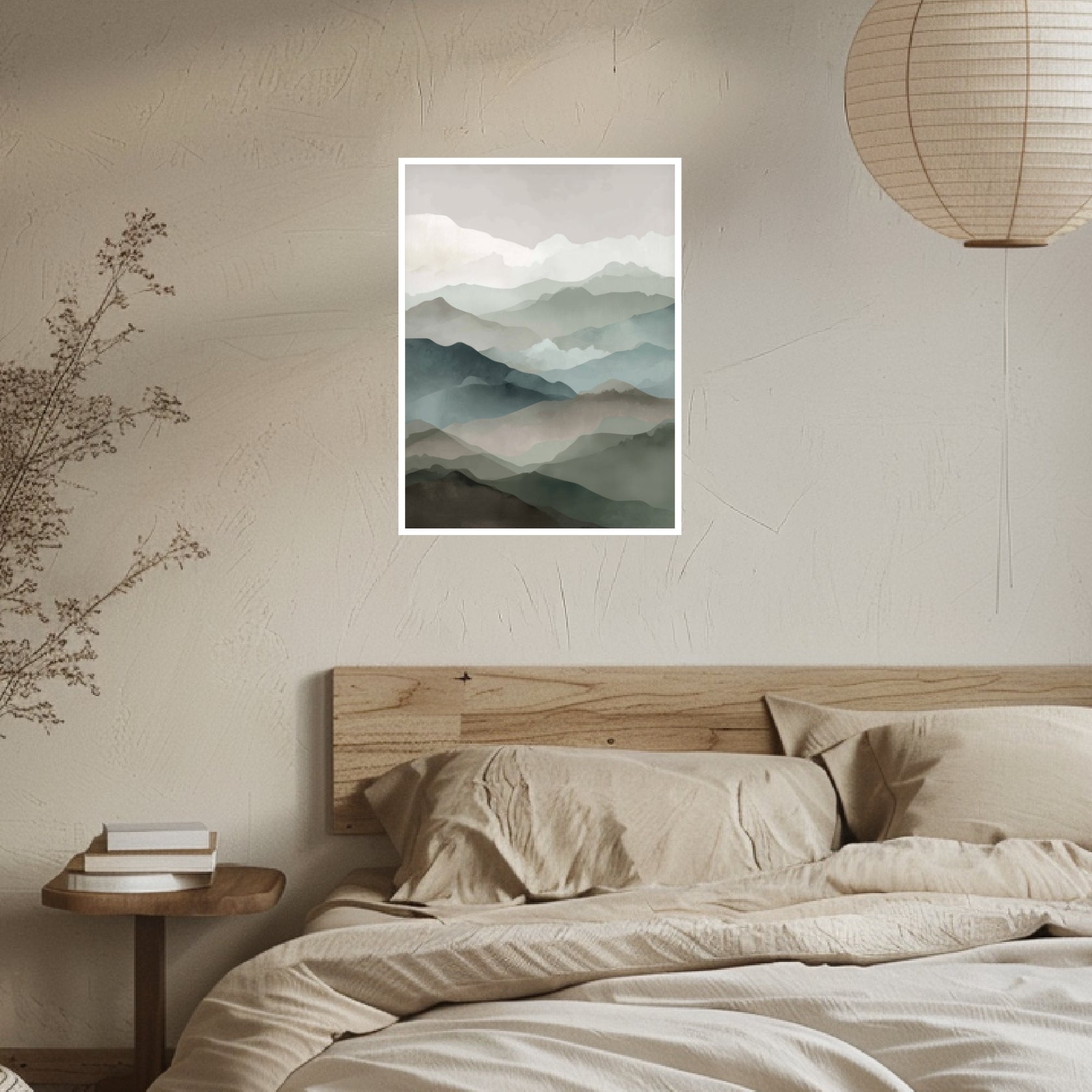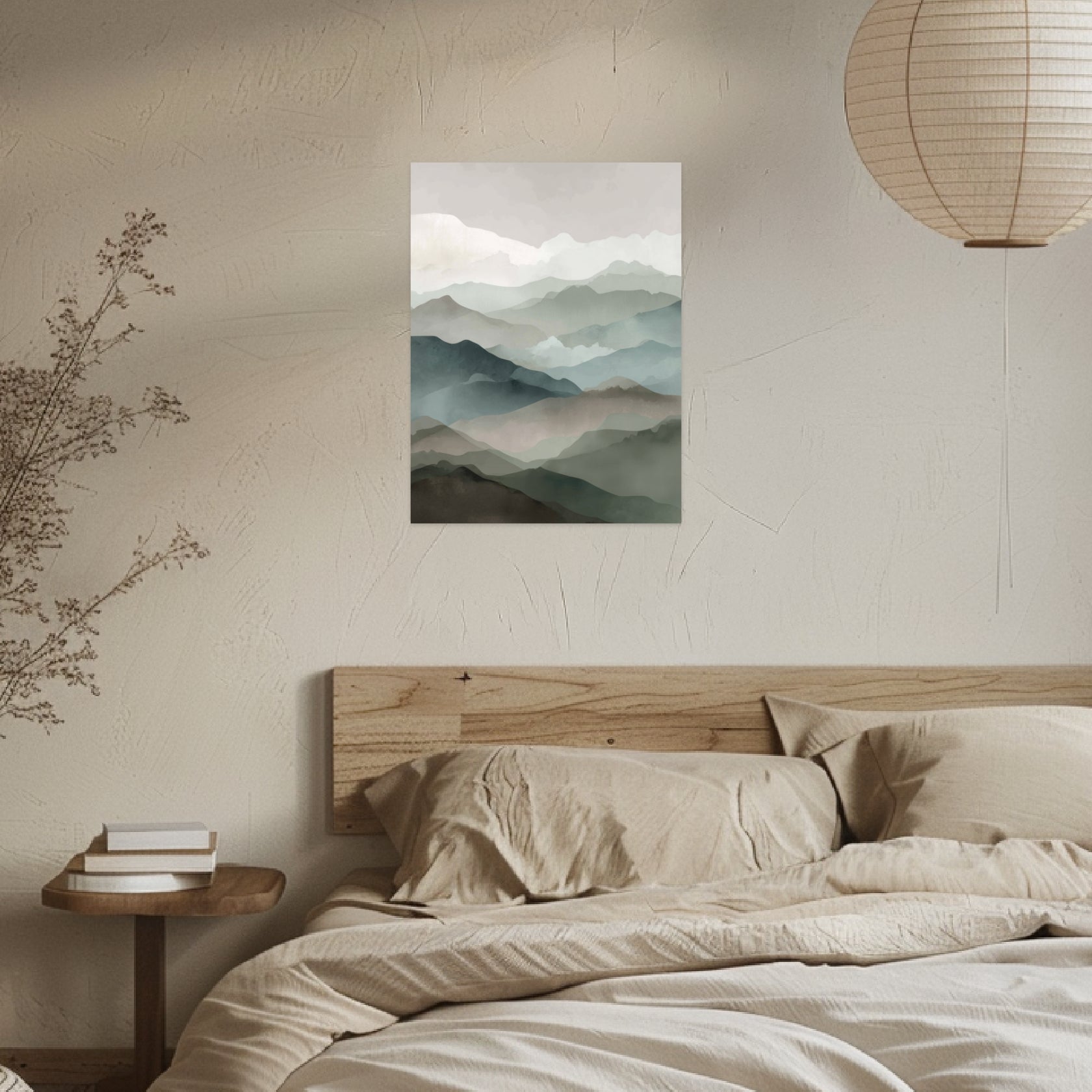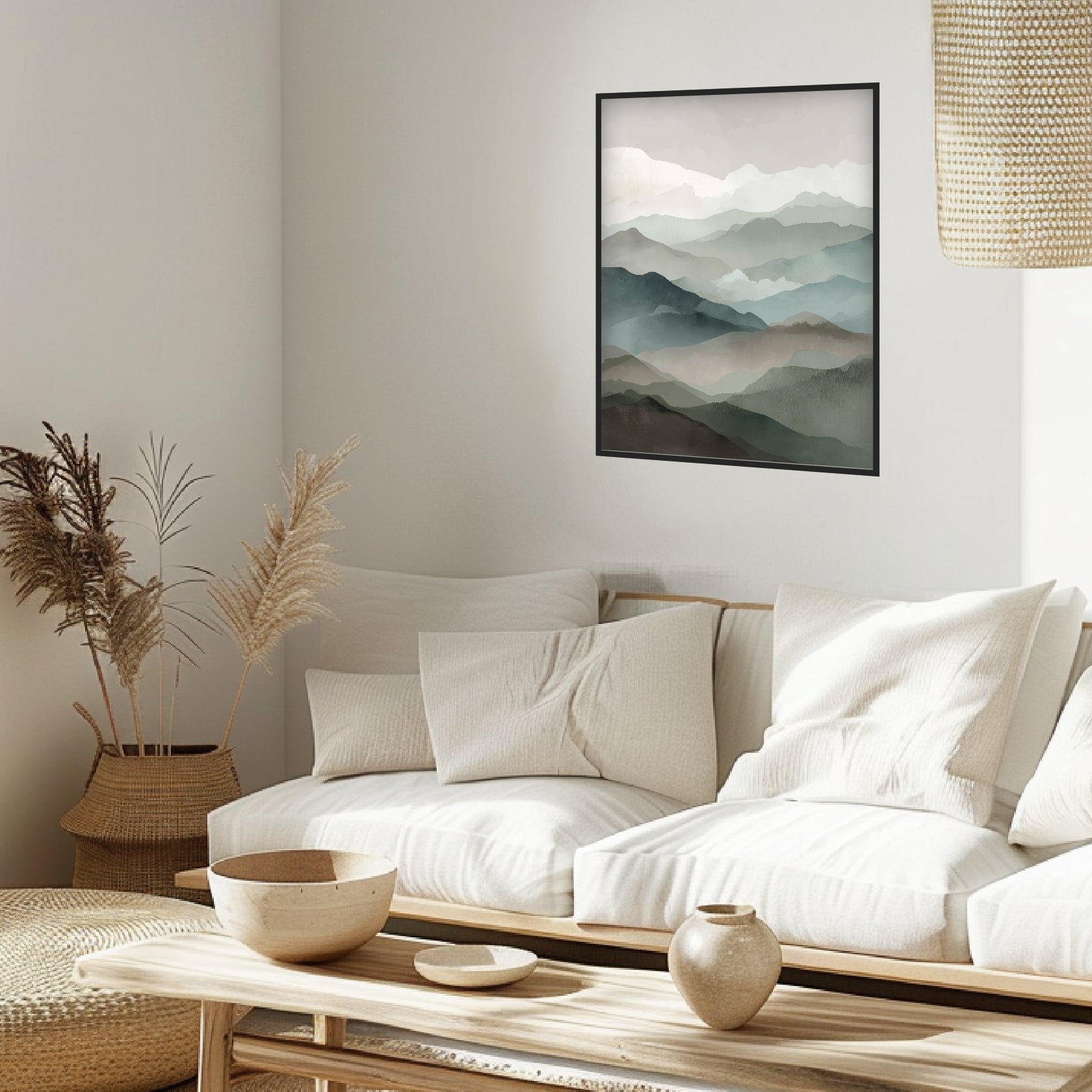 Die weichen Schichten der Berge verschmelzen zu einem ruhigen Panorama, das von feinem Licht getragen wird. Jede Ebene wirkt wie ein sanfter Übergang zwischen Nähe und Ferne und lässt eine natürliche Tiefe entstehen, die im Wohnzimmer besonders stimmig wirkt. Die Harmonien der Farben erinnern an die stille Schönheit des Japandi Style, während subtile Anklänge an Japanische Kunst die Komposition erden. Dieses Japandi Poster vermittelt eine ruhige Offenheit, die durch das reduzierte Japandi Design noch deutlicher hervortritt.