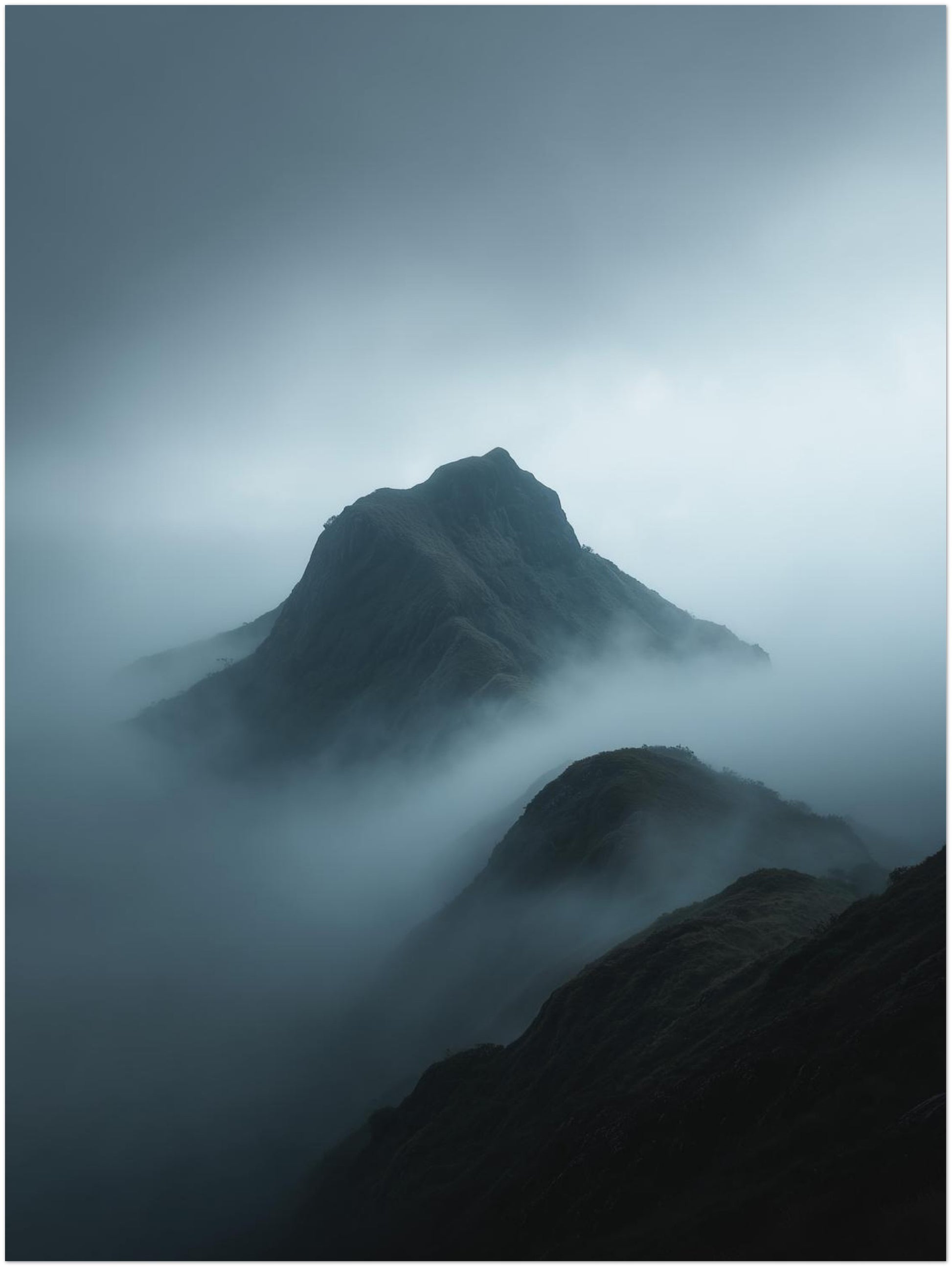 Der Blick richtet sich auf einen einzelnen Bergkamm, der sich aus dichten Nebelschichten erhebt. Die umliegenden Formen bleiben angedeutet, fast verborgen, während der Himmel weich und weit darüber liegt. Das Poster übersetzt diese Stimmung in eine klare, ruhige Bildfläche. Die reduzierte Farbpalette unterstützt die meditative Wirkung und lässt die Landschaft offen erscheinen. Besonders im Wohnzimmer oder im Flur fügt sich das Motiv harmonisch ein und schafft Abstand zum Alltag. Die Szene wirkt still und geordnet, getragen von Weite und Zurückhaltung.