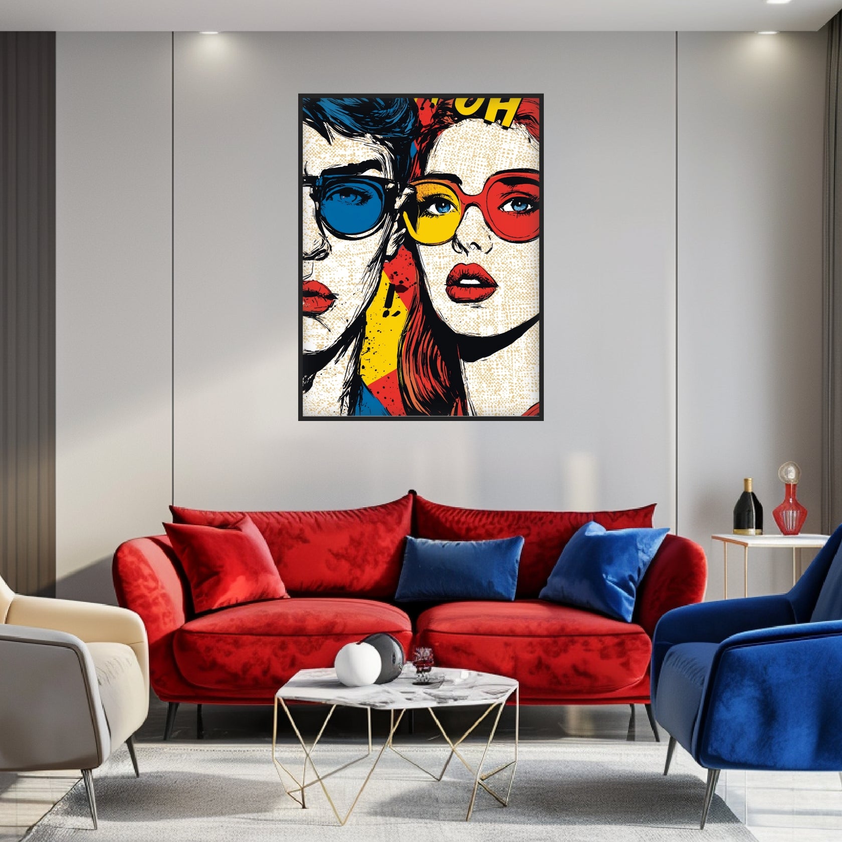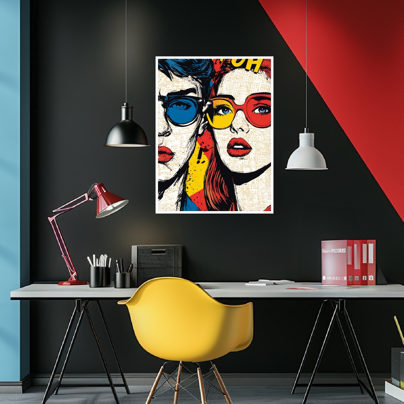 Ein Bild voller Rhythmus: Zwei Gesichter, eng nebeneinander, verbunden durch starke Linien und eine intensive Farbdramaturgie aus Blau, Rot und Gelb. Die Sonnenbrillen wirken wie visuelle Statements, die den Blick lenken und dem Motiv eine moderne Coolness verleihen. Der körnige Hintergrund verstärkt den Retro-Comic-Charakter, während die dynamische Komposition ein Gefühl von Energie und Nähe erzeugt. In Wohnzimmer oder Flur wird dieses Poster zum rebellisch-eleganten Hingucker. Als Pop Art Poster verkörpert es die Essenz von Popular Art, farbstarken Pop Art Motive und einem unverkennbaren Popart Stil.