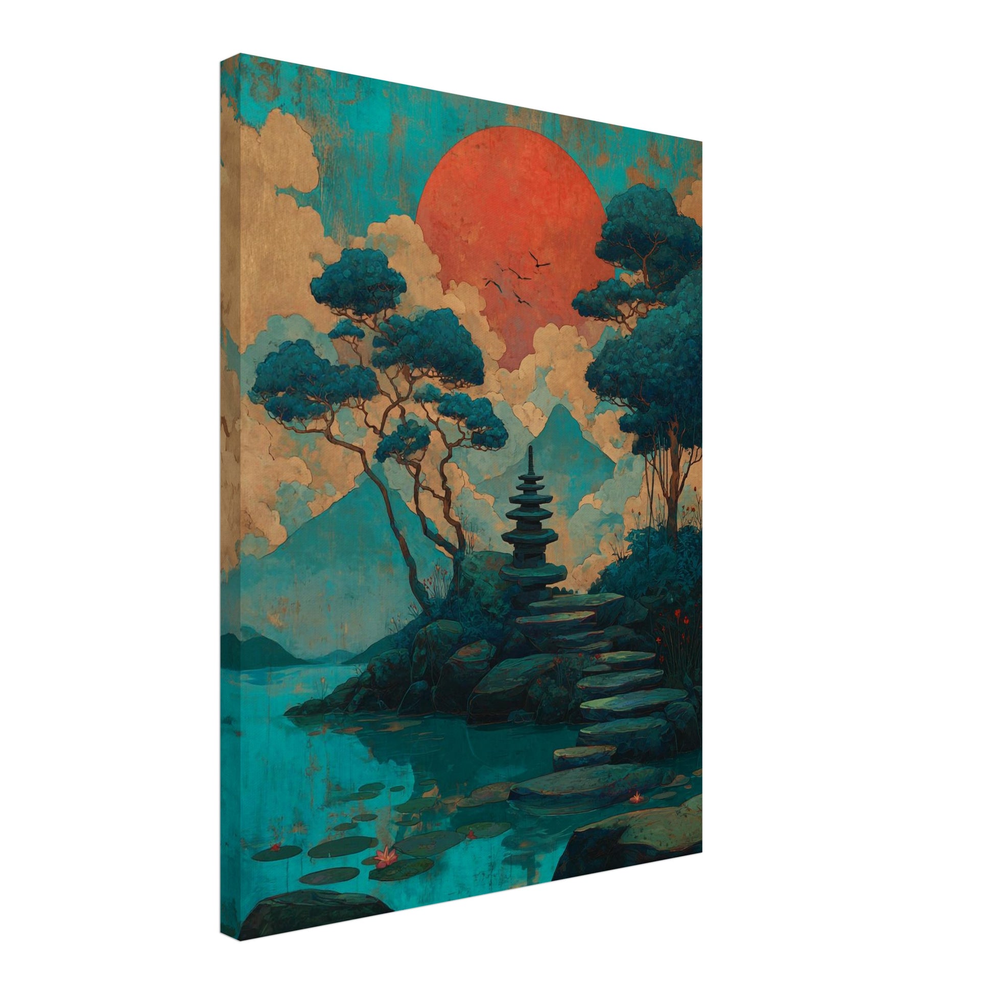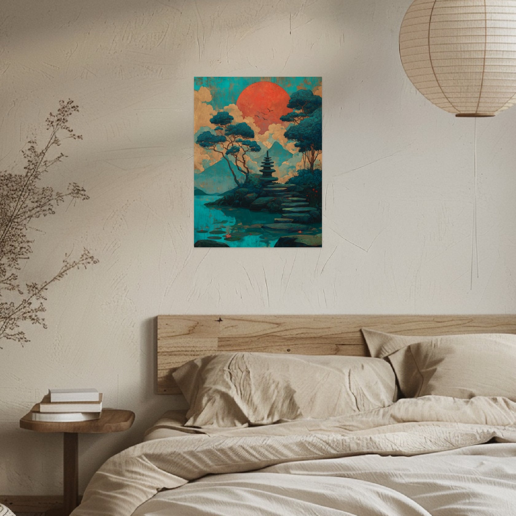Feine Farbübergänge und eine ruhige Komposition formen das Bild einer Pagode, die inmitten einer weiten, sanft leuchtenden Landschaft ruht. Der See reflektiert die Stimmung des Himmels, wodurch eine tiefe, ausgewogene Atmosphäre entsteht, die besonders im Flur oder Wohnzimmer eine meditative Präsenz entfaltet. Die Gestaltung folgt den Prinzipien des Japandi Stils, in denen Schlichtheit und Wärme eine natürliche Einheit bilden. Eingebettet in ein zurückhaltendes Japandi Interior, erscheint das Motiv als Japandi Bild in stiller Harmonie. Als Japandi Wandbild verleiht es dem Raum Ruhe und eine beständige, klare Ausdruckskraft.