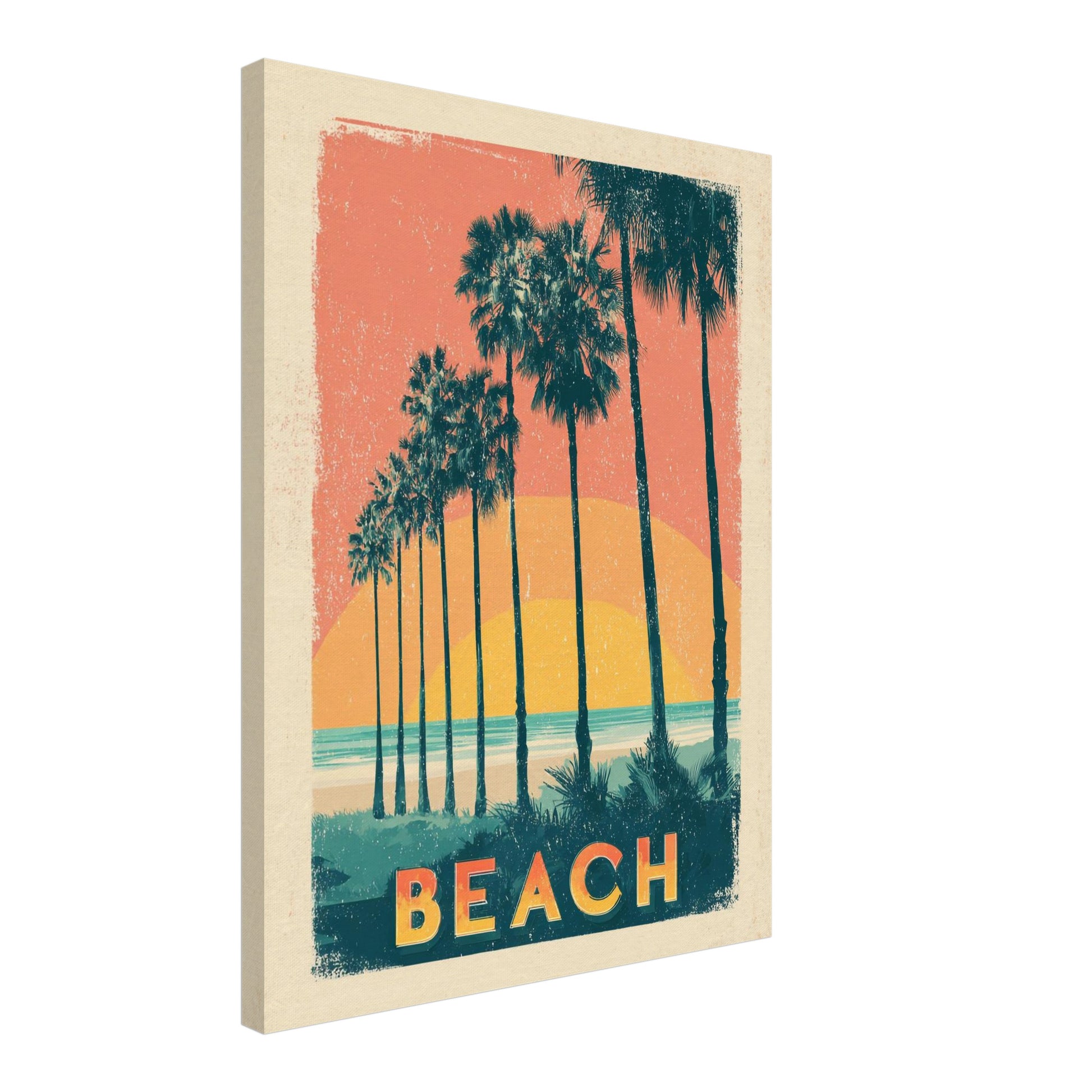 Auf Leinwand entfaltet dieses Motiv eine weiche, fast meditative Raumwirkung: Hohe Palmen ragen vor einem warmen, pastellfarbenen Horizont in den Himmel, während das Meer ruhig und klar im Hintergrund liegt. Die Textur wirkt angenehm gealtert und erinnert an analoge Reiseposter vergangener Jahrzehnte. Der großflächige Sonnenbogen taucht das Bild in ein sanftes, goldenes Licht, das Räumen eine ruhige und zugleich lebendige Atmosphäre schenkt. Die fein abgestimmten Farben und die organische Linienführung der Palmen machen das Werk zu einem harmonischen Blickfang. Perfekt für Liebhaber von Moderne Vintage Bilder und Leinwandbilder Vintage.
