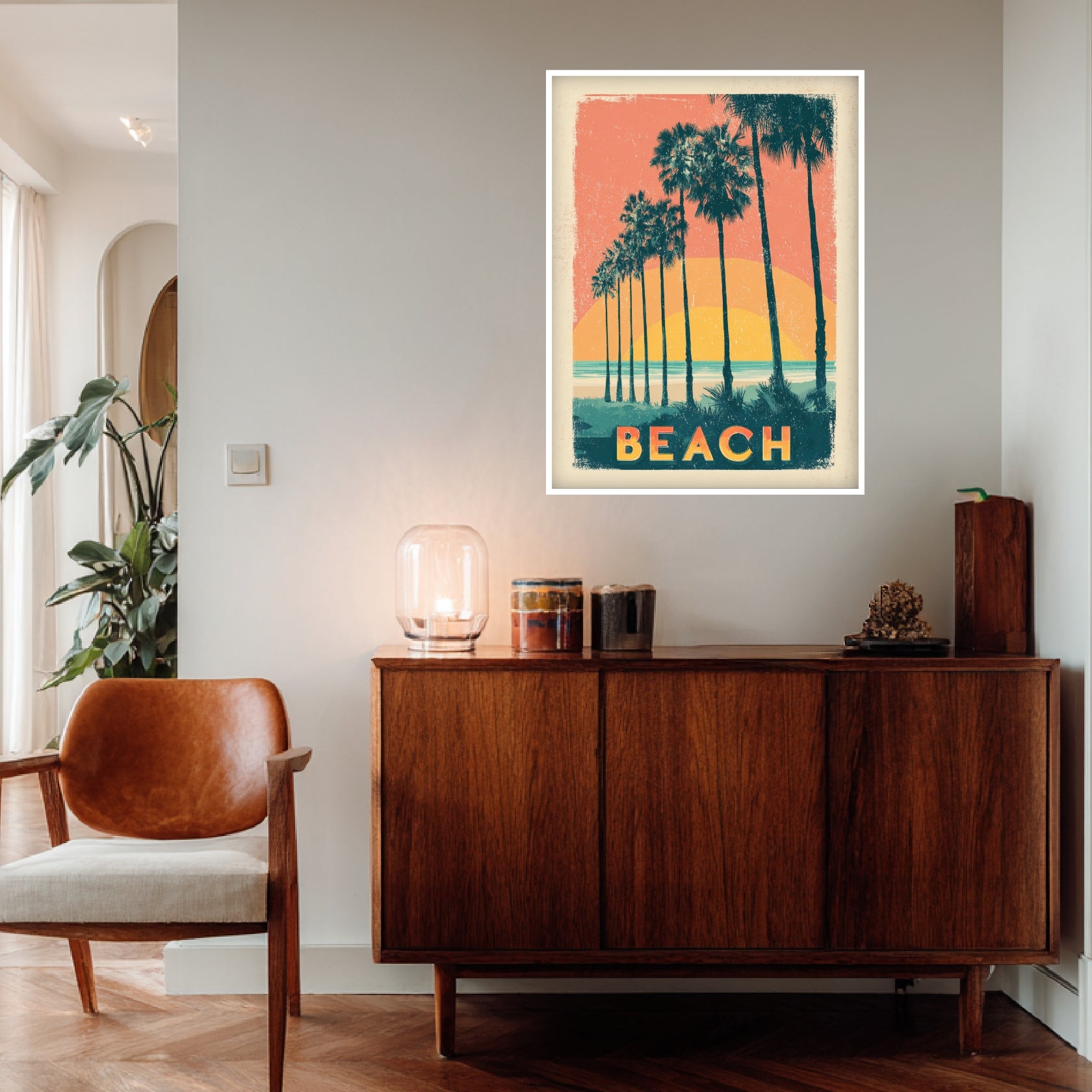 Das Poster zeigt eine eindrucksvolle Reihe schlanker Palmen, die sich wie eine stille Silhouette vor dem warmen Abendhimmel abzeichnen. Der Hintergrund leuchtet in sanften Rosa- und Orangetönen, die sich weich überlagern und an verblasste Sommeraufnahmen erinnern. Der große Sonnenbogen über dem kühl schimmernden Meer schafft eine ruhige, ausgewogene Komposition, während die feine Körnung und dezente Gebrauchsspuren eine authentische Patina hinzufügen. Die Pflanzen im Vordergrund bringen eine zusätzliche Tiefe ins Bild, sodass es sich harmonisch in Wohn-, Schlaf- oder Arbeitsräume einfügt. Ideal für Liebhaber von Vintage Poster und Wand Poster Vintage.