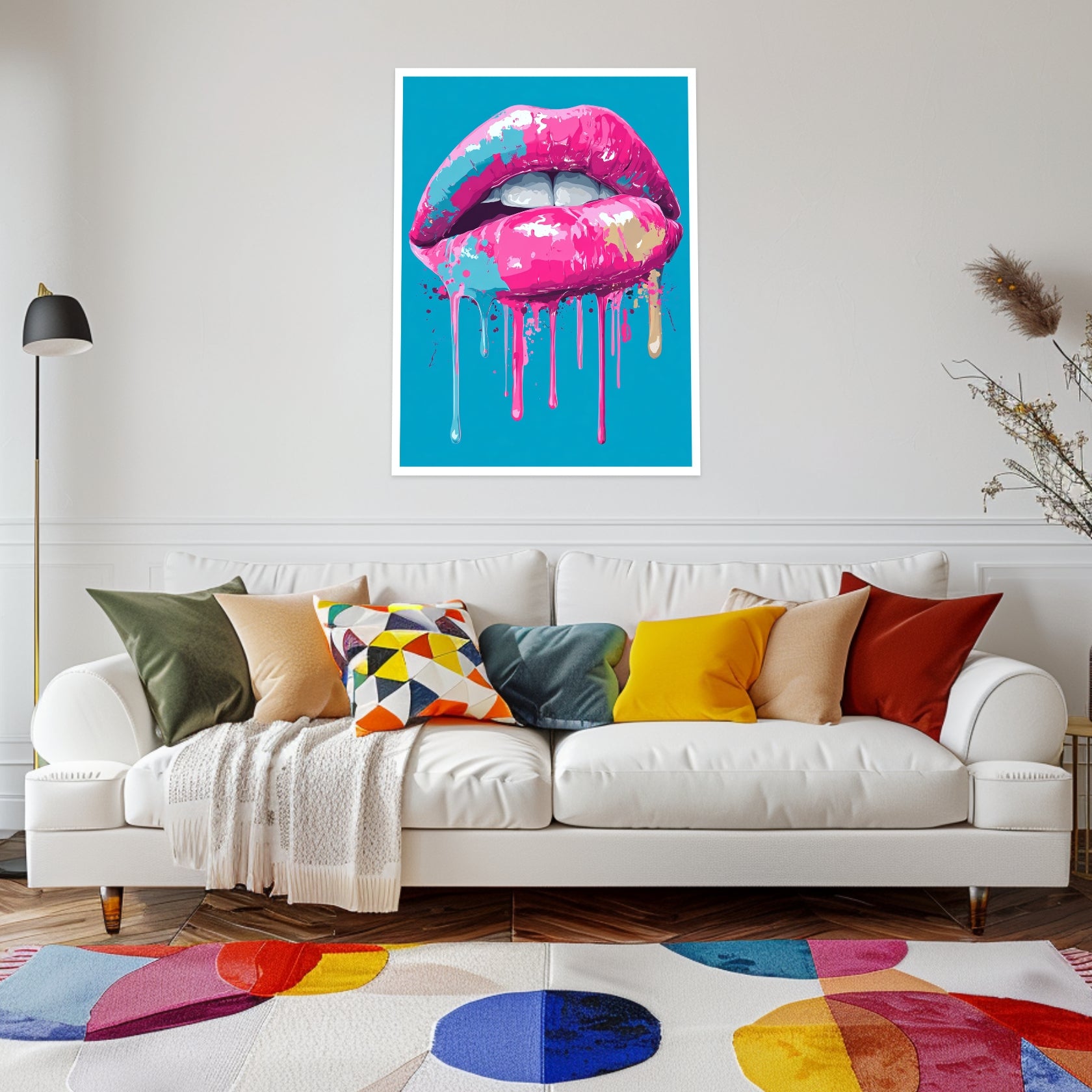 Ein Statement in Farbe – das Pop Art Poster „Pinkfarbene Lippen mit Farbe“ bringt pure Sinnlichkeit in leuchtenden Kontrasten auf die Wand. Die üppigen, glänzenden Lippen in Pink wirken fast greifbar, während fließende Farbspuren in Blau und Gold das Motiv lebendig machen. Jeder Tropfen erzählt von Bewegung, Ausdruck und Popkultur. Dieses Popular Art-Werk spielt mit Glamour, Provokation und künstlerischem Witz – perfekt für Wohnzimmer oder Studio. Ein Pop Art Motiv, das den Popart Stil in seiner frechsten Form feiert.