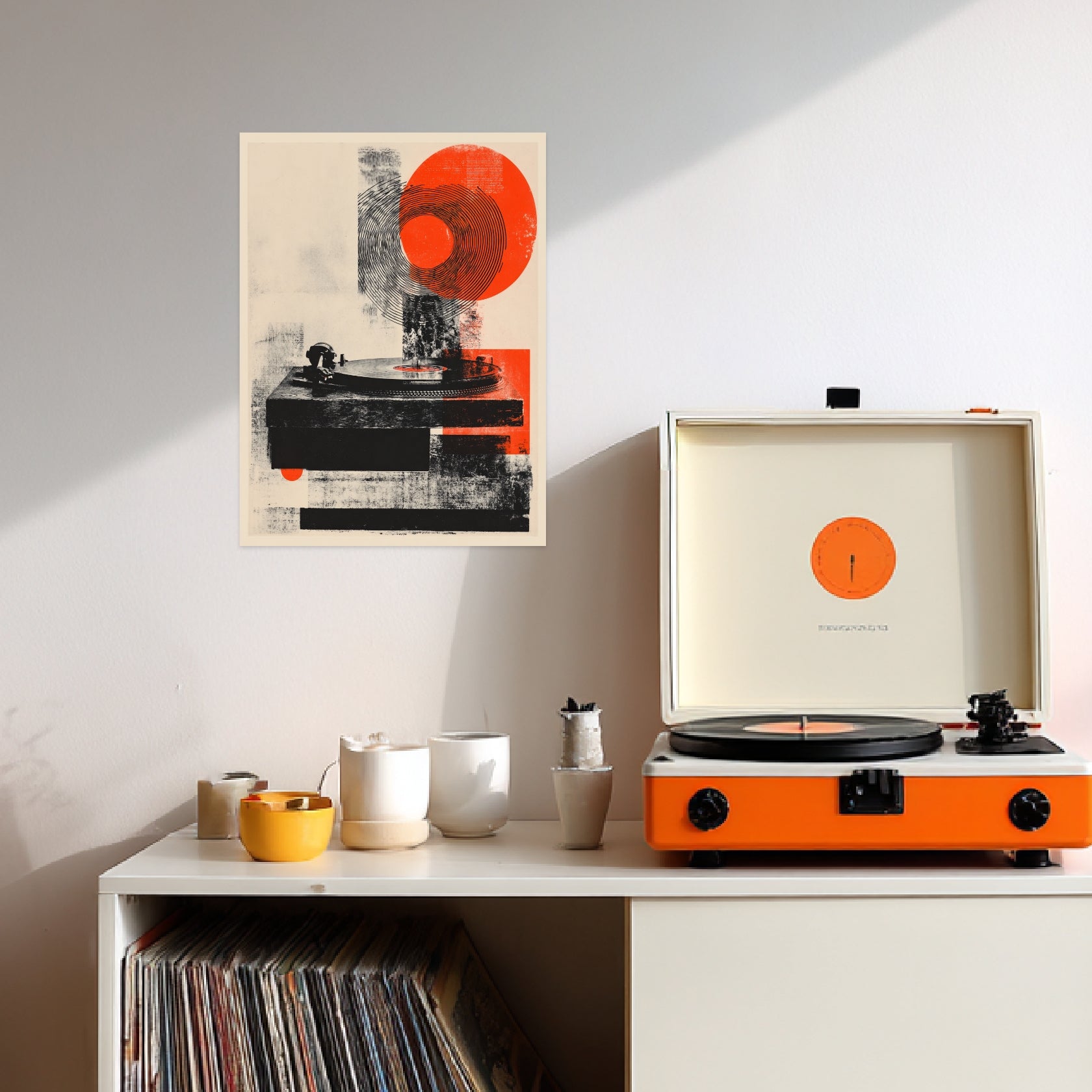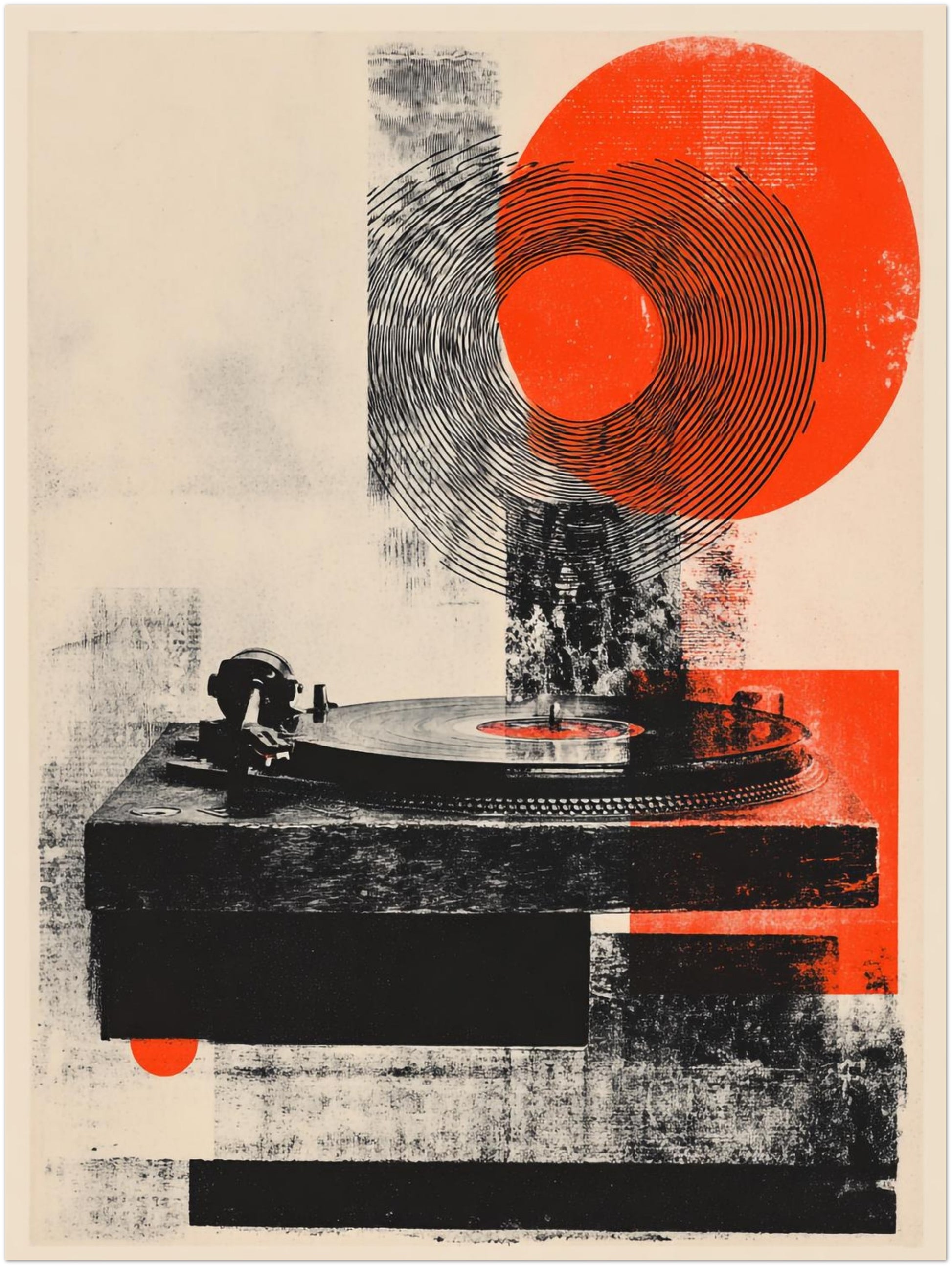 Das Motiv zeigt einen Plattenspieler in dunklen, strukturierten Tönen, während darüber große Kreisformen in Schwarz und warmem Rot eine grafische Spannung erzeugen. Die kreisförmigen Linien wirken wie konzentrische Schallwellen und bilden einen ruhigen Rhythmus, der den analogen Charakter verstärkt. Die Textur des Hintergrunds verleiht dem Bild eine weiche Körnung, die an klassische Druckverfahren erinnert. Die Kombination aus klaren Formen, gedeckten Farben und warmen Akzenten macht das Motiv zu einem ruhigen, strukturierten Wandbild – ideal für alle, die Retro Poster oder Retro Stil suchen.