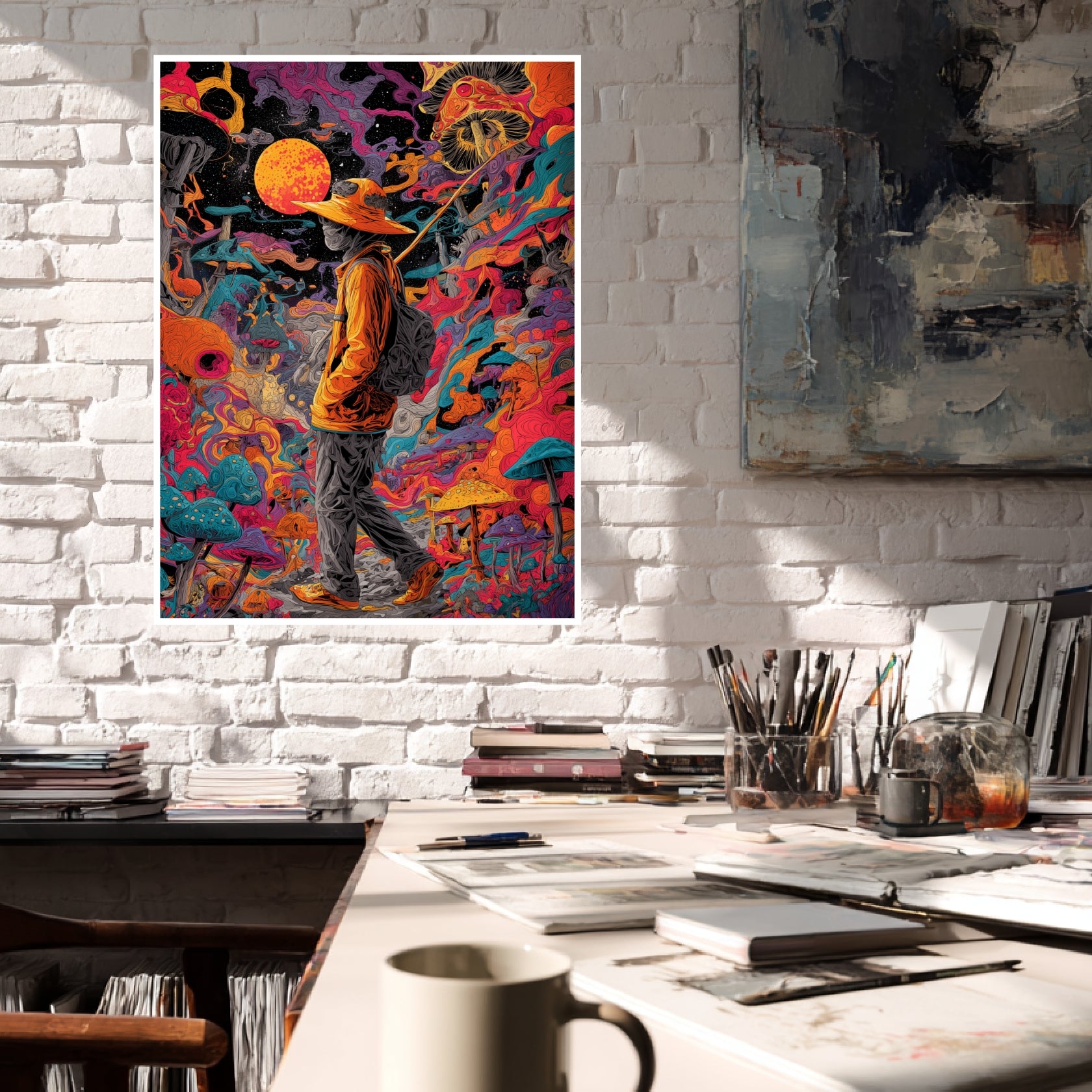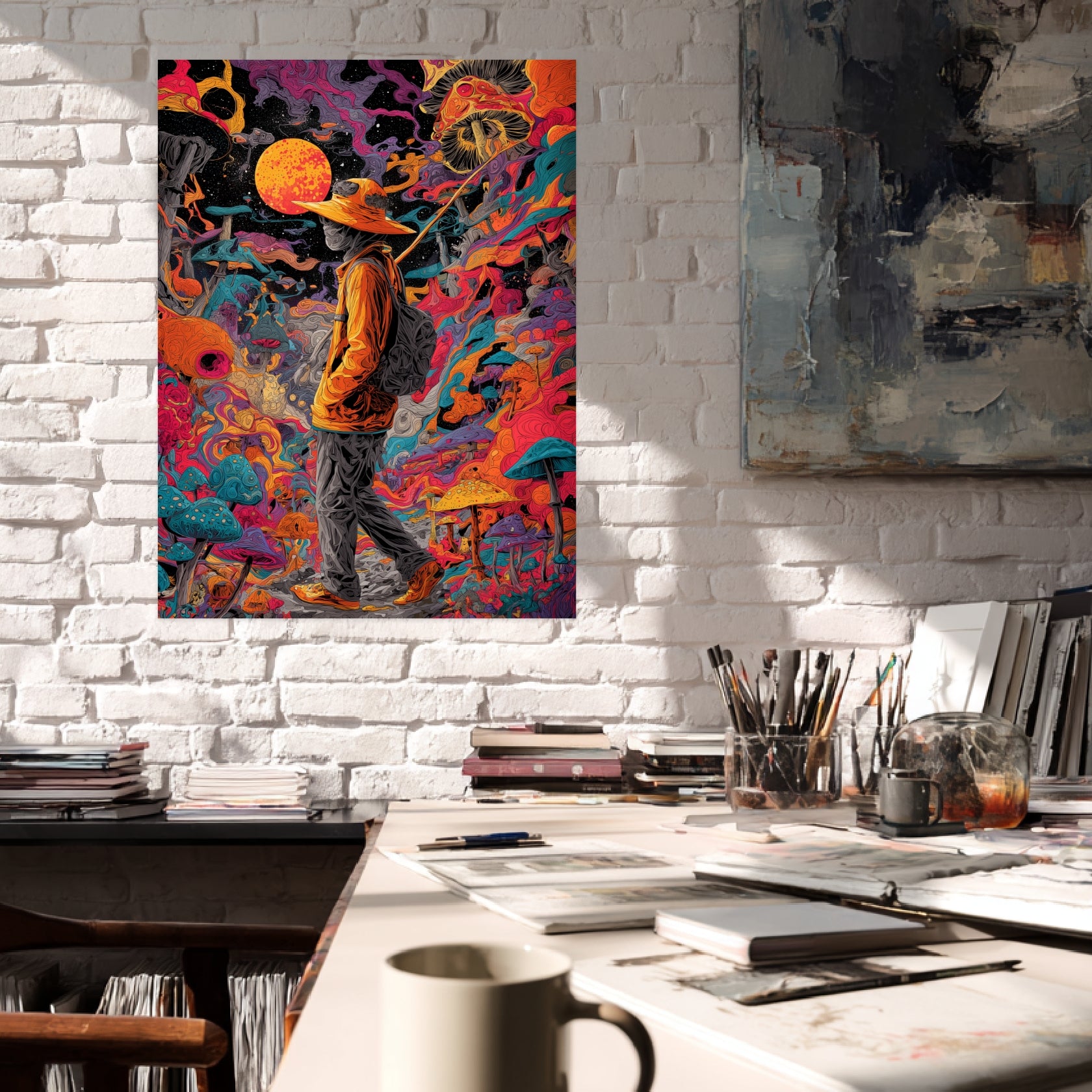 Wie ein pulsierender Farbteppich breitet sich die surreal gestaltete Landschaft aus, in der der Wanderer seinen Weg durch wogende Pilzformen und leuchtende Strömungen bahnt. Die kräftigen Orange-, Blau- und Violetttöne scheinen ineinander zu fließen und erzeugen einen fast musikalischen Rhythmus, der das Motiv lebendig pulsieren lässt. Der glühende Himmelskörper im Hintergrund verstärkt die räumliche Tiefe und sorgt für eine atmosphärische Spannung, die im Wohnzimmer besonders gut zur Geltung kommt. Die Verbindung aus Psychedelic Farbwelten, fantasievollen Details und energetischer Komposition formt ein intensives Psychedelic Art Poster, das den Psychedelic Style mit abenteuerlichem Ausdruck erfüllt.