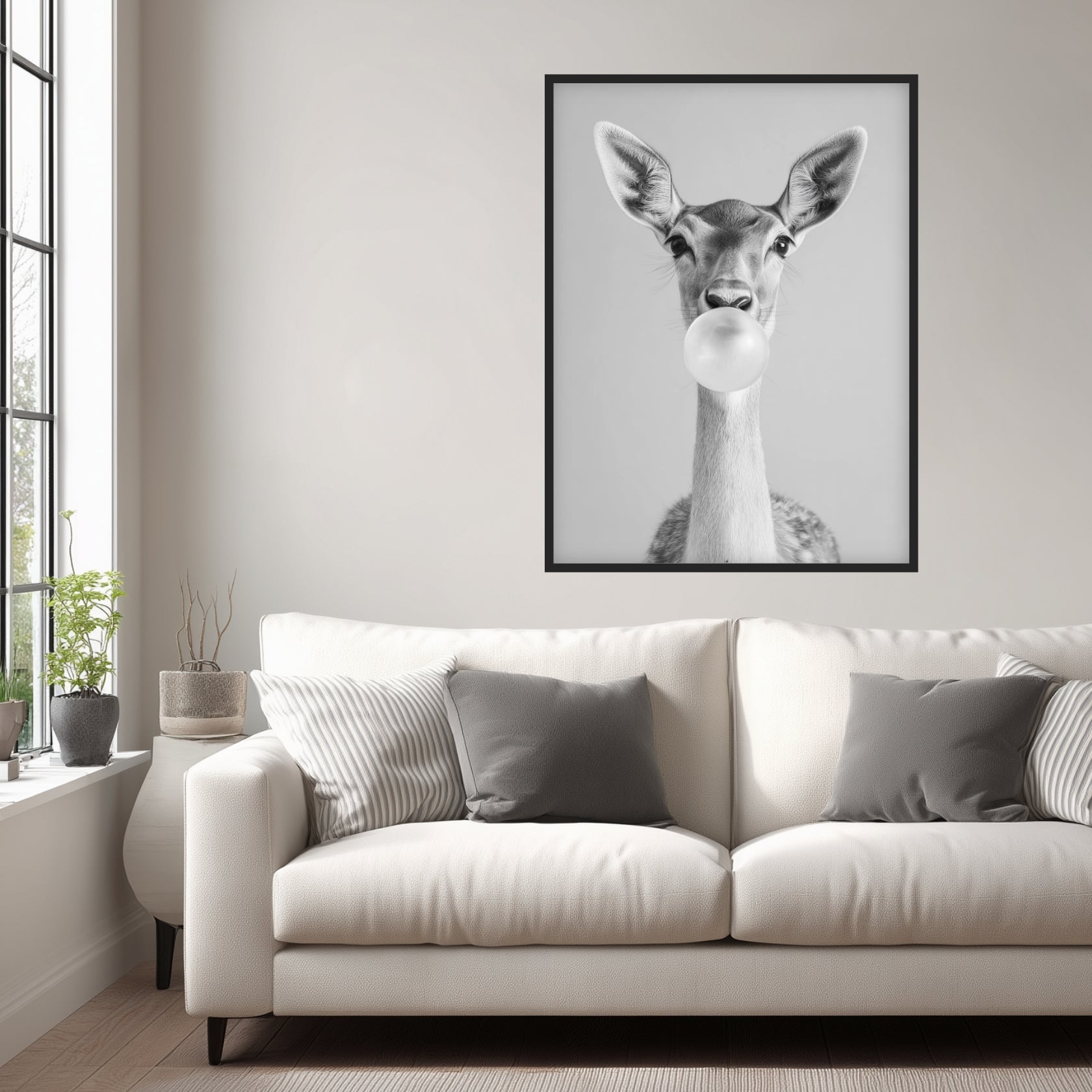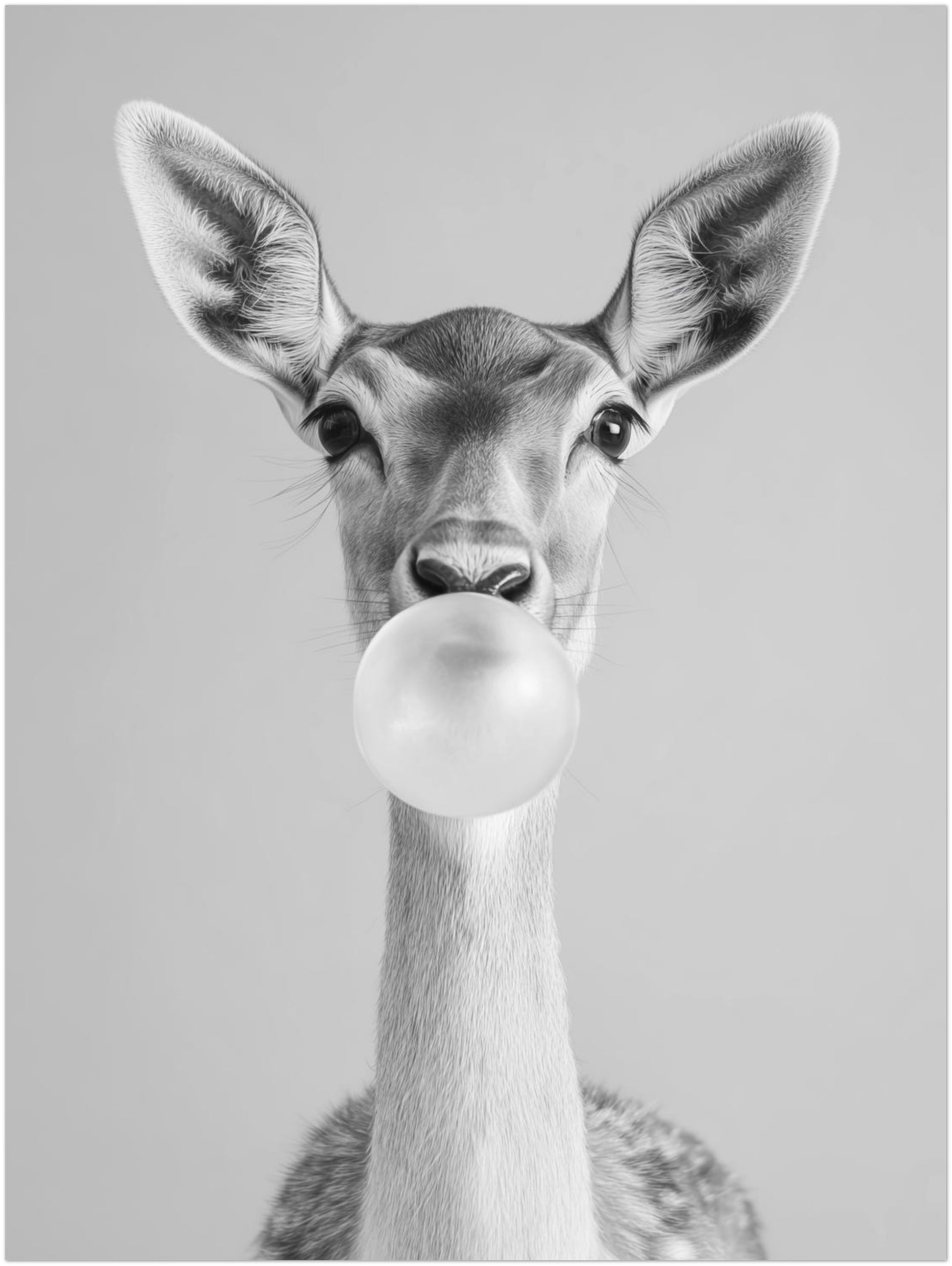 Die Komposition lebt von Symmetrie und Stille. Das Reh mit Kaugummi Poster zeigt ein Reh in ruhiger Frontalansicht, eingebettet in eine helle, nahezu schwerelose Fläche. Feine Grautöne modellieren Fell, Augen und Ohren mit großer Präzision. Als Schwarz Weiß Poster entfaltet das Motiv eine klare, fast meditative Wirkung. Der Kaugummi bildet einen sanften Kontrast zur natürlichen Anmut des Tieres. Im Wohnzimmer oder im Flur wirkt das Bild ruhig, modern und bewusst zurückgenommen.