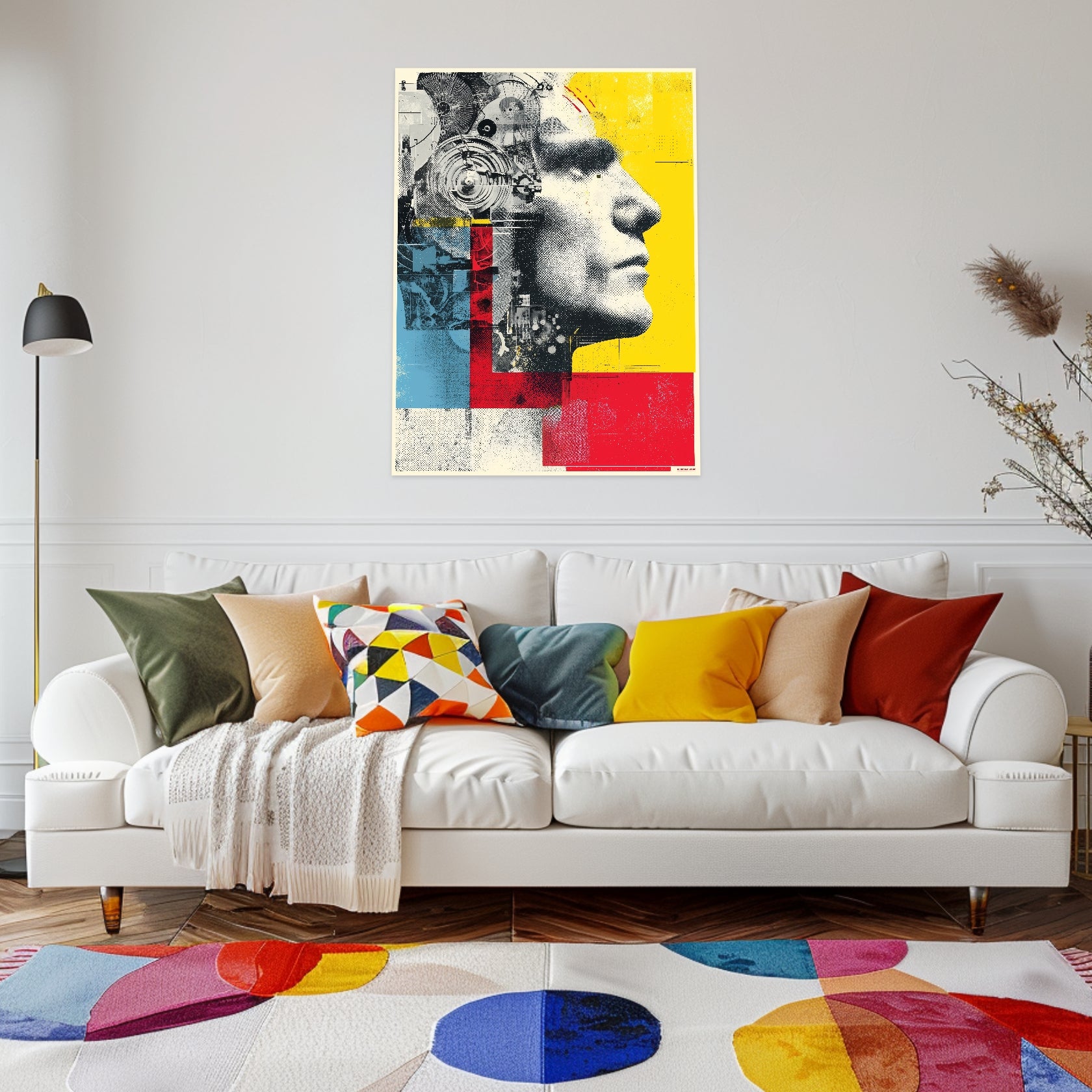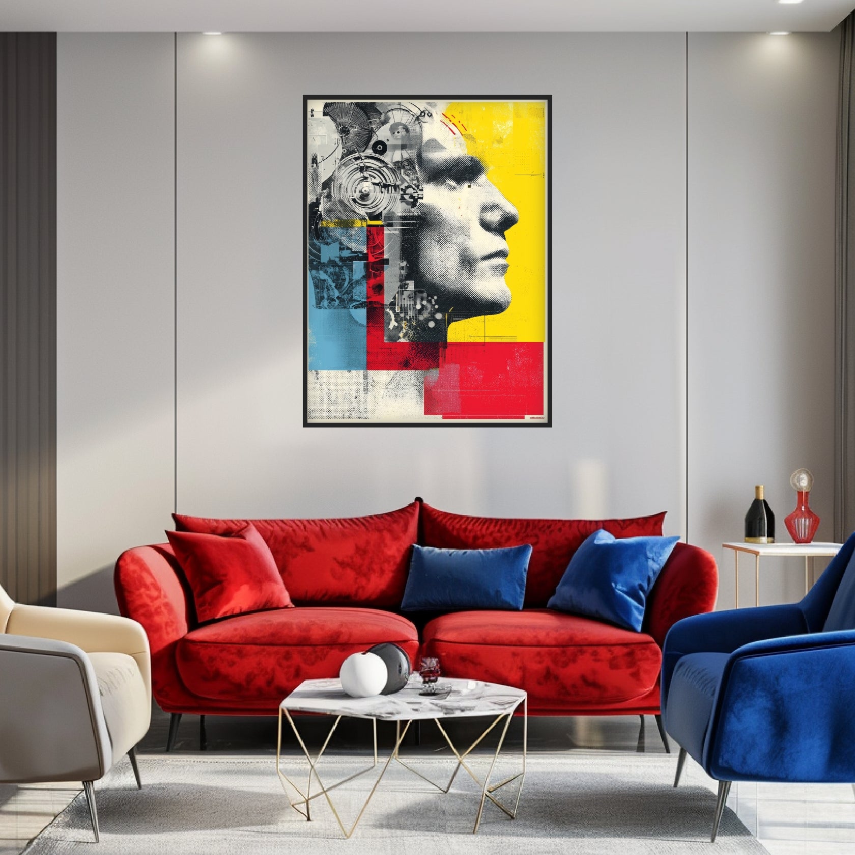 Technik wird Gesicht, Mensch wird Struktur. Die Roboter Mensch Fusion zeigt ein Profil, das biologische Formen mit mechanischen Elementen vereint. Zahnräder, Flächen und Raster treffen auf menschliche Züge und erzeugen eine dichte visuelle Spannung im Geist der Popular Art. Als Pop Art Poster entfaltet das Motiv eine starke konzeptionelle Tiefe. Die komplexen Pop Art Motive erinnern an digitale Kultur und industrielle Ästhetik. Der selbstbewusste Popart Stil macht dieses Poster ideal für Wohnzimmer oder Arbeitsräume mit modernem Anspruch.