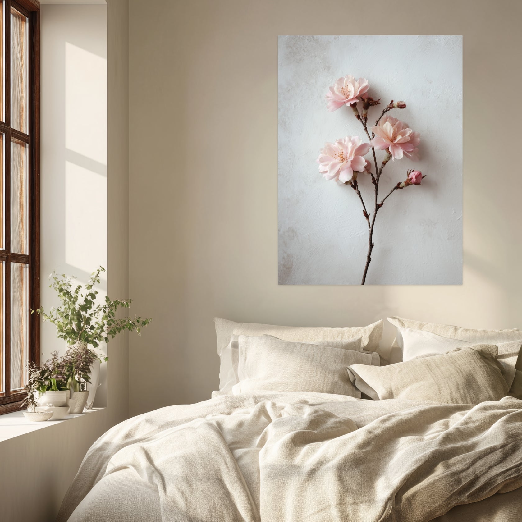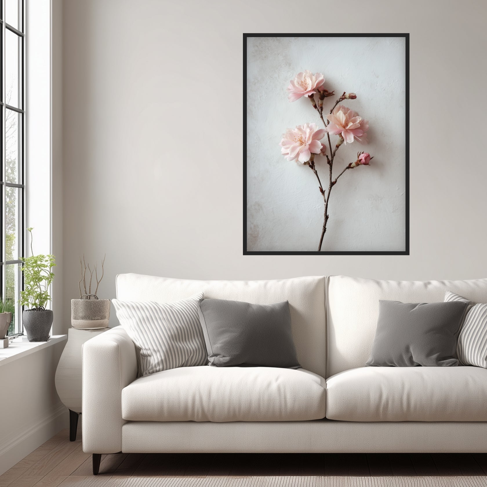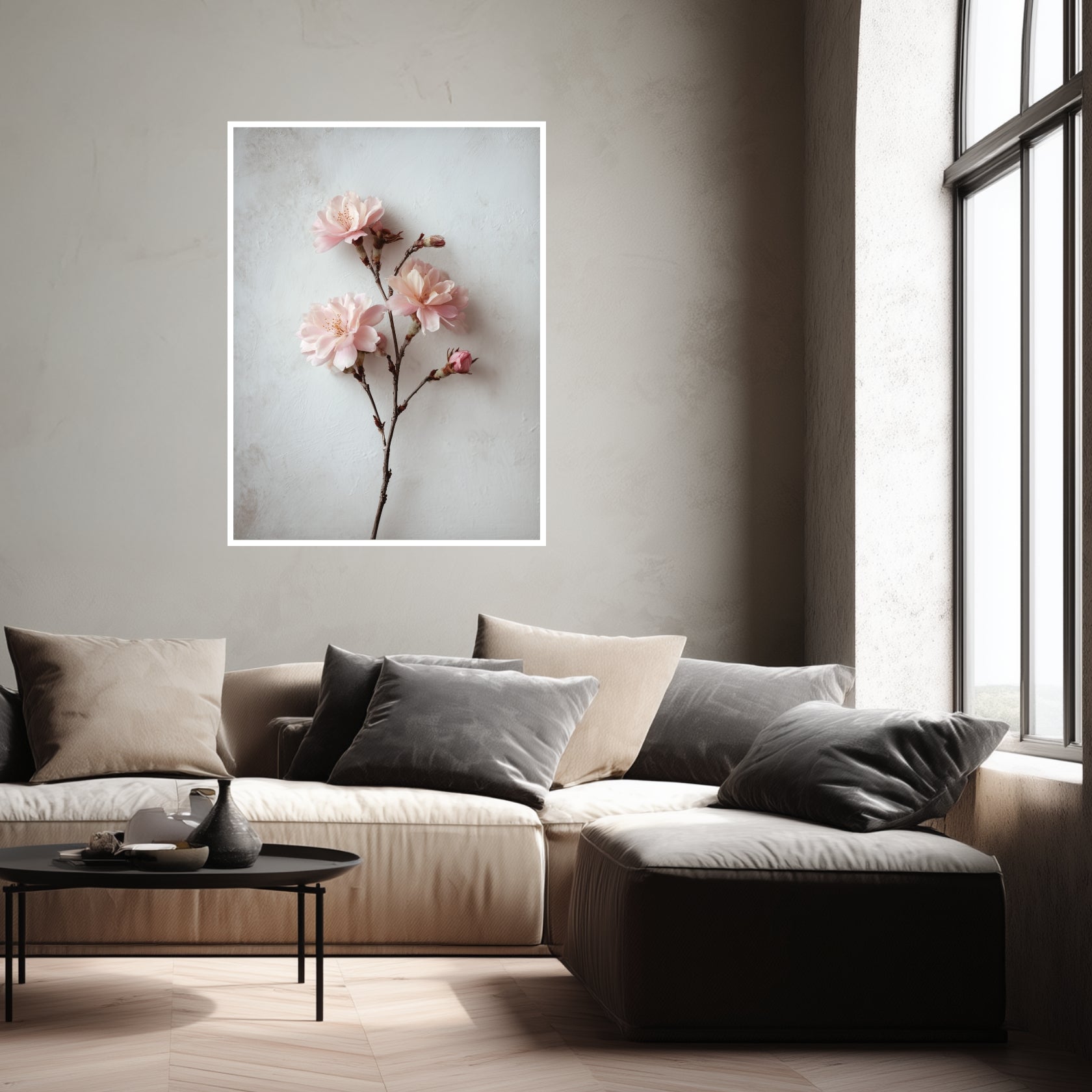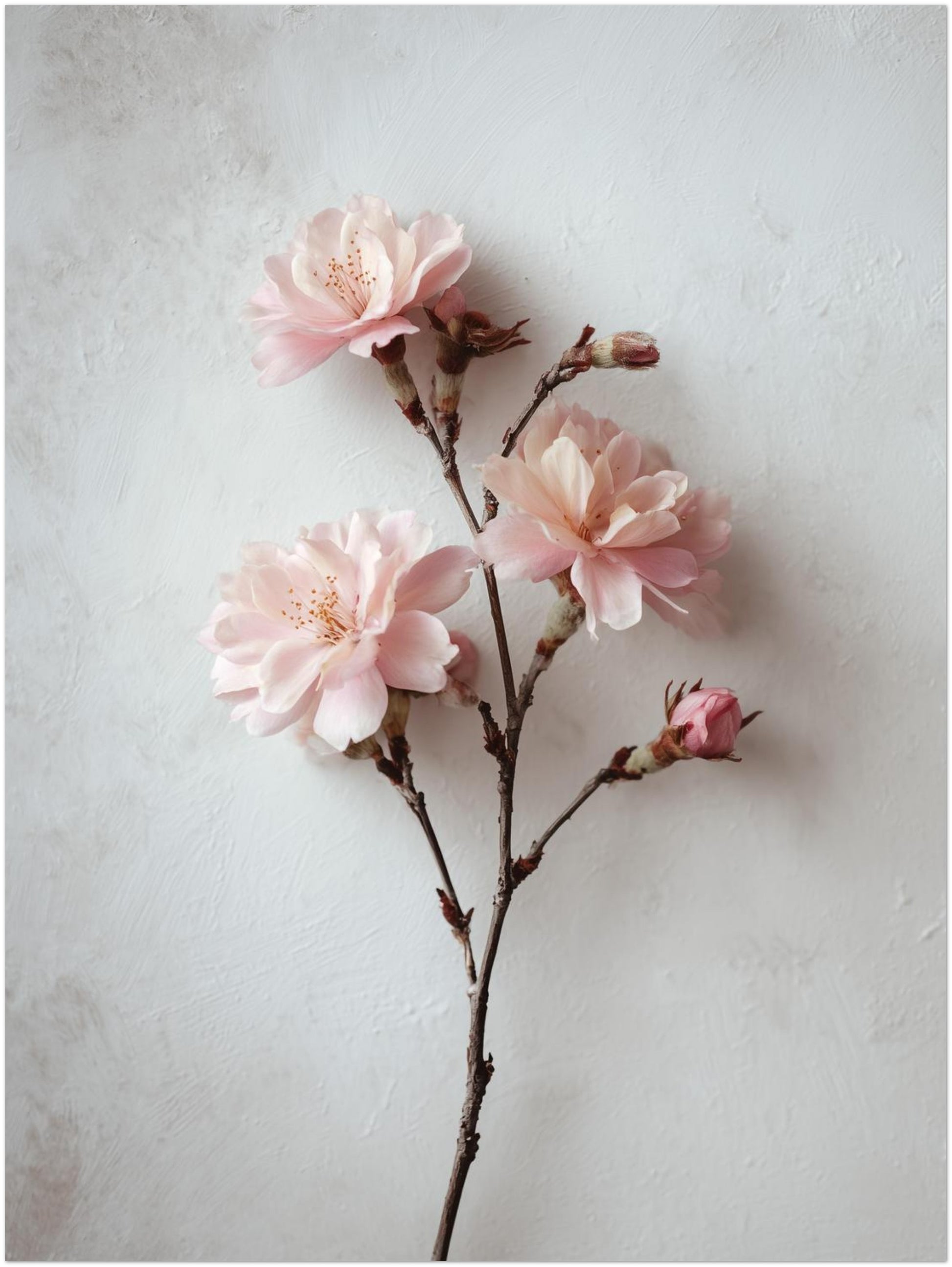 Der Blick folgt einem schlanken Zweig, der sich ruhig über eine helle Fläche zieht. An ihm öffnen sich mehrere rosafarbene Blüten, deren feine Blätter weich gestaffelt sind und dem Motiv eine natürliche Leichtigkeit verleihen. Das Poster bringt diese Zurückhaltung klar zur Geltung: keine harten Kontraste, keine Ablenkung, nur Form, Farbe und Raum. In einem hellen Wohnzimmer unterstützt es eine ruhige Atmosphäre, während es im Flur einen stillen, einladenden Akzent setzt. Der Rosa Blütenzweig Poster wirkt offen und leicht und lässt dem Raum Luft zum Atmen.