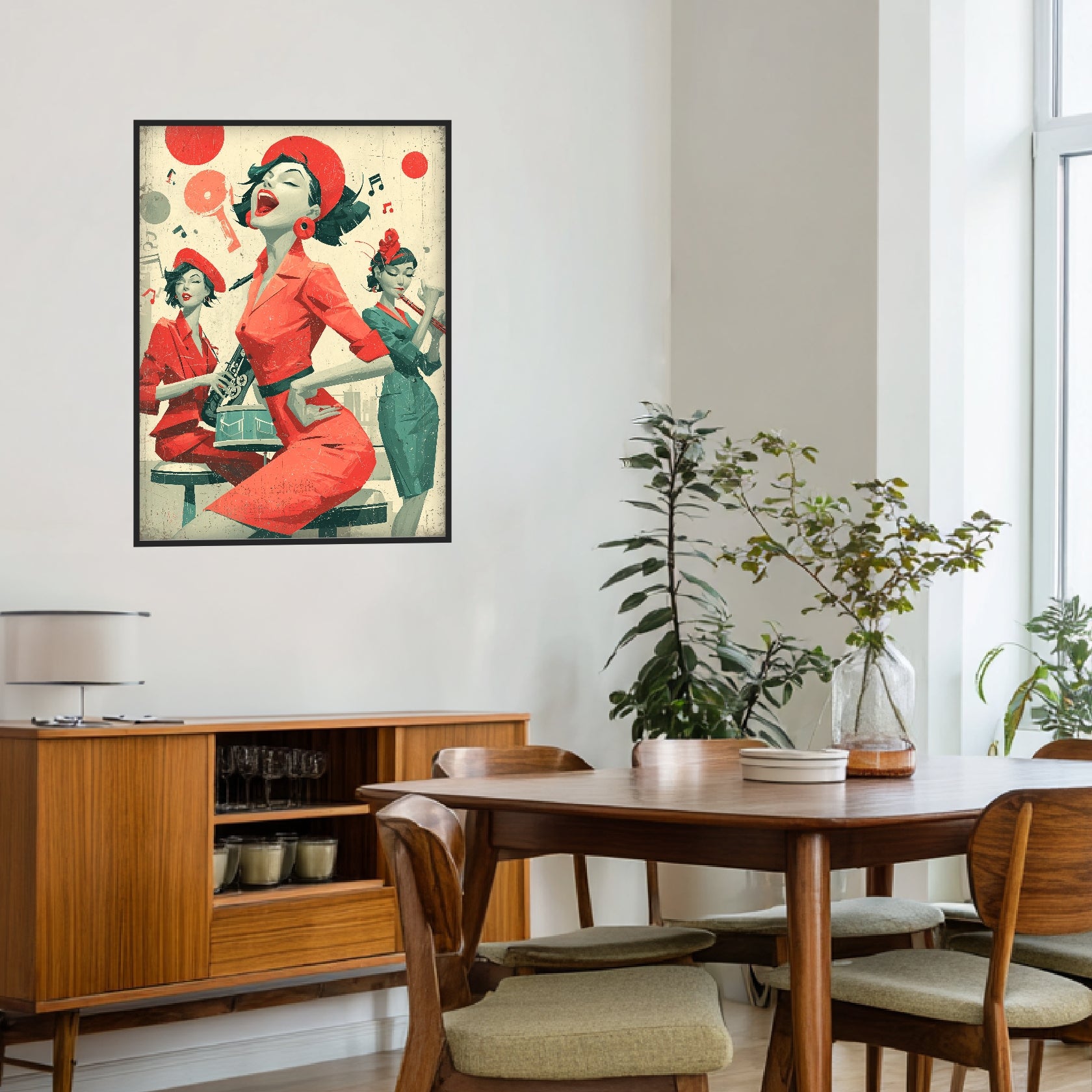 Dieses Poster zeigt drei Musikerinnen in einer dynamischen, doch ruhigen Komposition. Die Figuren sind in leuchtende Rottöne gehüllt, während kühle Grüntöne einen ausgewogenen Gegenpol schaffen. Die klaren Konturen und gezackten Flächen erinnern an klassische Drucktechniken und schenken dem Motiv eine analoge, retro-inspirierte Tiefe. Musiknoten und kreisförmige Elemente schweben im Hintergrund und verstärken das Gefühl einer lebendigen, aber geordneten Szene. Die leicht gealterte Textur des Bildes vermittelt eine subtile Vintage-Note, während die Figurengruppierung harmonisch ins Zentrum führt. In Wohnräumen entsteht dadurch ein warmes, strukturiertes Ambiente. Das Motiv eignet sich hervorragend als Retro Stil, Retro Design oder Kunstdruck Retro.