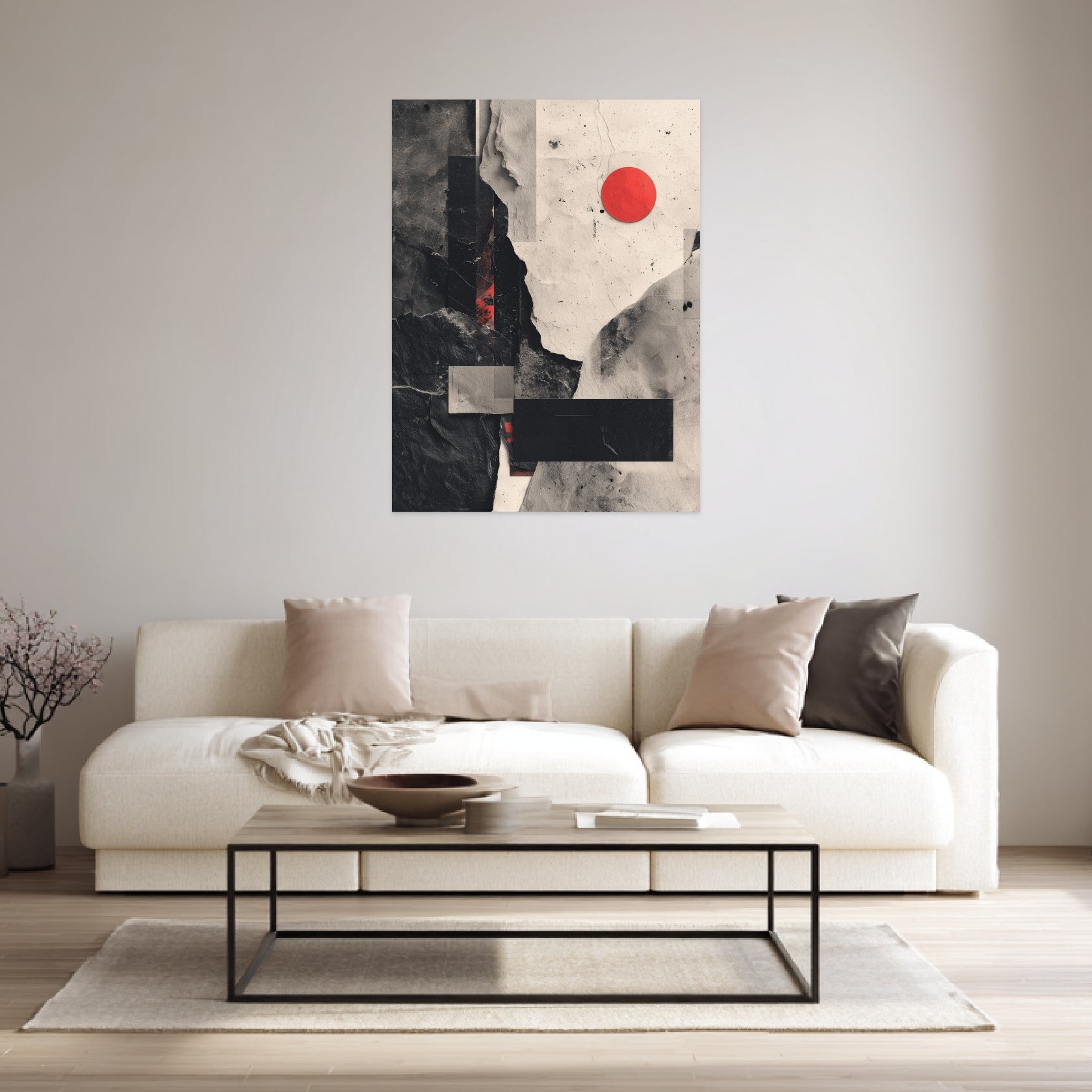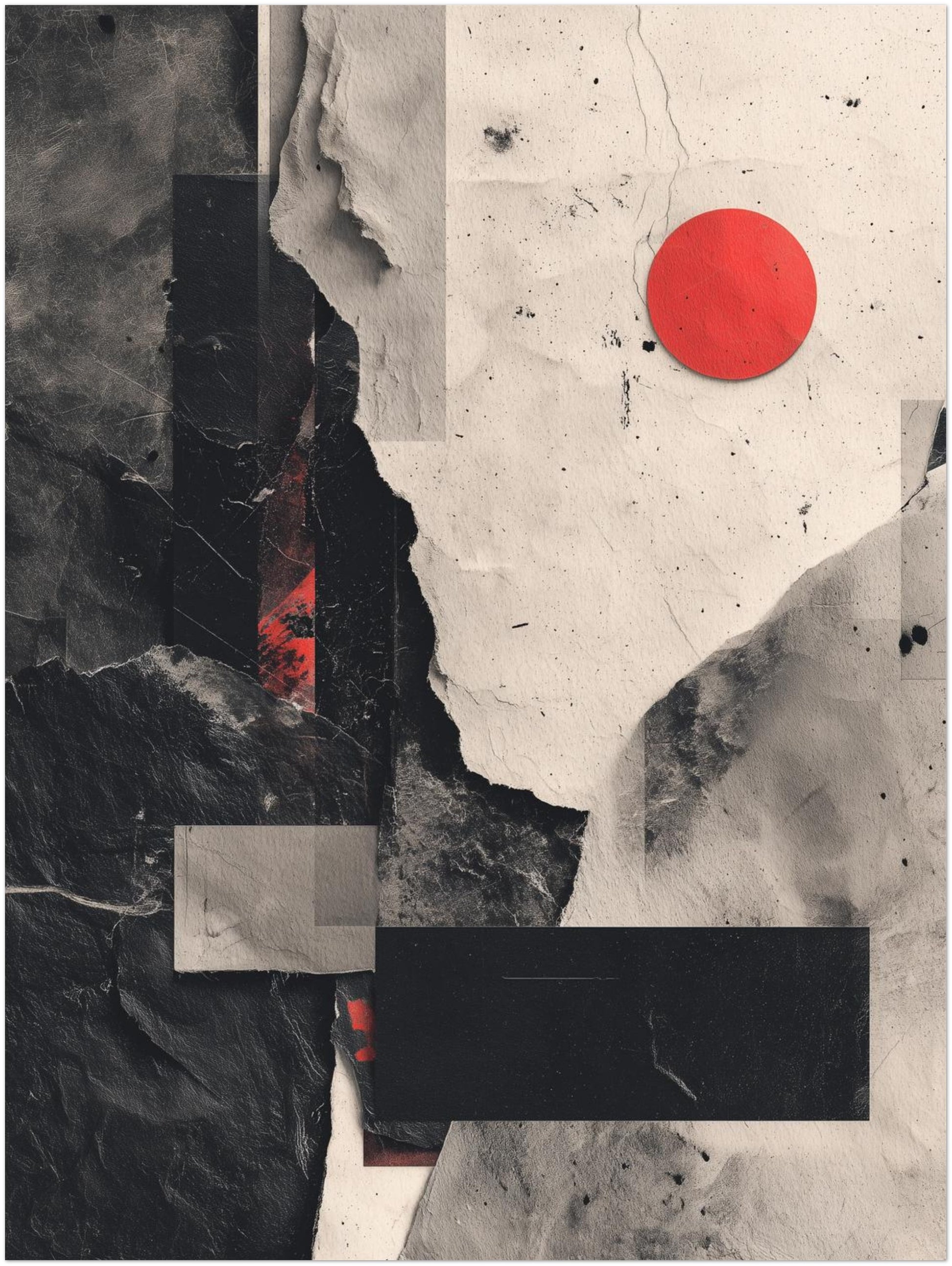 Dieses Poster entfaltet eine vielschichtige Strukturlandschaft aus ĂŒberlagerten Papier- und Steintexturen, deren Risse, Faltungen und matte FlĂ€chen eine faszinierende Tiefe erzeugen. Dunkle Segmente treffen auf helle, beinahe roh belassene Bereiche, wodurch ein spannungsvolles GefĂŒge entsteht. Zentral setzt der krĂ€ftige rote Kreis einen prĂ€zisen Kontrastpunkt, der die gesamte Komposition visuell bĂŒndelt. Die Kombination aus rauer MaterialĂ€sthetik und klarer geometrischer Ruhe verleiht dem Werk eine zeitlose IntensitĂ€t, die sowohl den charakteristischen Ausdruck moderner Abstrakte Kunst Poster als auch die zurĂŒckhaltende Eleganz stilvoller Wandbilder Abstrakt Modern trĂ€gt. Ob im Flur oder im Wohnzimmer â dieses Motiv schafft eine ruhige, zugleich markante AtmosphĂ€re.