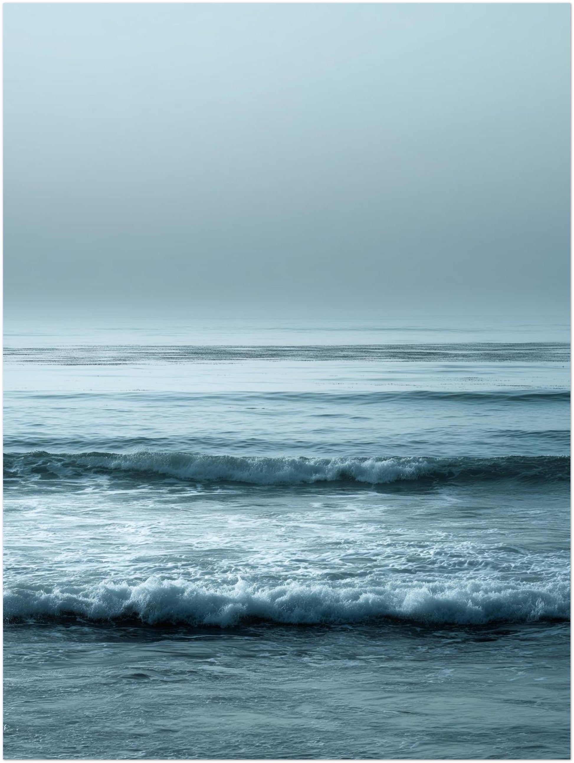 Mehrere Wellenlinien ziehen parallel über die Wasseroberfläche und erzeugen einen gleichmäßigen, ruhigen Rhythmus. Der Nebel nimmt dem Horizont seine Schärfe und lässt Meer und Himmel sanft verschmelzen. Das Poster wirkt klar und reduziert, getragen von kühlen Farbtönen und einer ausgewogenen Komposition. In einem Wohnzimmer unterstützt das Motiv eine entspannte, offene Atmosphäre und bringt visuelle Ruhe in den Raum. Auch im Flur entfaltet es seine Wirkung, da die horizontale Struktur ordnend und weitend wirkt. Die matte Oberfläche des Posters unterstreicht die stille Zurückhaltung der Szene.
