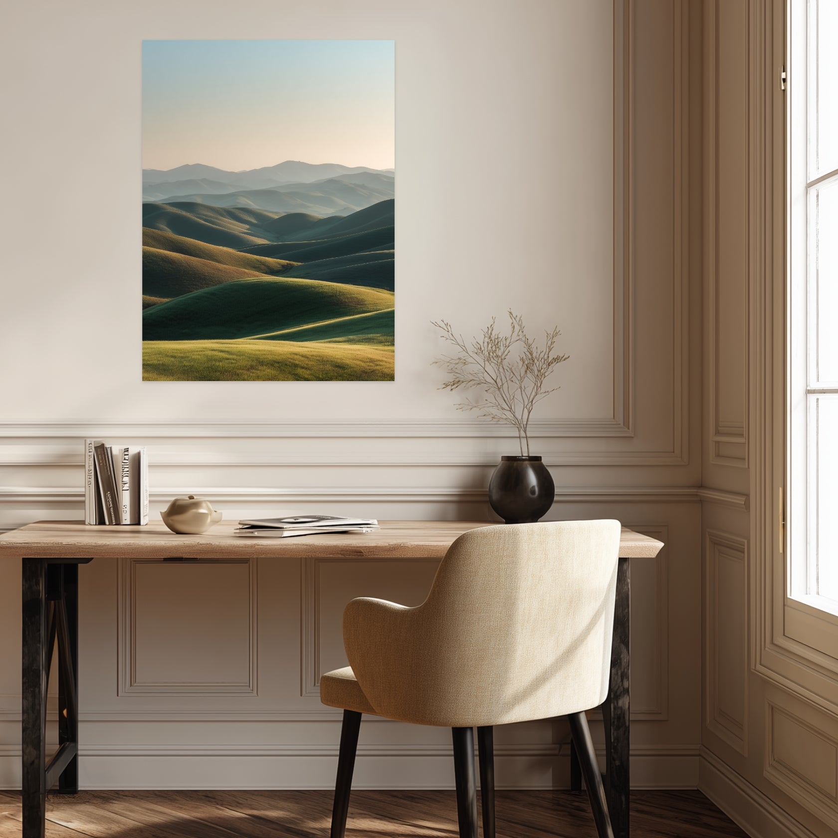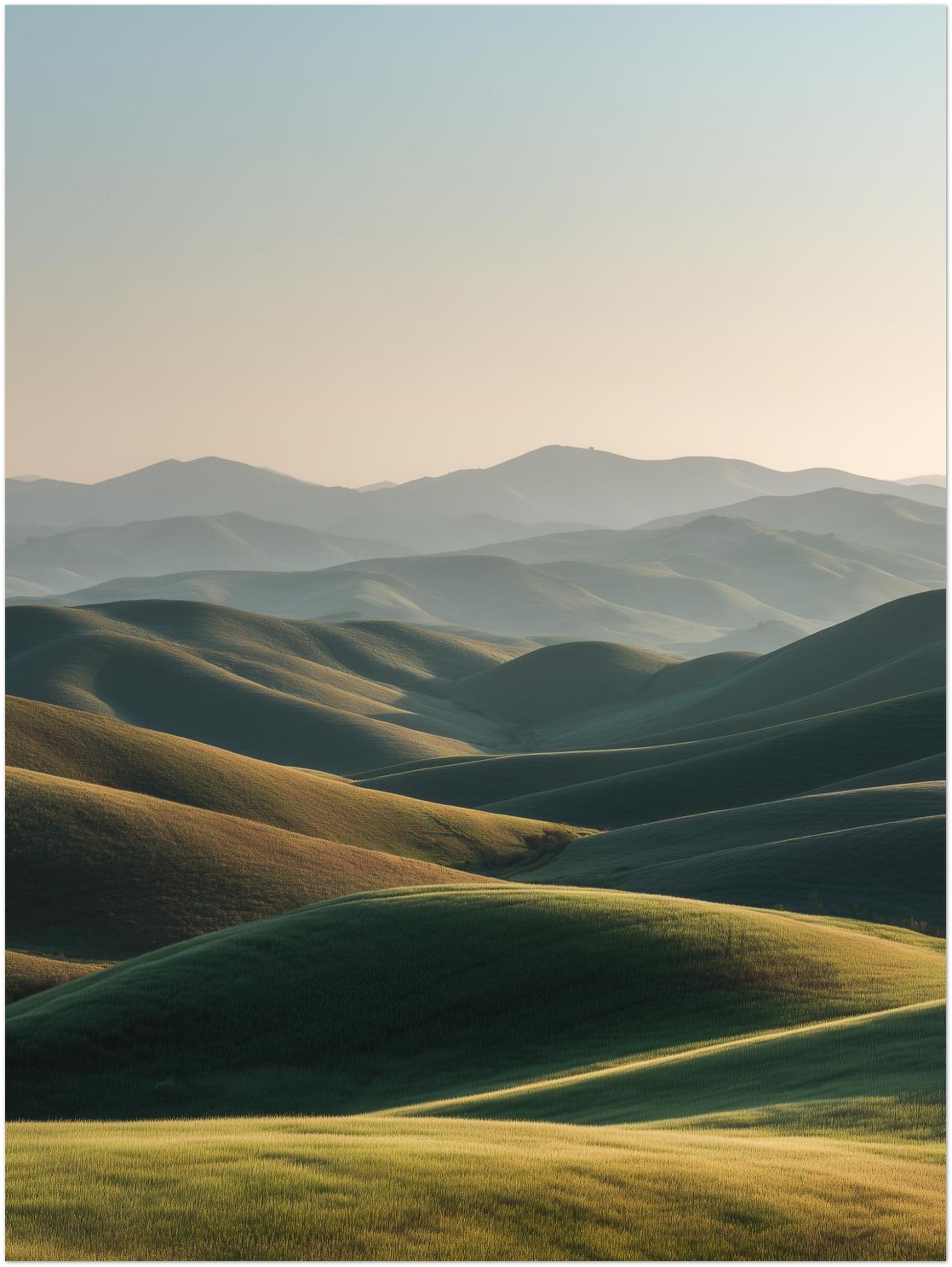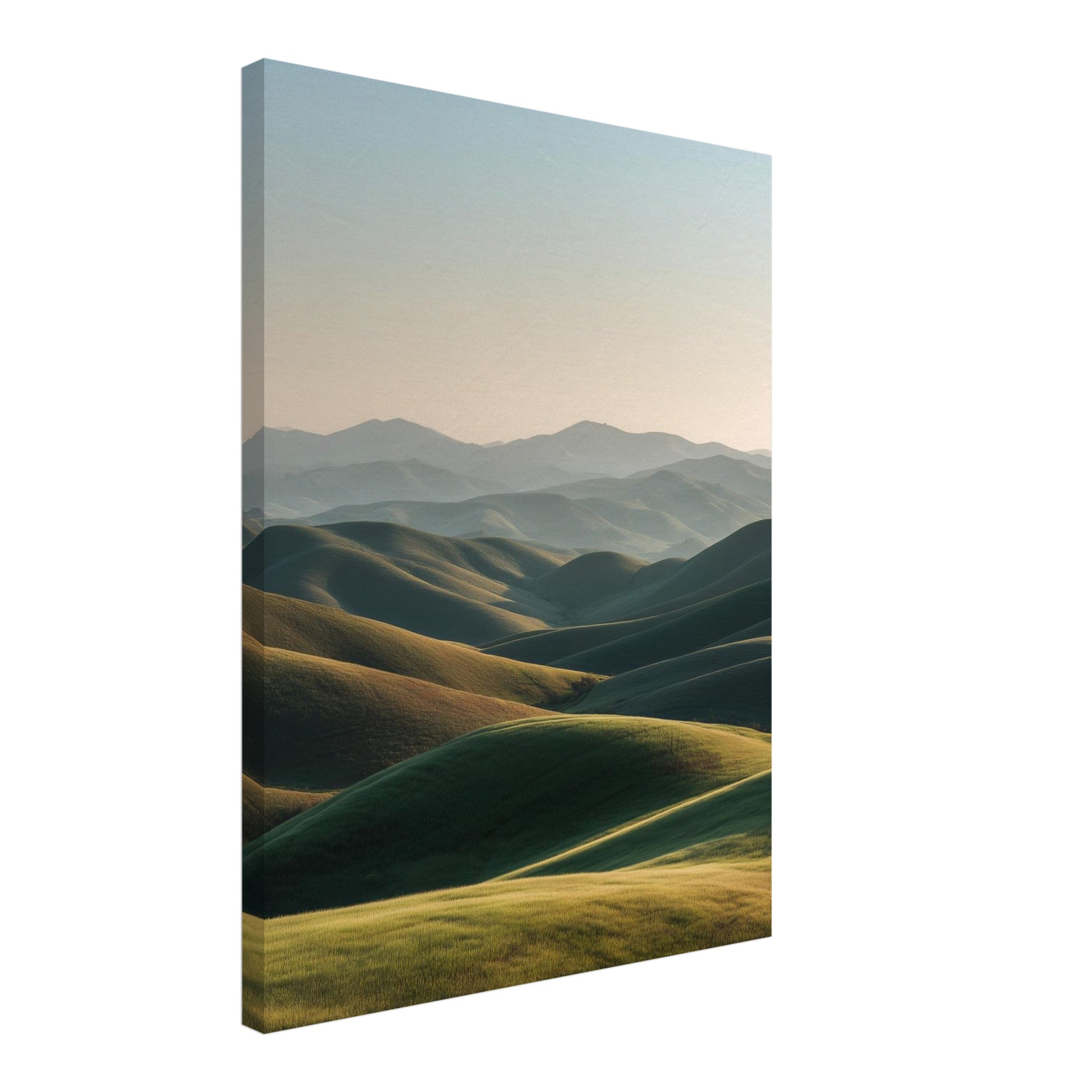 Auf diesem Leinwandbild entfalten die sanften Hügel eine besondere räumliche Tiefe. Licht und Schatten fließen weich ineinander und verleihen der Landschaft eine ruhige Dynamik. Die Leinwandoberfläche verstärkt die natürlichen Übergänge und macht die Szene spürbar.
