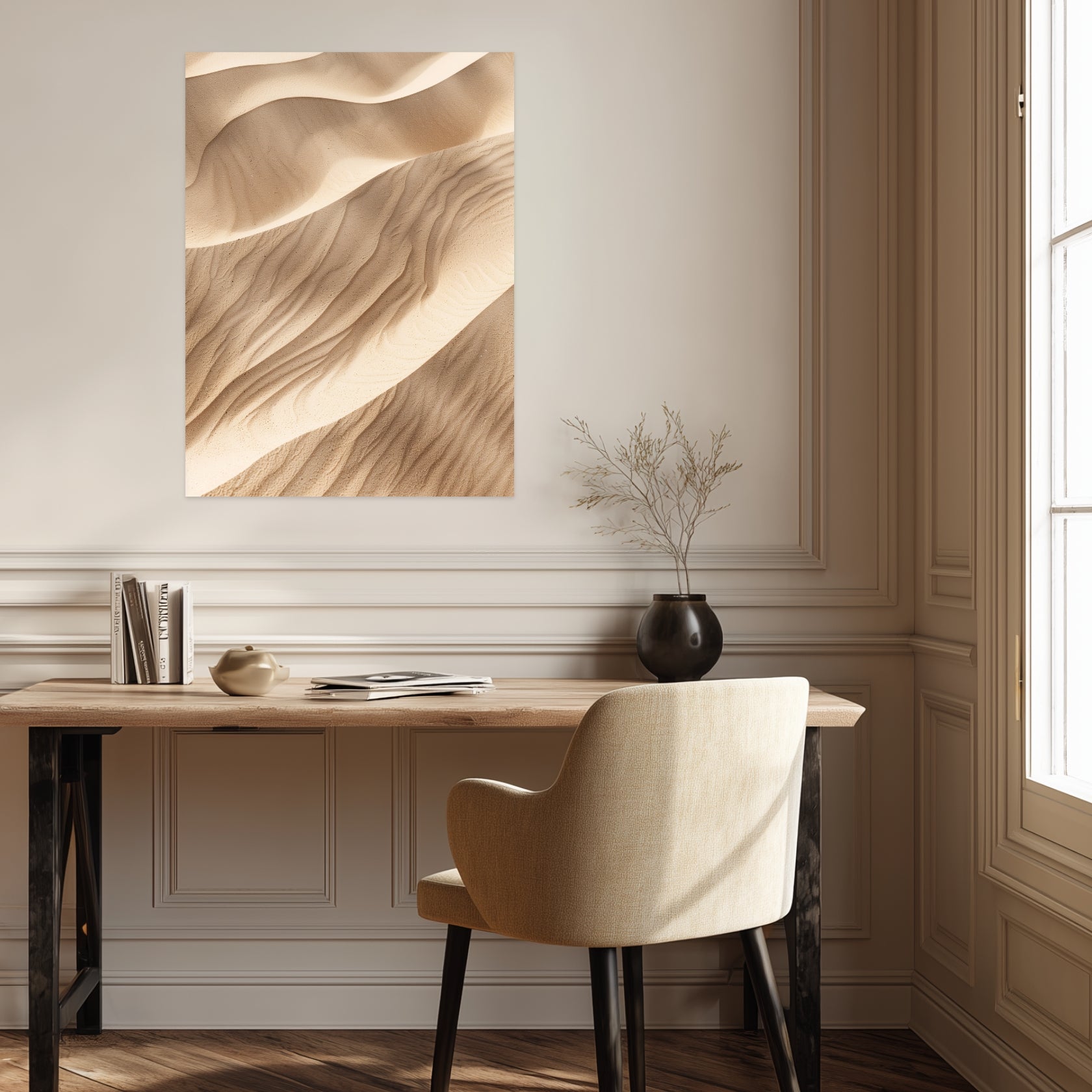 Das Landschaft Poster zeigt fließende Sanddünen, deren Linien sanft ineinander übergehen. Das Licht legt sich weich über die Oberfläche und betont die natürlichen Strukturen. Die helle, warme Farbigkeit verleiht dem Motiv Offenheit und Leichtigkeit.