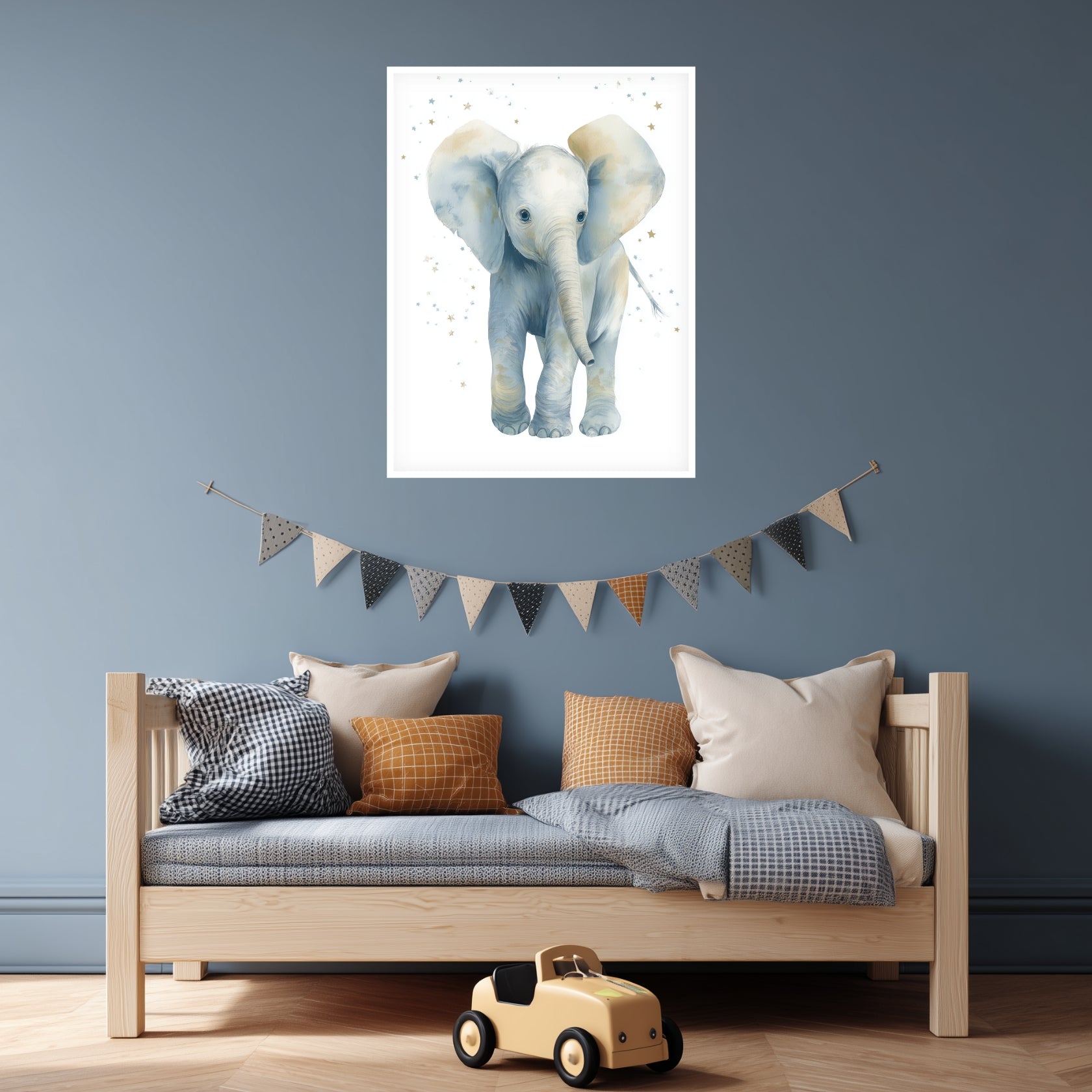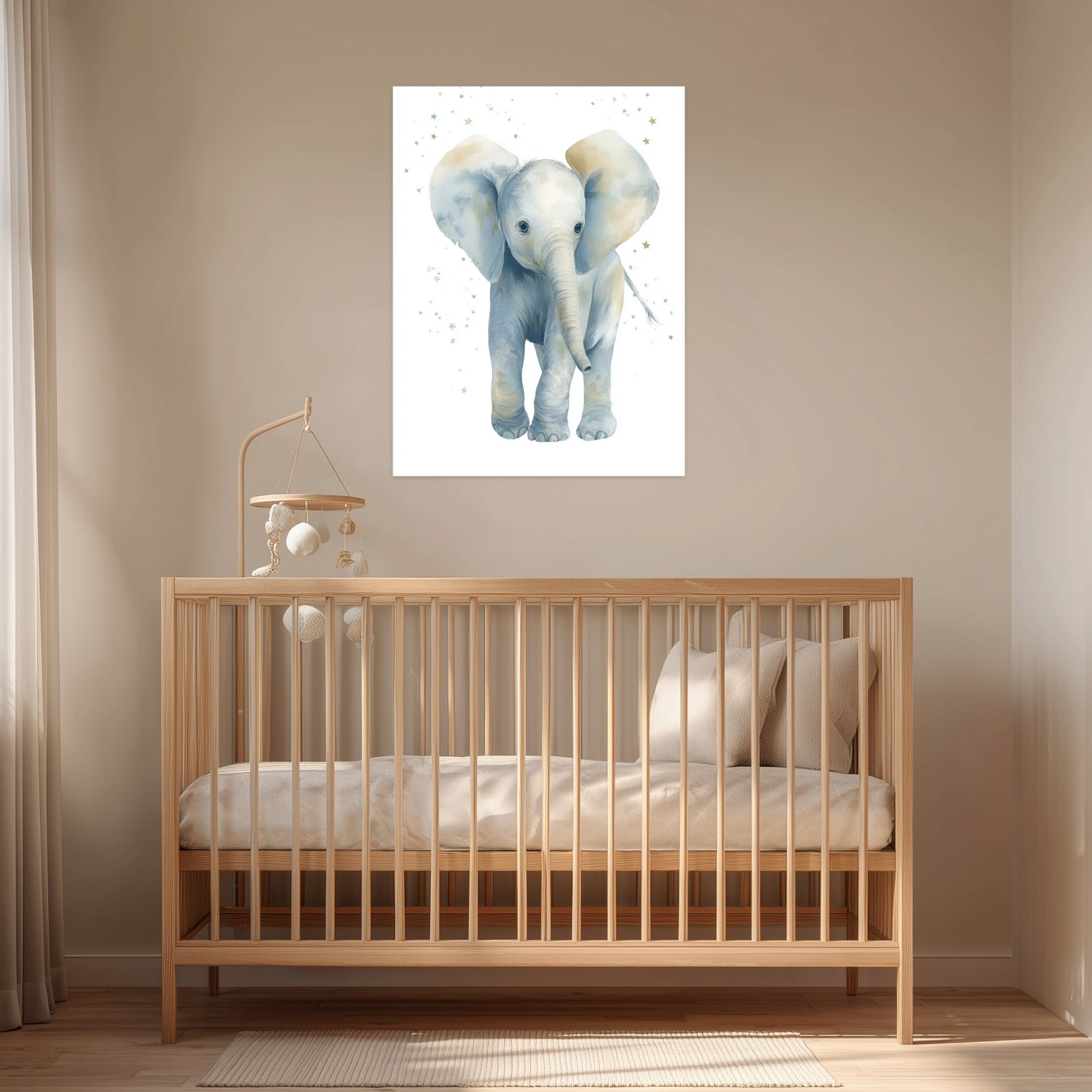Dieses Poster zeigt einen jungen Elefanten in zarter Aquarelltechnik. Die Farbpalette aus sanftem Blau, hellem Grau und warmem Beige wirkt beruhigend und freundlich. Kleine Sterne im Hintergrund geben dem Motiv eine verspielte, kindgerechte Note, ohne die ruhige Gesamtwirkung zu stören.