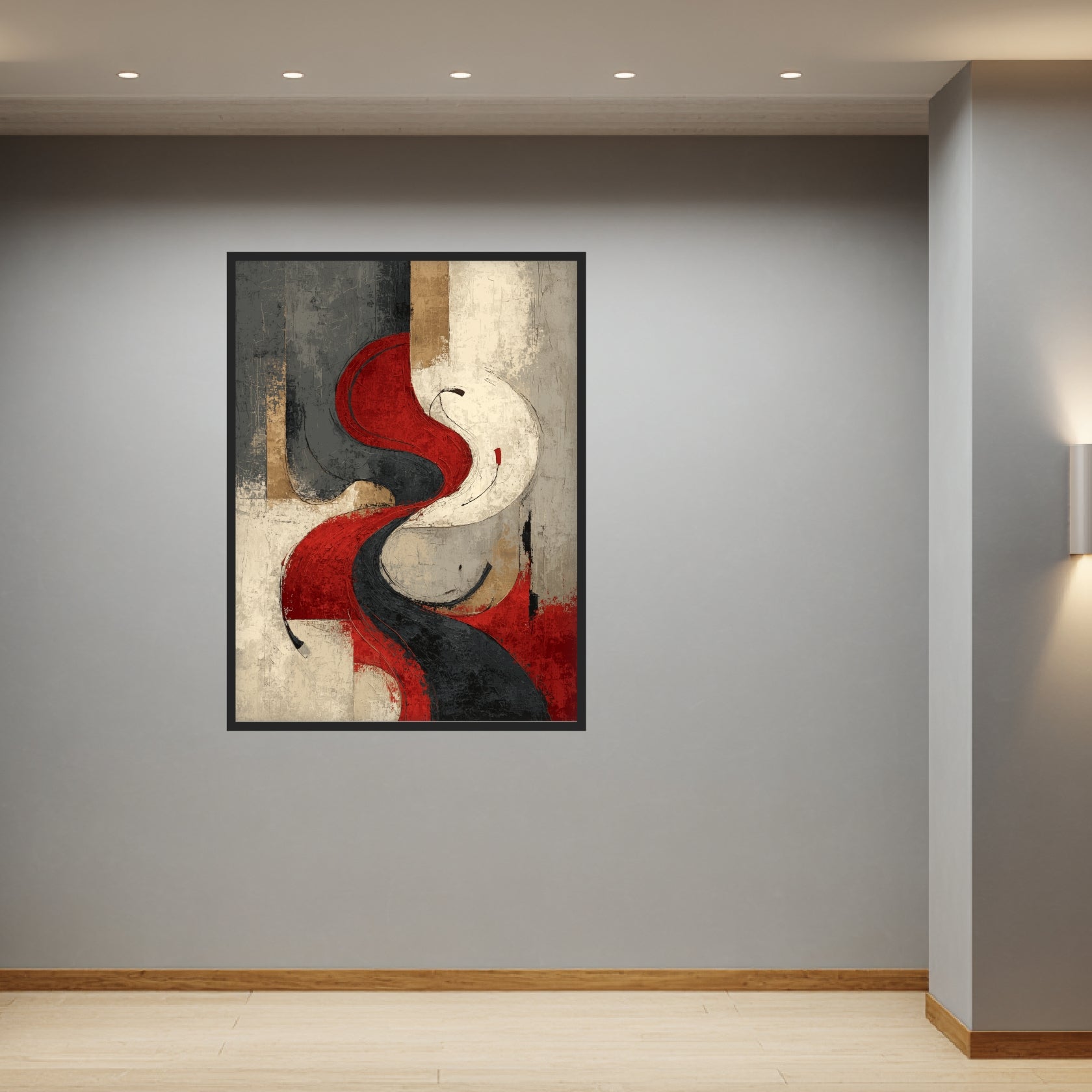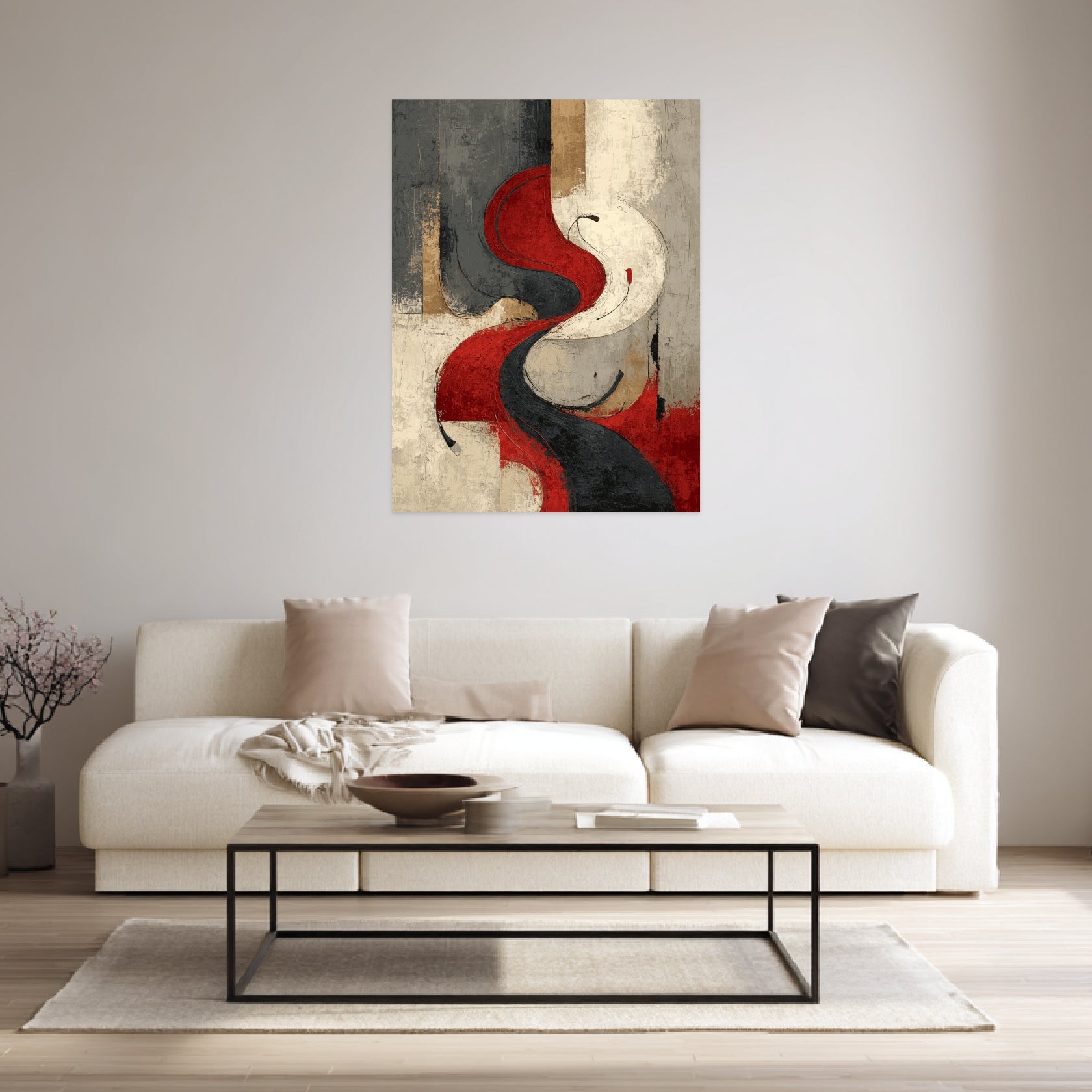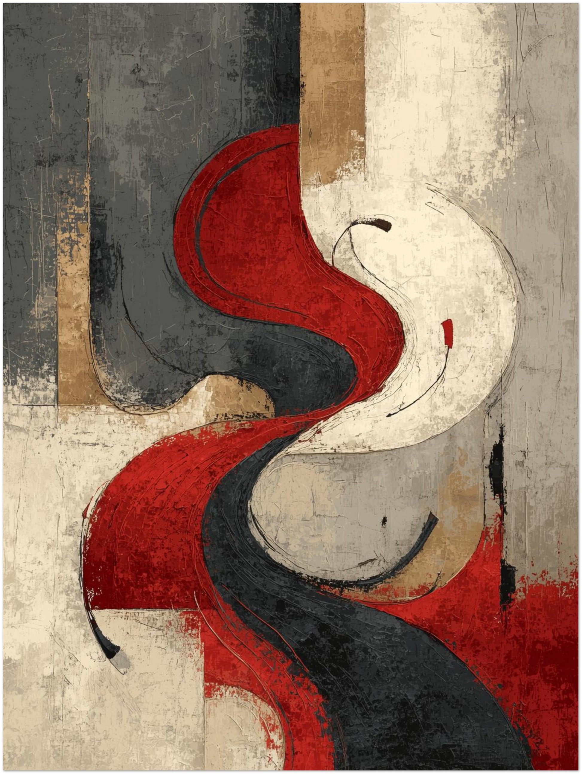 In diesem Poster entfaltet sich eine Komposition aus kräftigen schwarz-roten Schwüngen, die sich fließend über eine vielfältige Texturfläche aus Beige, Grau und gebrochenem Weiß bewegen. Die Linien besitzen einen dynamischen Rhythmus, der von rauen, leicht distressed wirkenden Hintergrundschichten aufgefangen und ausbalanciert wird. Durch das Zusammenspiel aus kantigen Fragmenten und weich geführten Kurven entsteht ein spannungsreiches Gefüge, das die visuelle Tiefe des Motivs verstärkt. Die klare Formensprache trägt die ruhige, strukturbetonte Ästhetik zeitgenössischer Abstrakte Kunst Poster und fügt sich zugleich in die reduzierte, hochwertige Wirkung moderner Wandbilder Abstrakt Modern ein. Gerade im Wohnzimmer oder Flur wirkt dieses Poster besonders harmonisch und charakterstark.