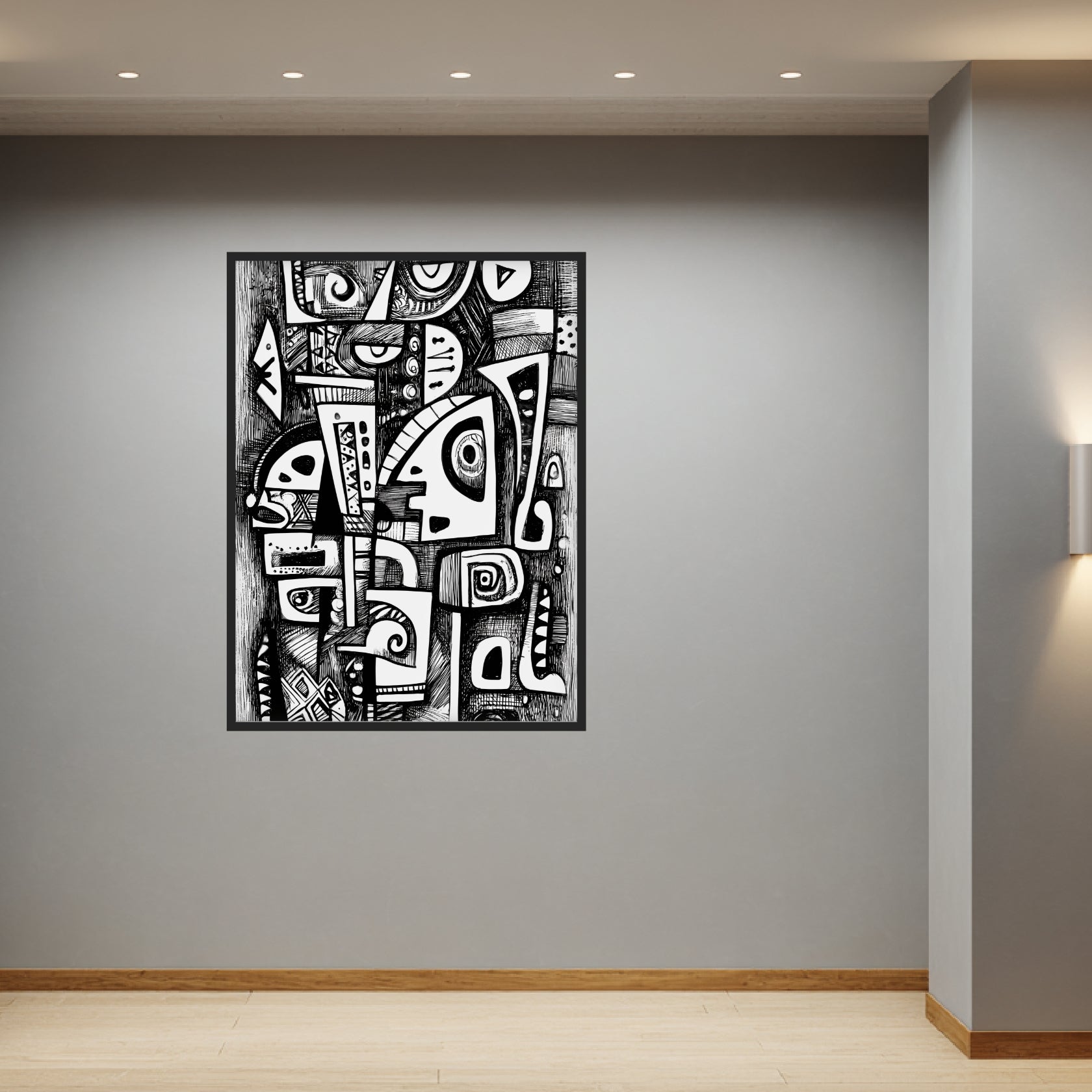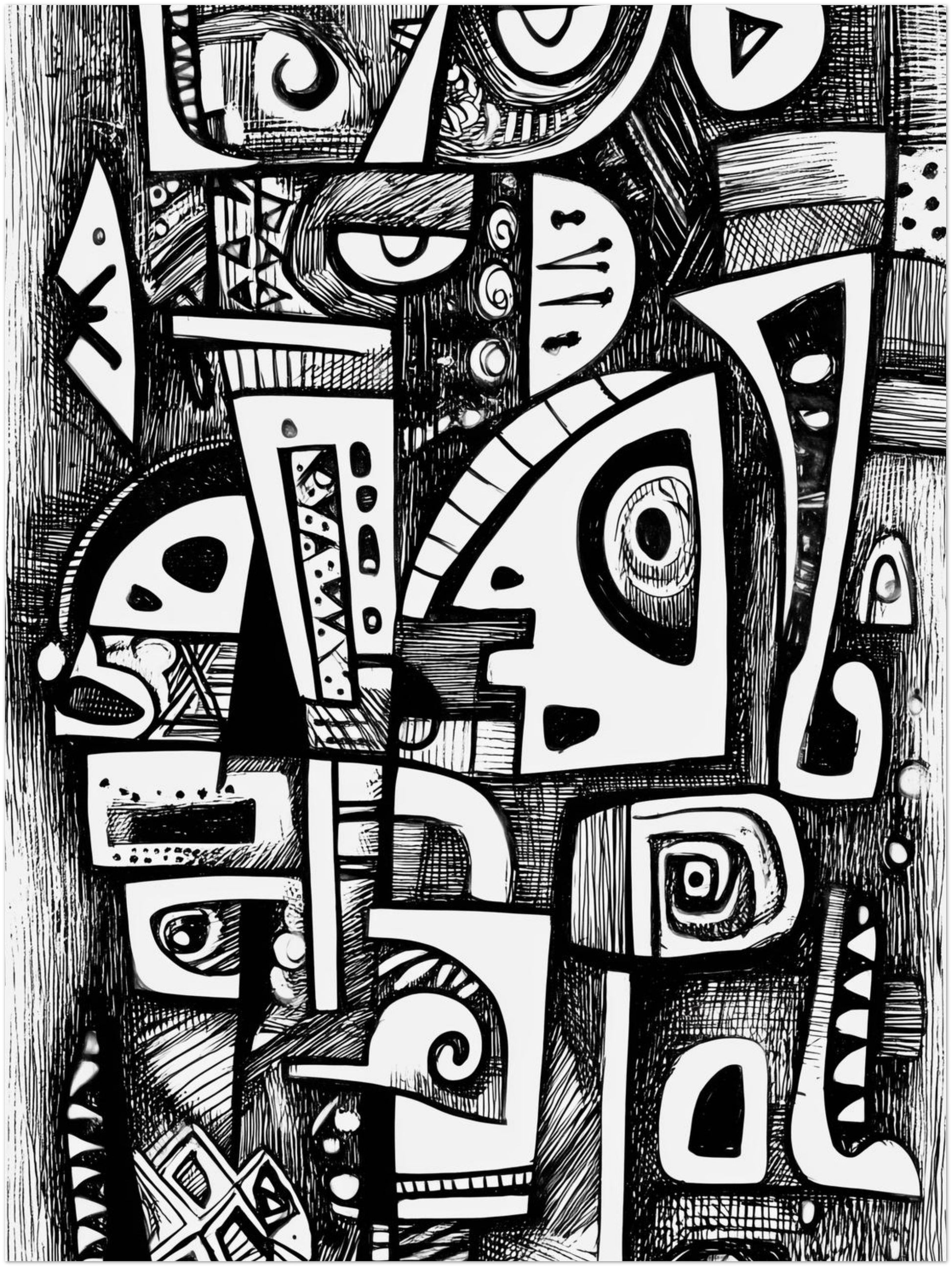Die Komposition entfaltet sich über eine Vielzahl grafischer Elemente, die ineinander verschachtelt sind und in einem klaren Schwarz-Weiß-Kontrast ausgeführt wurden. Unterschiedliche Linienstärken erzeugen ein abwechslungsreiches Muster aus Schraffuren, Rundungen, Winkeln und ornamentalen Fragmenten. Einzelne Formen erinnern an abstrahierte Augen oder Masken, die dem Werk eine geheimnisvolle, fast rhythmische Struktur verleihen. Trotz der dichten Anordnung bleibt die Komposition ausgewogen, da große weiße Flächen die dunklen, detaillierten Bereiche ausbalancieren. Besonders im Wohnzimmer oder Flur wirkt dieses Poster als markanter Blickpunkt, der die charakteristische grafische Strenge von Wandbilder Abstrakt Modern mit der vielseitigen Ausdruckskraft der Moderne Abstrakte Malerei verbindet.