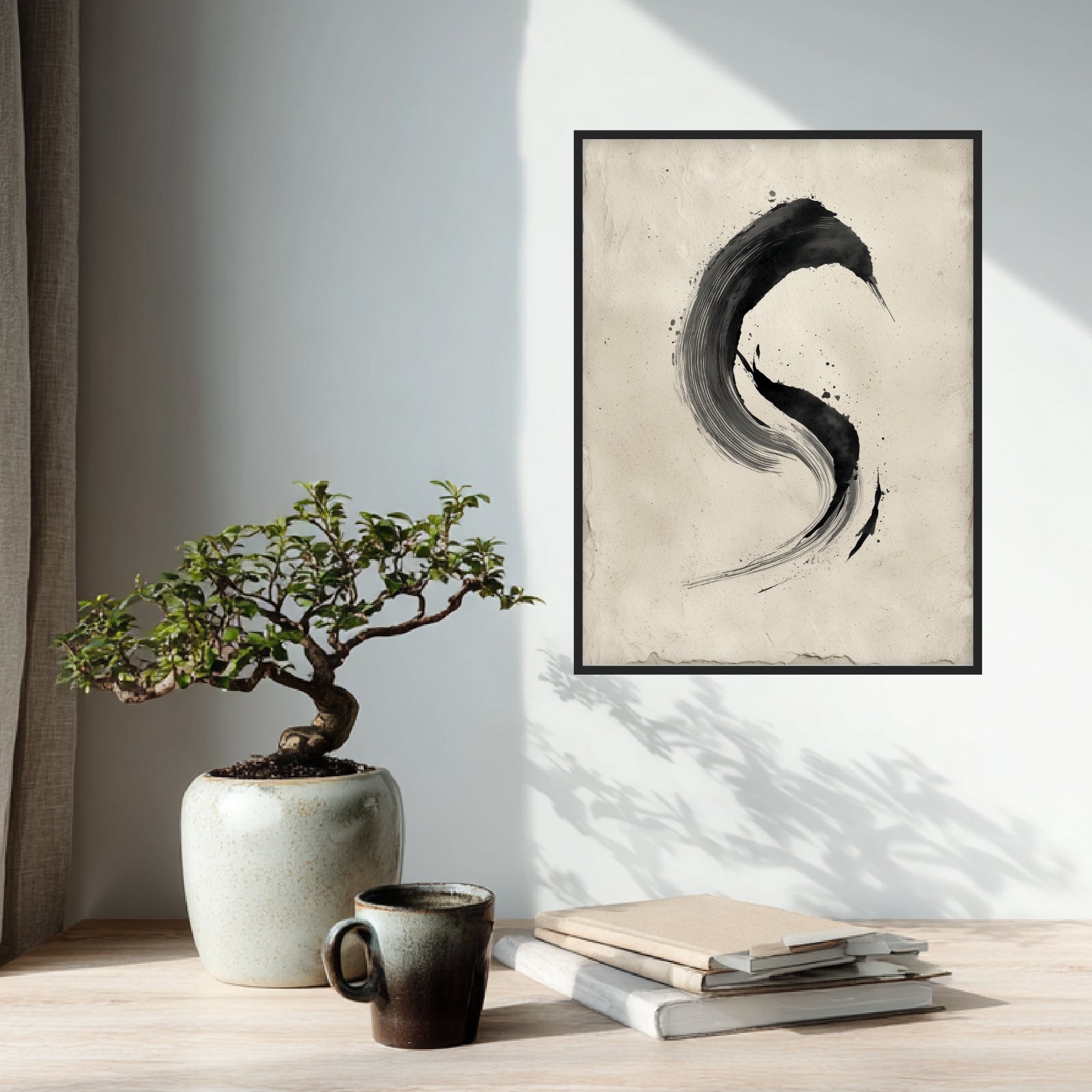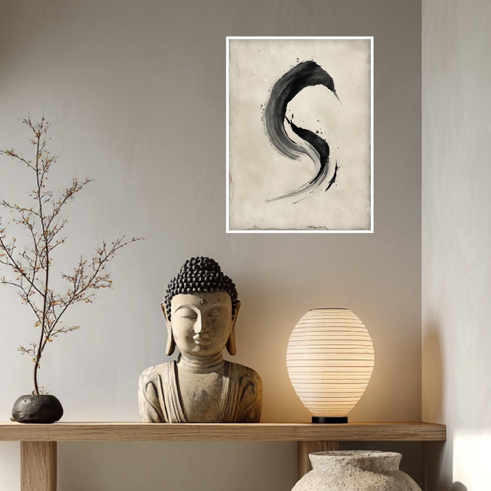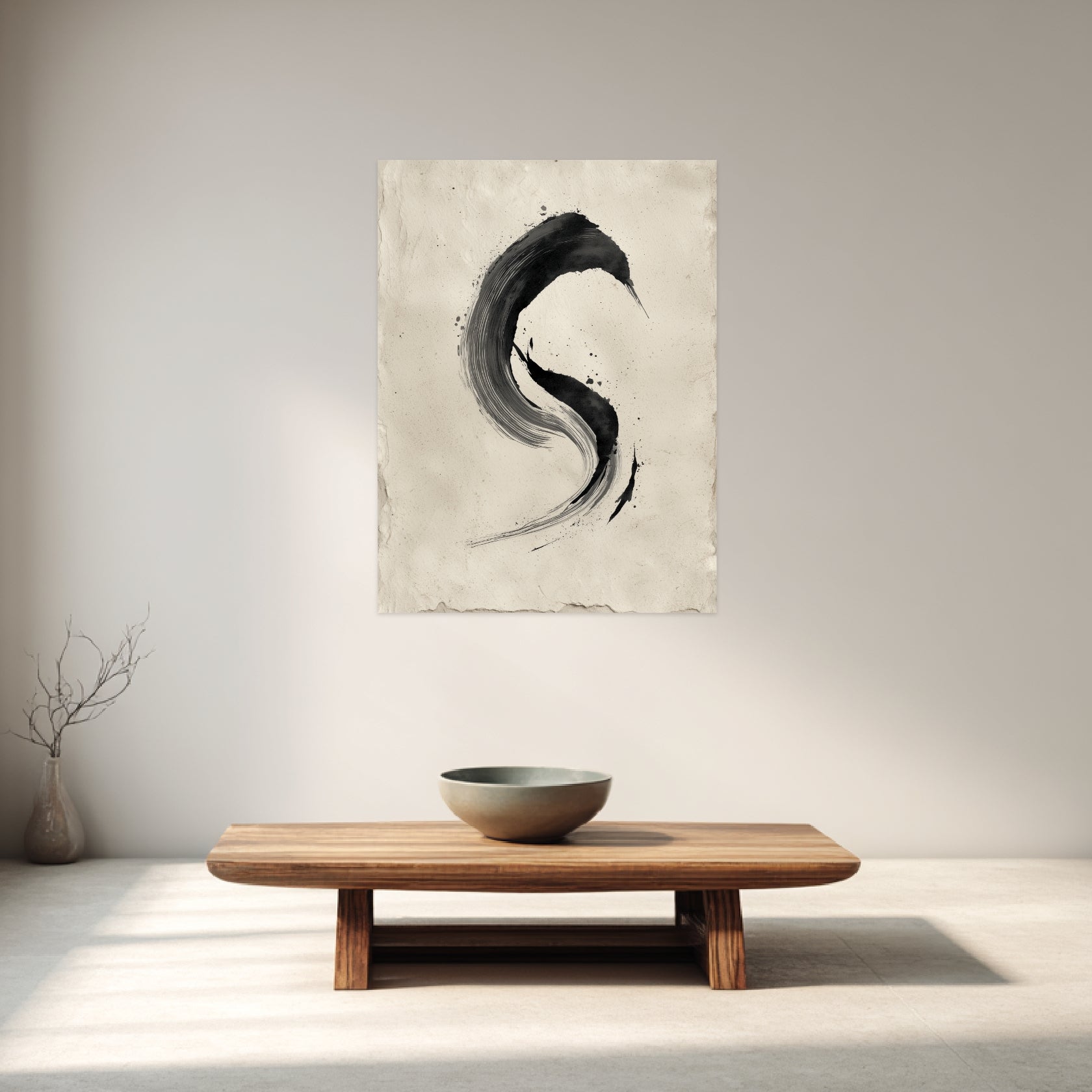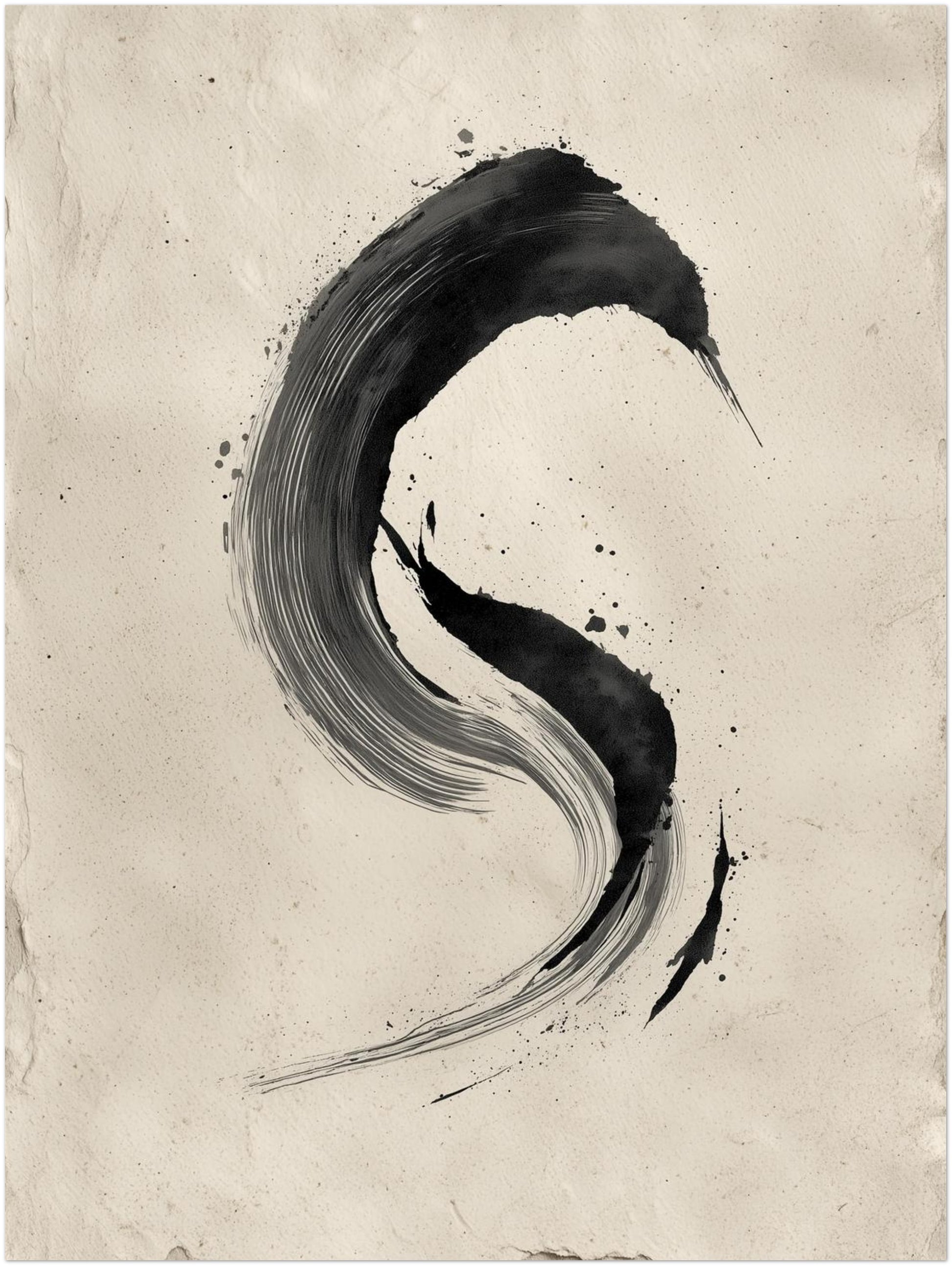 Zu Beginn zeigt sich der schwarze Bogen wie eine Spur, die ohne Hast in den Raum gesetzt wurde. Die Bewegung verdichtet sich leicht am oberen Schwung und löst sich nach unten wieder auf, wodurch eine sanfte Kreisandeutung entsteht. Die unregelmäßigen Spritzer verleihen dem Motiv eine lebendige Stille, die sich behutsam ausbreitet. Der helle Hintergrund trägt diese Form wie ein stilles Echo. In einem Wohnzimmer oder Flur entfaltet der Druck seine ruhige Präsenz und lässt eine harmonische Offenheit entstehen. Die klare Linie tritt zurückhaltend hervor und betont die gedachte Leere dazwischen. So verbindet das Motiv zeitlose Einfachheit mit einem stillen Moment, der im Einklang von Zen Stil und Zen Poster verweilt.