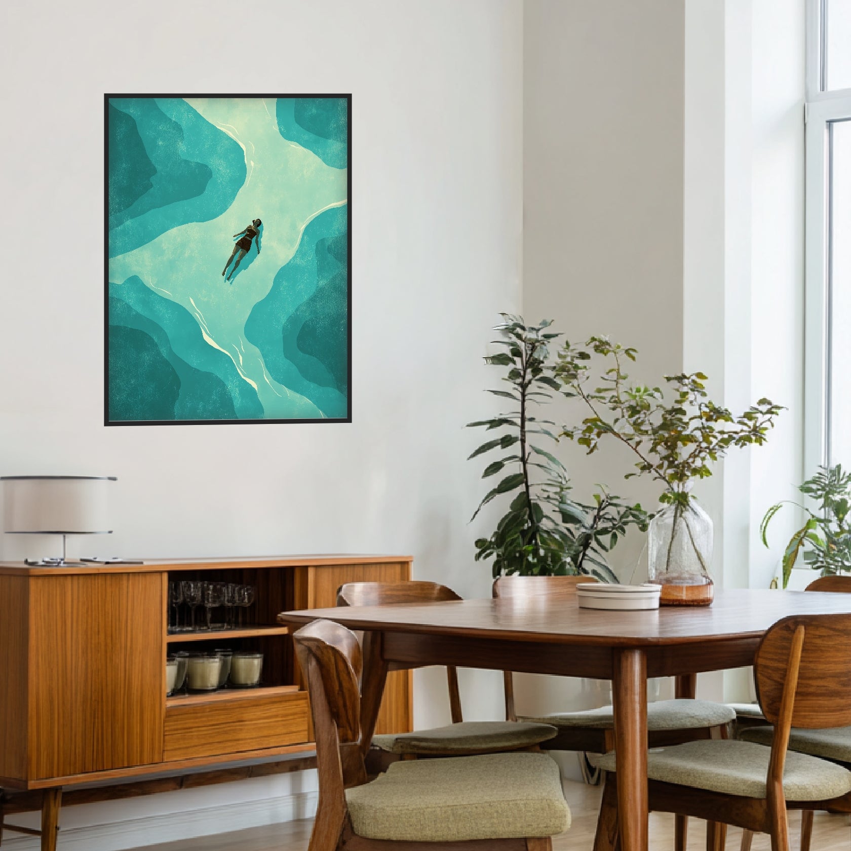 Das Motiv zeigt eine einzelne Figur, die entspannt im Wasser treibt. Umgeben von fließenden, organischen Formen entsteht eine ruhige Komposition, die Bewegung nur andeutet. Die Farbpalette aus kühlen Blau- und Türkistönen wirkt ausgewogen und leicht gedämpft, mit einer feinen, analogen Textur. Linien und Flächen greifen harmonisch ineinander und erzeugen visuelle Tiefe ohne Unruhe. Dieses Retro Poster lebt von seiner stillen Wirkung und klaren Gestaltung. Als Kunstdruck Retro bringt es Gelassenheit in Wohnräume, Schlafzimmer oder ruhige Arbeitsbereiche.