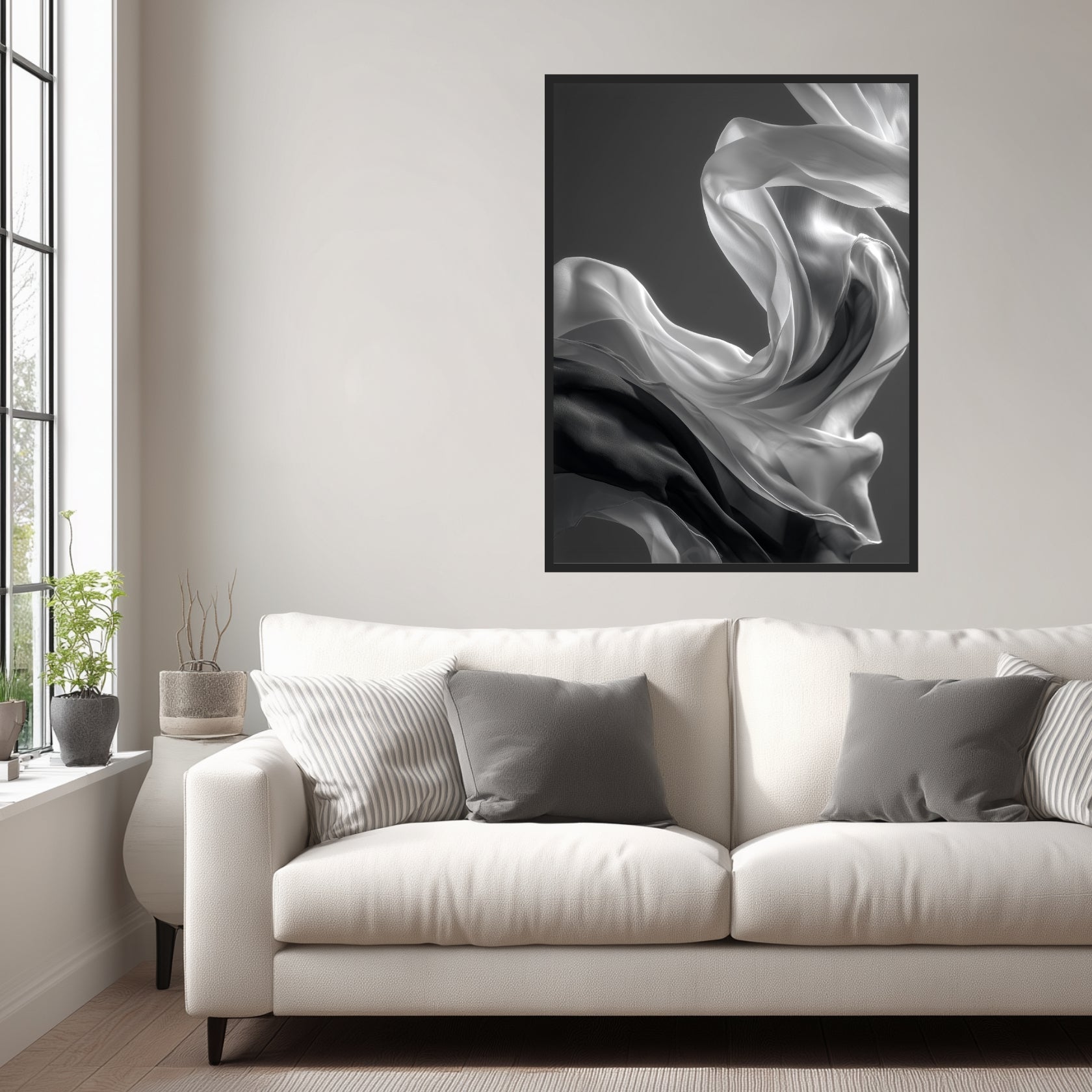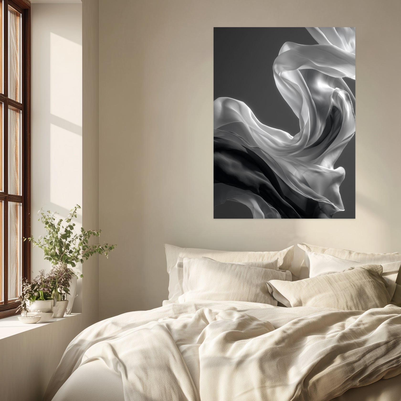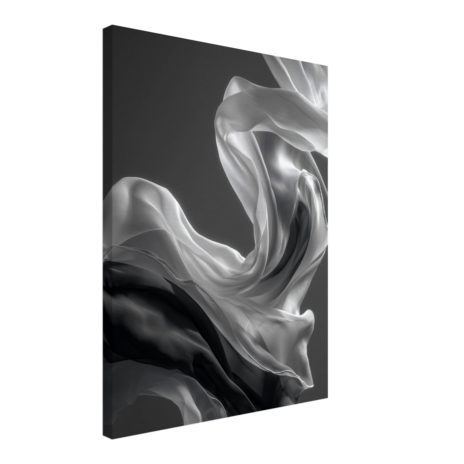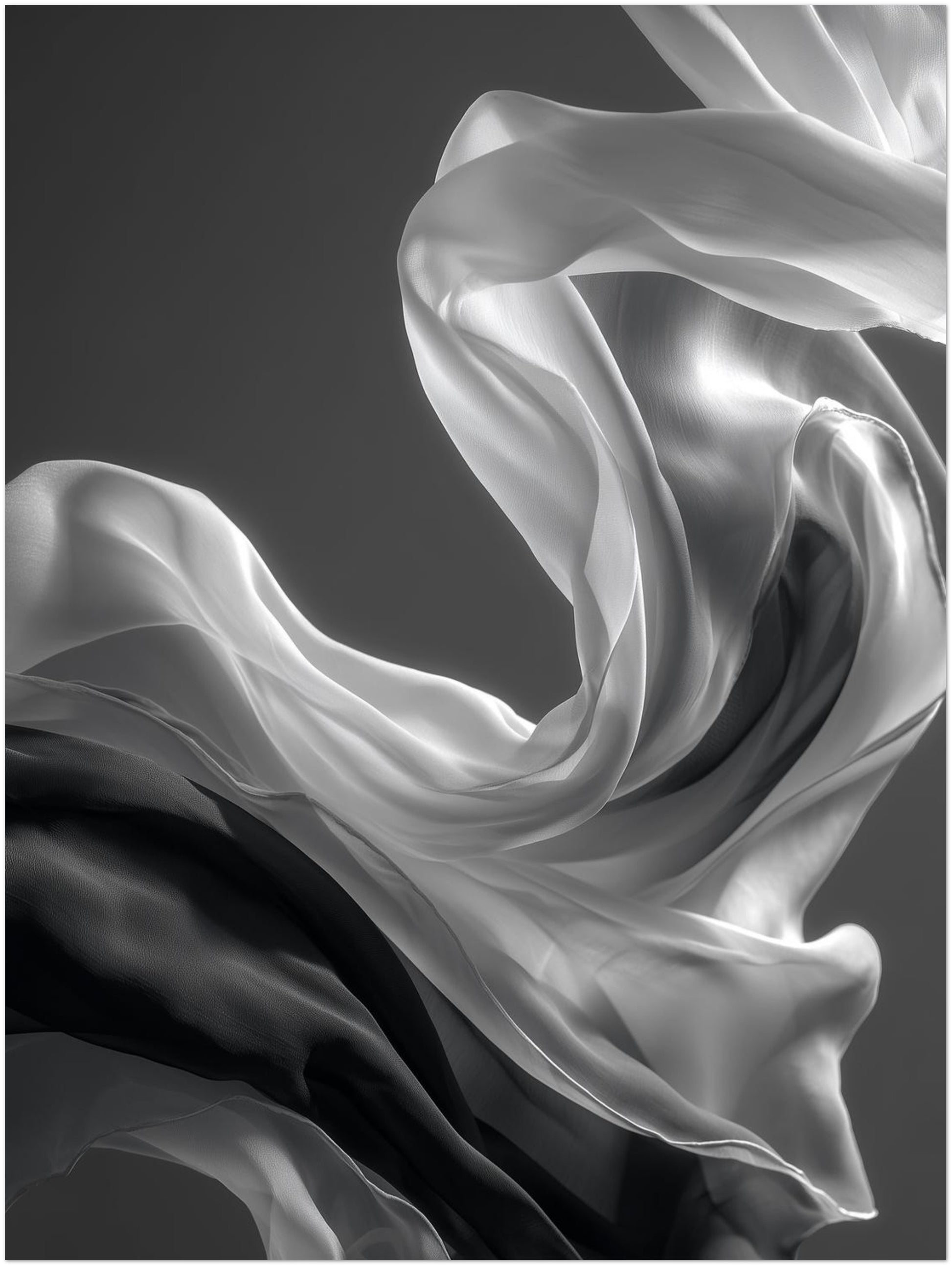 Auf der Leinwand wirkt der Stoff unmittelbar und offen. Das Seidenschal Leinwandbild zeigt feine Übergänge zwischen Licht und Dunkel, ohne harte Kontraste oder klare Begrenzungen. Die Bewegung bleibt ruhig und gleichmäßig und verleiht dem Motiv Tiefe. Innerhalb hochwertiger Schwarz Weiß Leinwandbilder und reduzierter Schwarz Weiß Bilder entsteht eine stille Bildwirkung. Im Wohnzimmer oder Schlafzimmer unterstützt das Motiv eine entspannte, zeitlose Raumstimmung.
