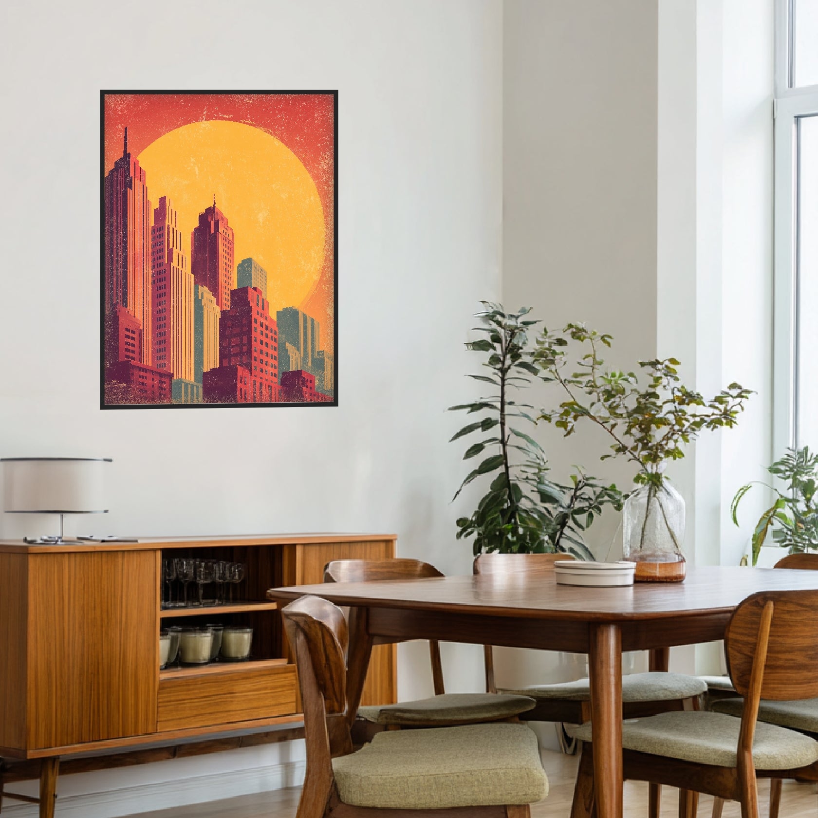 Die Komposition zeigt eine abstrahierte Stadtlandschaft, aufgebaut aus klaren, vertikalen Formen. Die Gebäude stehen dicht nebeneinander, ruhig gegliedert und bewusst vereinfacht. Dahinter dominiert eine große Sonne, deren warmes Licht die Szene in sanfte Gelb- und Rottöne taucht. Die Farbflächen wirken leicht gealtert, mit feiner Körnung, die an analoge Drucke erinnert. Dieses Retro Poster lebt von seiner grafischen Ordnung und der ausgewogenen Balance zwischen Architektur und Licht. Als Kunstdruck Retro entfaltet es eine stille Präsenz, die Wohnzimmer, Arbeitsräume oder Flure mit urbaner Ruhe und zeitloser Ästhetik füllt.