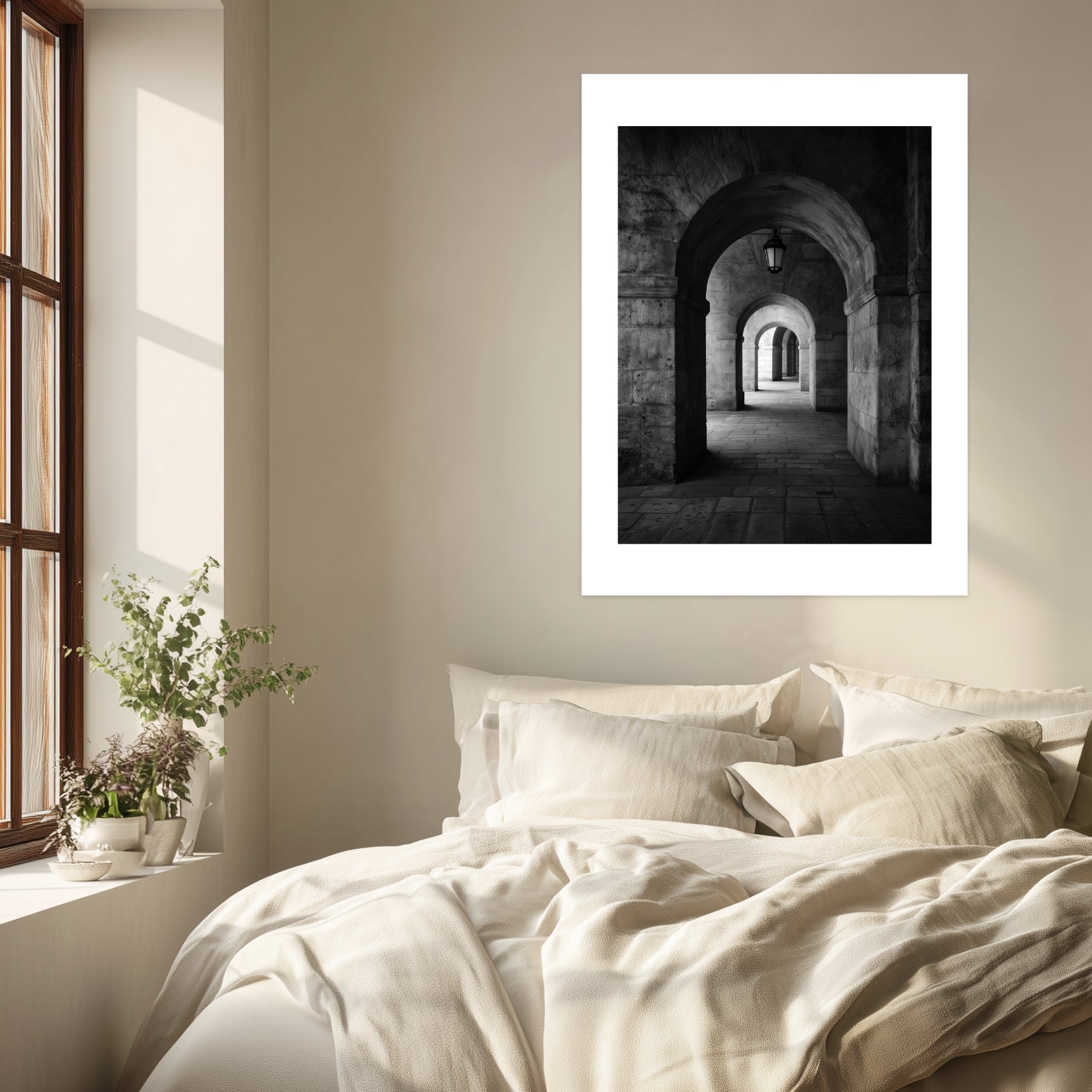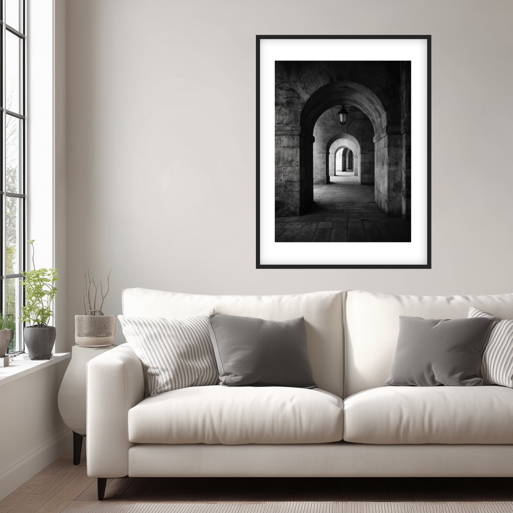 Das Motiv zeigt einen steinernen Durchgang, dessen Bögen sich rhythmisch in die Tiefe staffeln. Das Steinbogen Durchgang Poster lebt vom Wechsel aus massiver Fläche und offenem Raum. Licht fällt gezielt auf Boden und Wand und hebt die Struktur des Materials hervor. In Verbindung mit einem Passepartout erhält das Bild eine klare Fassung, die den Blick lenkt und die räumliche Tiefe verstärkt. Als Schwarz Weiß Poster entfaltet es seine Wirkung besonders im Flur oder im Wohnzimmer, wo Ruhe und Ordnung den Raum prägen.