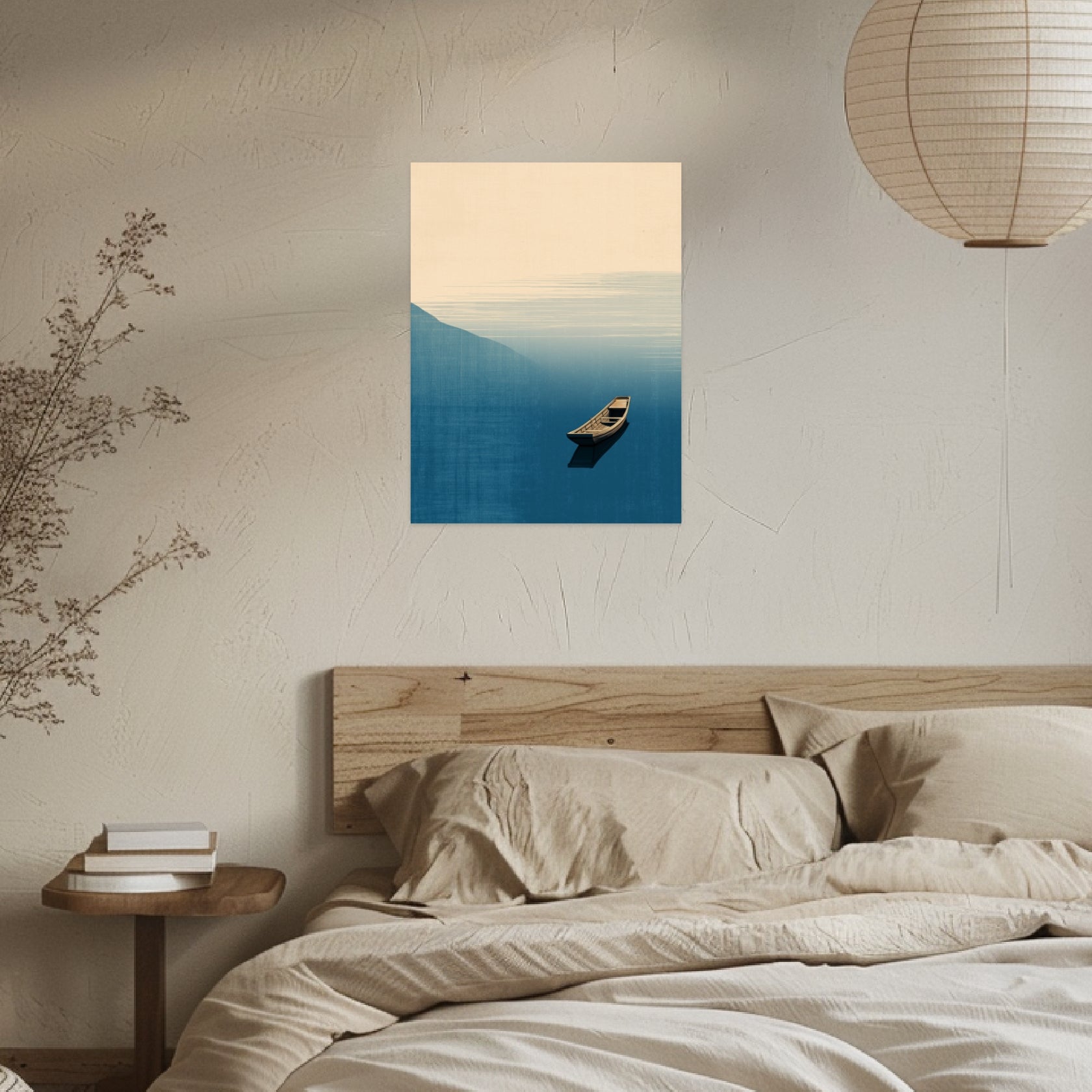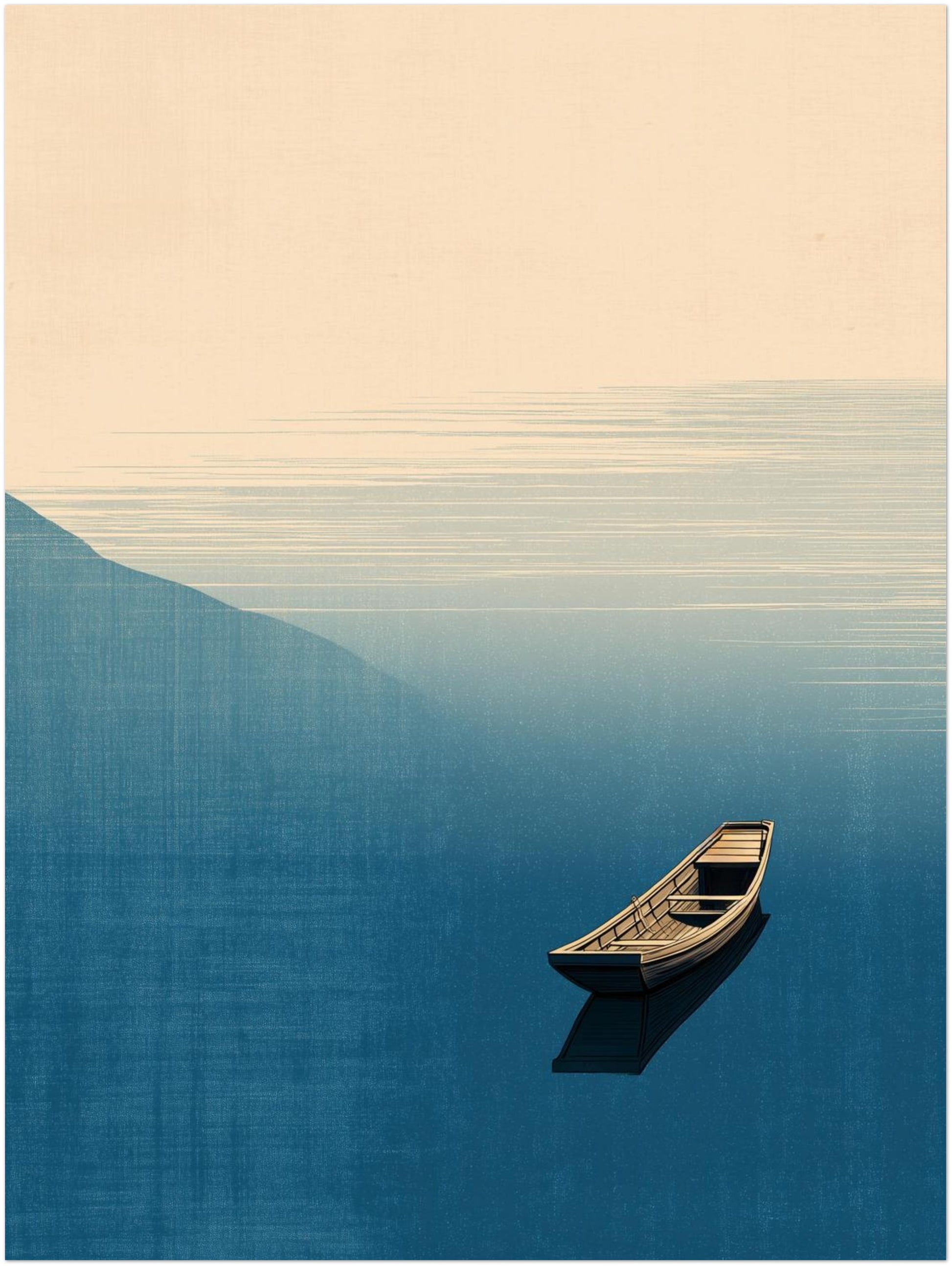 Weite und Stille bestimmen den ersten Eindruck dieses Motivs. Eine ruhige Wasserfläche breitet sich aus, darüber ein heller, fast leerer Himmel. Inmitten dieser Zurückhaltung ruht ein einzelnes Boot, klar gezeichnet und ohne Bewegung. Das Bild lebt von Kontrasten zwischen Tiefe und Leere, zwischen Struktur und glatter Fläche. Im Sinne des Japandi Style entsteht eine visuelle Balance, die an die Ästhetik traditioneller Japanische Kunst erinnert und zugleich modern wirkt. Als Japandi Poster entfaltet das Motiv seine Wirkung besonders im Wohnzimmer oder im Flur, wo es eine ruhige Atmosphäre schafft und den Raum nicht überlädt. Das zurückgenommene Japandi Design lädt dazu ein, den Blick schweifen zu lassen und einen Moment der Stille zuzulassen.