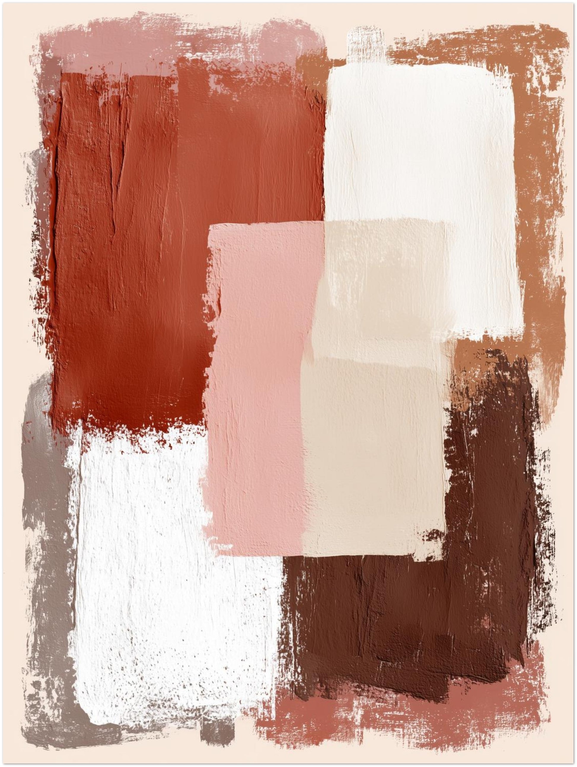 Das Motiv zeigt eine sanfte, aus Rechteckflächen aufgebaute Komposition aus warmen Terracotta-, Rosé-, Creme- und Brauntönen. Die weichen Kanten und strukturierten Pinselzüge formen ein ruhiges Spannungsfeld, das sich über mehrere Ebenen hinweg entfaltet. Zwischen den warmen Flächen setzen helle, beinahe pastellige Bereiche zarte Akzente, die die Bildwirkung öffnen und eine feine Luftigkeit erzeugen. Besonders im Wohnzimmer oder Flur entwickelt diese Mischung aus Struktur und Farbe eine ästhetisch beruhigende Präsenz. Das Zusammenspiel erinnert an die klare Formsprache hochwertiger Wandbilder Abstrakt Modern und reiht sich zugleich in die dezente Eleganz feiner Abstrakte Kunst Poster ein. So entsteht ein Werk mit zeitloser, warm ausstrahlender Tiefe.