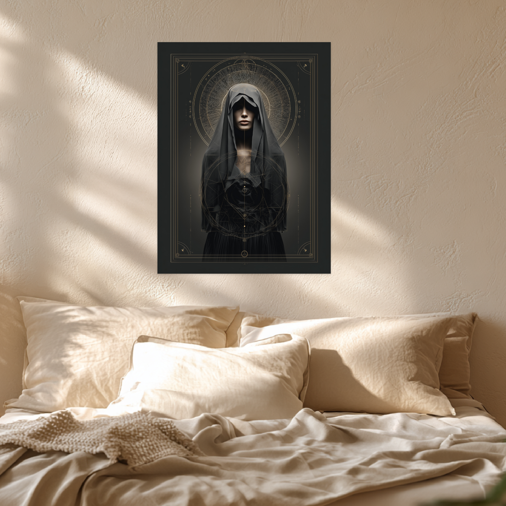 Die Darstellung lebt von der stillen Ausstrahlung der verschleierten Figur und der sie umgebenden geometrischen Ordnung. Kreisförmige Elemente und feine Linien strukturieren den Bildraum und lenken den Blick ruhig zur Mitte. Die zurĂŒckhaltende Farbgebung verstĂ€rkt die Tiefe und lĂ€sst das Motiv ruhig und prĂ€sent erscheinen. Die Leinwandstruktur unterstĂŒtzt die hochwertige Wirkung und verleiht dem Bild eine besondere MaterialitĂ€t. Im Schlafzimmer oder Wohnzimmer entfaltet das Motiv seine ausgleichende Wirkung. Als Teil moderner Spirituelle Leinwandbilder ergĂ€nzt es stilvolle Konzepte eines Wandbild Spirituell mit klarer Balance und Ruhe.