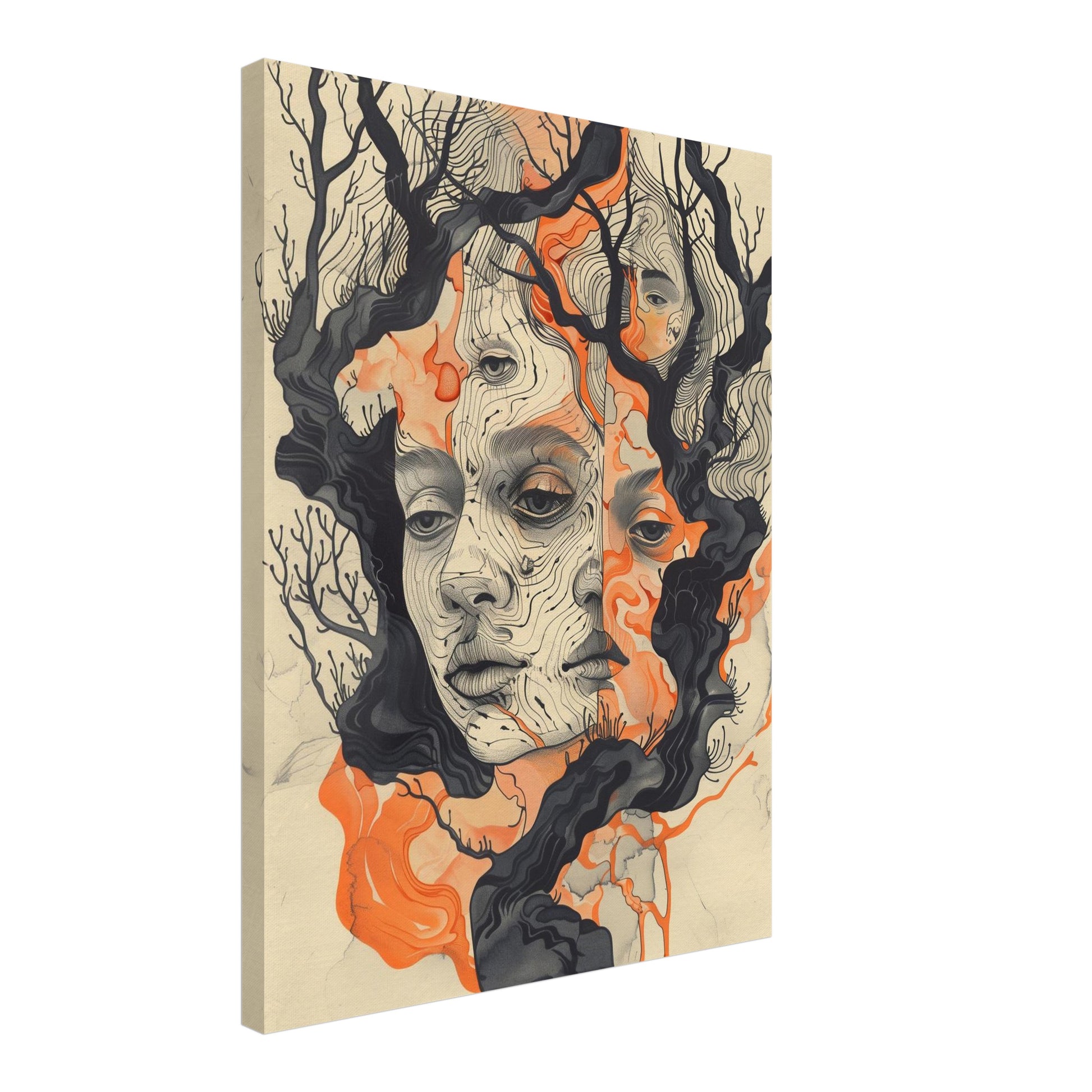 Wie ein Traum aus ineinander verschlungenen Formen erscheint das „Verwobenes Baumgesicht“ Leinwandbild, in dem menschliche Konturen und filigrane Baumäste zu einer gemeinsamen Struktur verschmelzen. Die feinen, kartografisch wirkenden Linien geben dem Gesicht eine sanfte, fast meditative Tiefe, während das glühende Orange subtilen Kontrast und Wärme einbringt. Als Psychedelic Komposition zählt es zu den ausdrucksstarken Psychedelic Bilder, die besonders auf Canvas ihre lebendige Räumlichkeit entfalten. Das weiche Material unterstützt das Psychedelic Design und lässt die Formen plastisch hervortreten. Als Psychedelic Art Canvas schafft das Werk im Schlafzimmer oder Wohnzimmer eine immersive, ruhige, zugleich kraftvoll pulsierende Atmosphäre, die den Raum kunstvoll verwandelt.