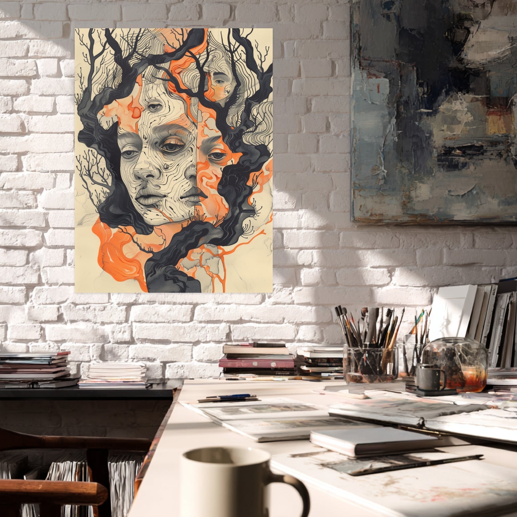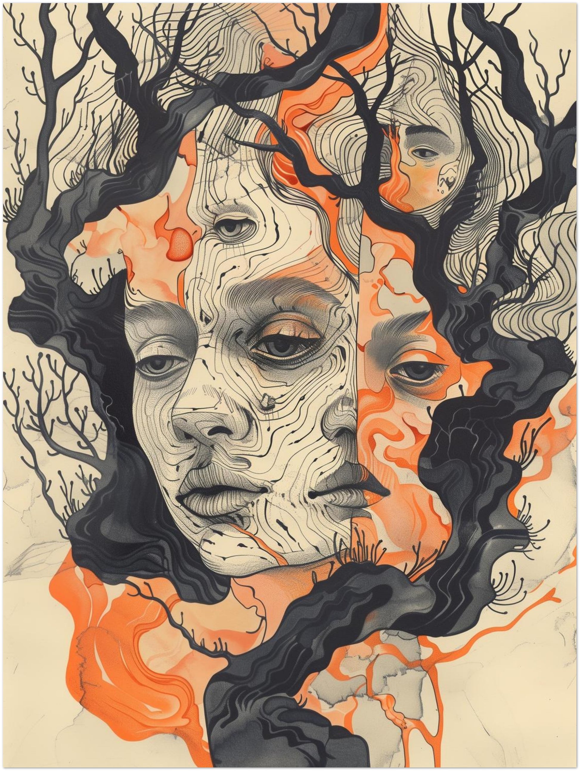 Von einem Netz aus geschwungenen Linien und verzweigten Baumstrukturen umhüllt, entfaltet das „Verwobenes Baumgesicht“ Poster eine geheimnisvolle, fast schwebende Bildwelt. Die Gesichtszüge wirken wie topografische Landschaften, die sich sanft in die dunklen, organisch geformten Äste einfügen. Zwischen den Kurven und Schatten glimmen warme Orangetöne auf, die das Motiv mit einer inneren Glut zum Leben erwecken. Als Psychedelic Kunstwerk erschafft dieses Psychedelic Art Poster ein feines Zusammenspiel aus Naturanmutung und surrealem Ausdruck. Im Wohnzimmer bietet es einen faszinierenden visuellen Ruhepol, während der Psychedelic Style das Motiv mit fließendem Rhythmus und poetischer Energie erfüllt. Die Struktur der Linien lenkt den Blick immer wieder neu und verleiht dem Bild eine tiefe, atmosphärische Präsenz.