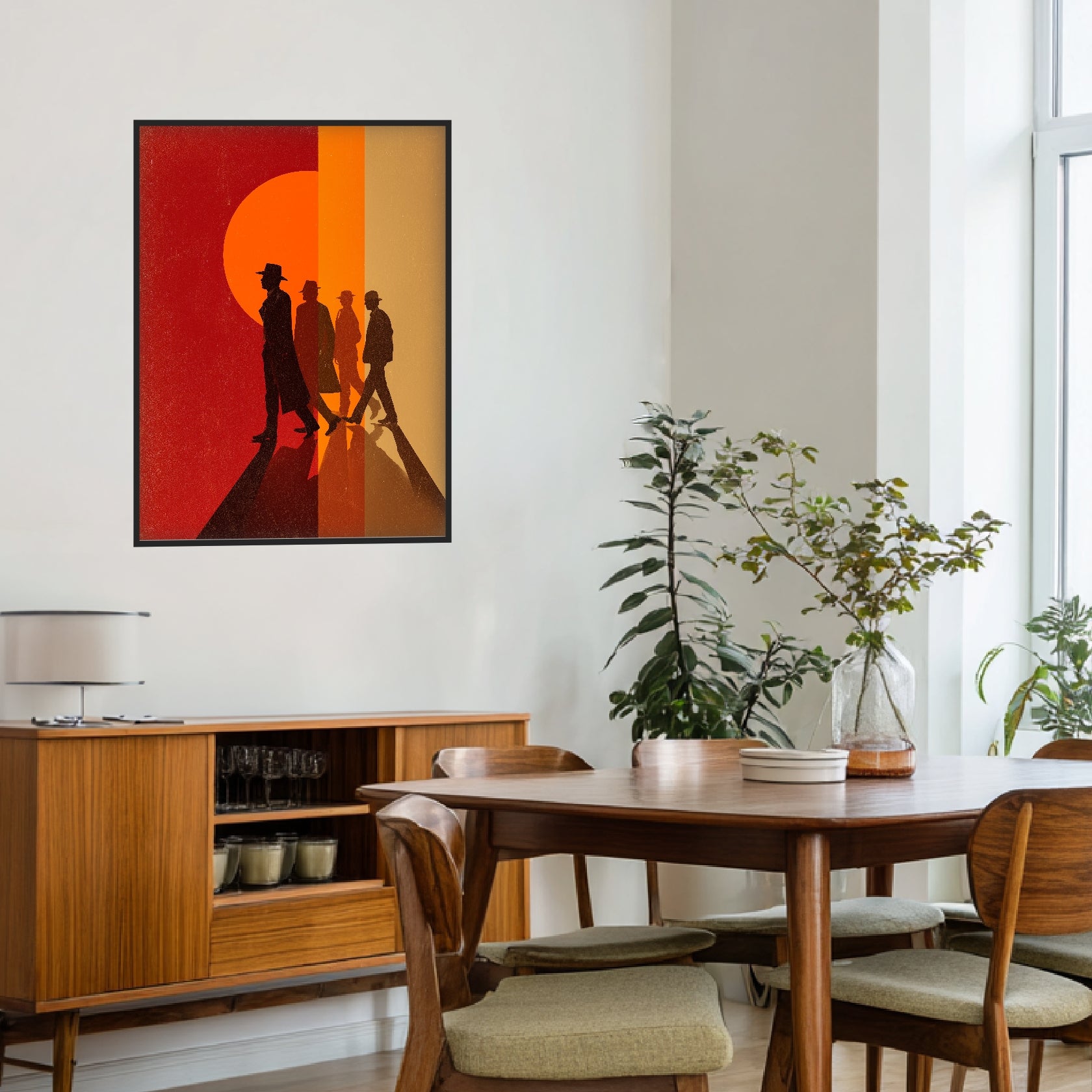 Das Poster zeigt vier MĂ€nner als dunkle Silhouetten, rhythmisch hintereinander angeordnet. Die Figuren bewegen sich durch breite FarbflĂ€chen, die wie gedruckte Bahnen wirken und dem Motiv Struktur verleihen. Licht und Schatten sind klar definiert, die Formen bewusst reduziert. Feine Texturen erinnern an klassische Drucke und verleihen dem Retro Design eine analoge Tiefe. Als Retro Poster entfaltet das Motiv eine ruhige, grafische PrĂ€senz und eignet sich ideal fĂŒr WohnrĂ€ume, BĂŒros oder Flure mit klarer Gestaltung.