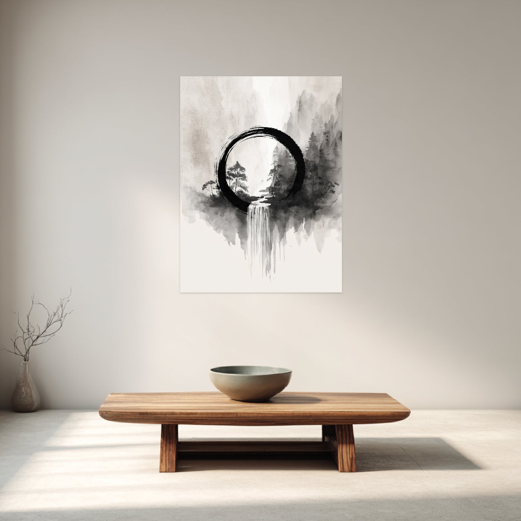 Das Motiv zeigt einen Wasserfall, der aus einem geöffneten Enso-Kreis sanft nach unten fließt. Die Tuschestruktur wirkt leicht und klar, wodurch der Übergang zwischen Licht, Schatten und Leere harmonisch erscheint. Neblige Bergformen im Hintergrund erzeugen eine ruhige Tiefe, die den Kreis und den Wasserfall wie in einem stillen Dialog hält. Die Komposition vermittelt ein Gefühl von Weite und Gelassenheit, das im Wohnzimmer oder Schlafzimmer eine meditative Atmosphäre entstehen lässt. Die achtsame Formensprache verbindet sich mit Zen Poster und Zen Poster Art.