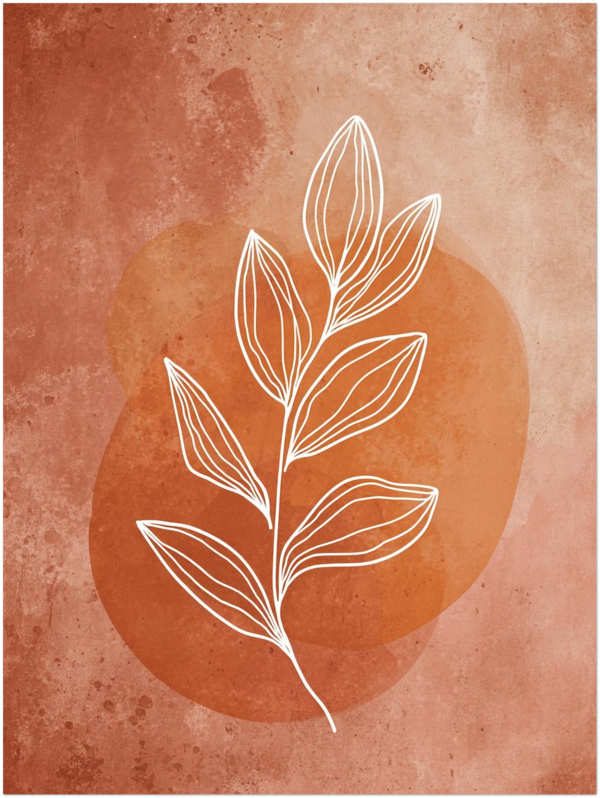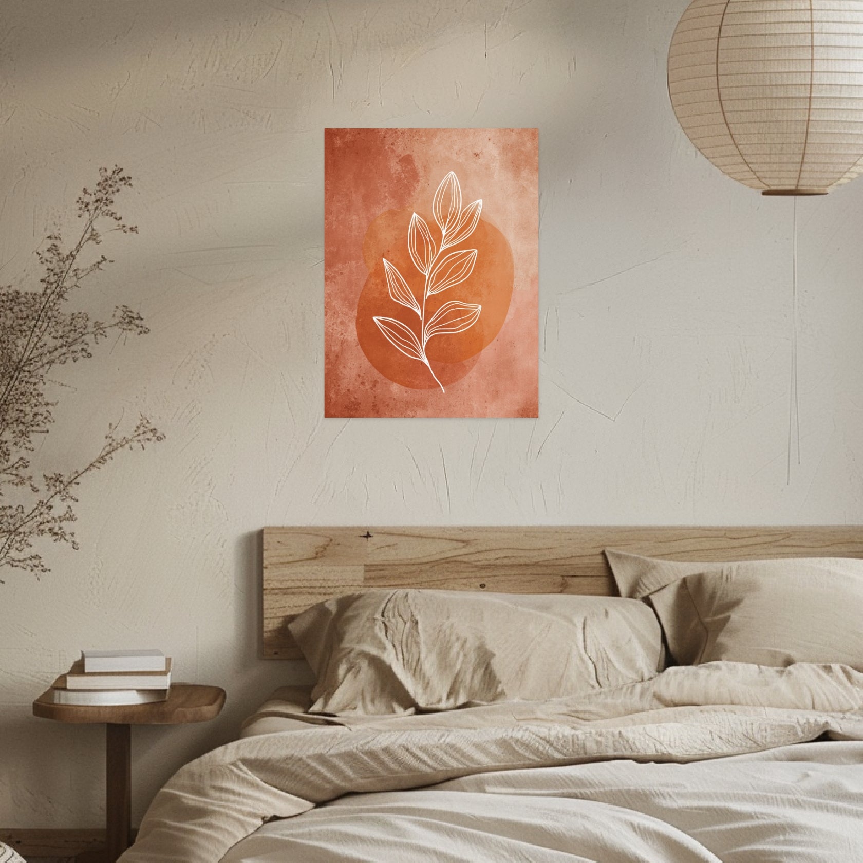 Auf dem warm strukturierten Terrakottahintergrund ruht der weiße Blattzweig wie eine zarte Geste, die sich fast schwebend in das Gesamtbild einfügt. Die Linien wirken ruhig und klar, während die erdigen Nuancen dem Motiv Tiefe verleihen und es besonders im Wohnzimmer oder Flur zu einem sanften Blickpunkt machen. Der Ausdruck ist von zurückhaltender Natürlichkeit geprägt und eröffnet Raum für die ruhigen Prinzipien des Japandi Stils. Die Komposition lehnt sich an feine, minimalistische Formen an und schafft eine Atmosphäre, die sich mühelos in ein ausgewogenes Japandi Interior integriert. Als Japandi Bild entwickelt es eine beständige innere Ruhe, während es als Japandi Wandbild die Klarheit und Wärme des harmonischen Zusammenspiels von Farbe und Form spürbar macht.