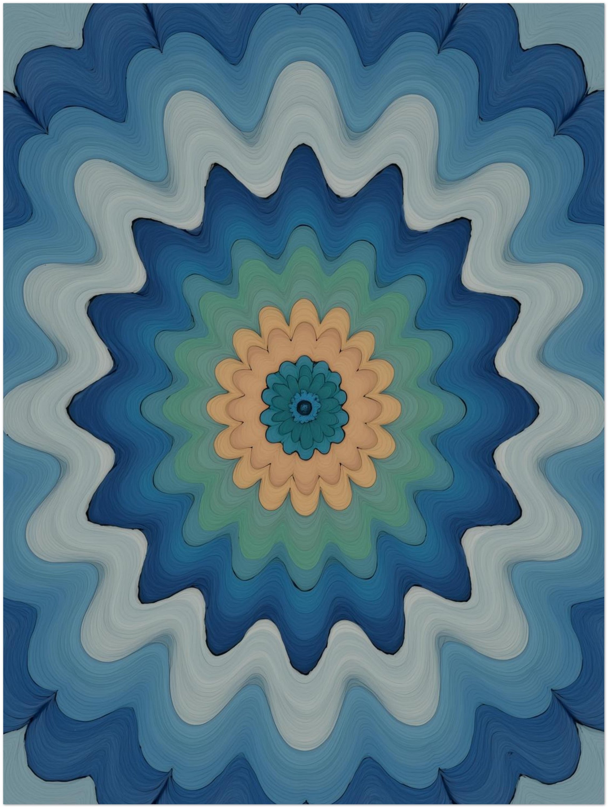 Aus einem ruhigen Mittelpunkt heraus entfaltet sich ein Geflecht aus weichen Wellenlinien, das an eine blühende Mandala-Form erinnert. Die Übergänge zwischen Blau-, Grün- und Naturtönen wirken fließend und erzeugen ein Gefühl von Balance und innerer Ordnung. Das Psychedelic Zusammenspiel aus Rhythmus und Farbe macht dieses Motiv zu einem stillen Energieträger. Als Psychedelic Art Poster eignet es sich besonders für das Wohnzimmer oder Schlafzimmer, wo es eine entspannte, harmonische Stimmung unterstützt. Der klare, moderne Psychedelic Style verbindet meditative Ruhe mit zeitgemäßer Ästhetik.