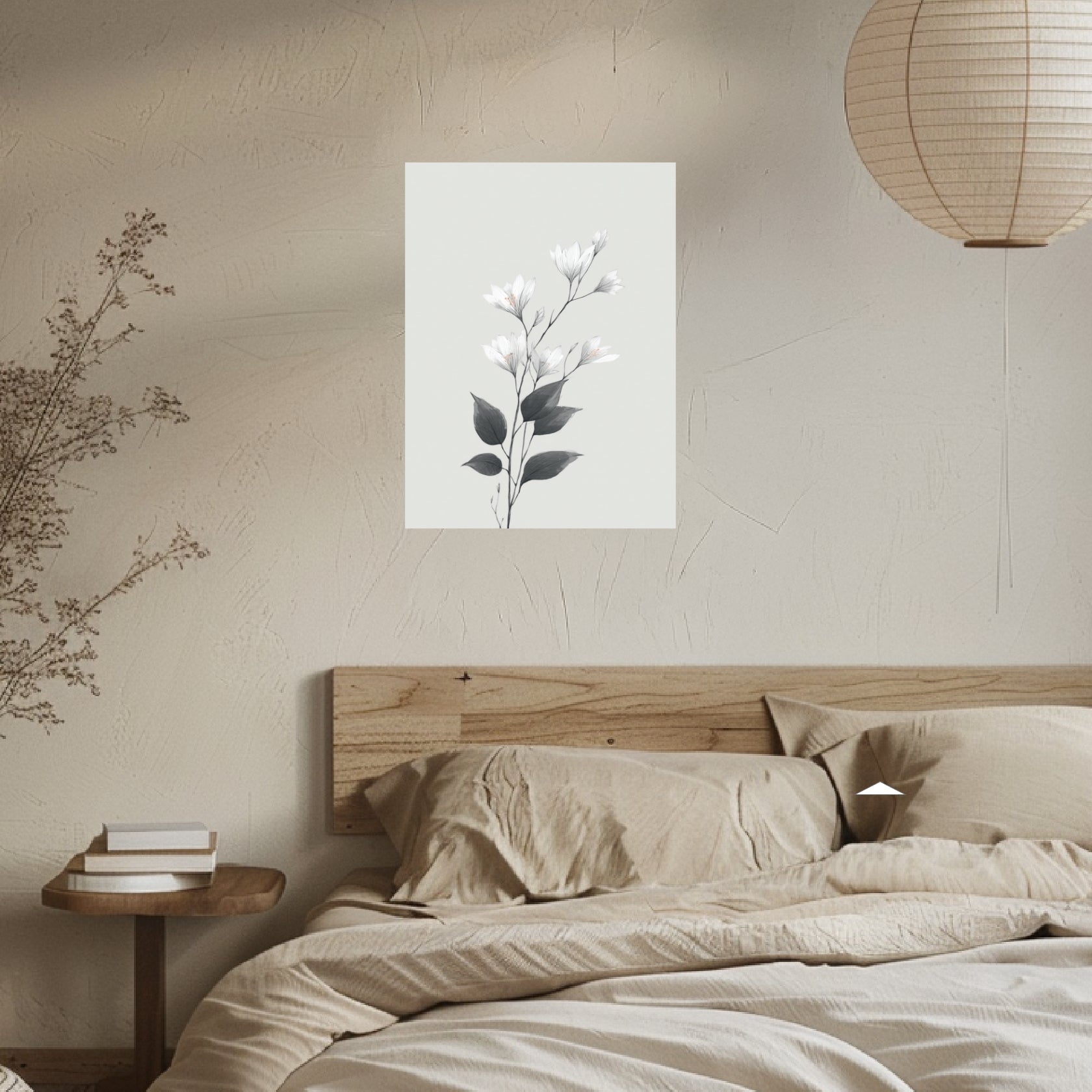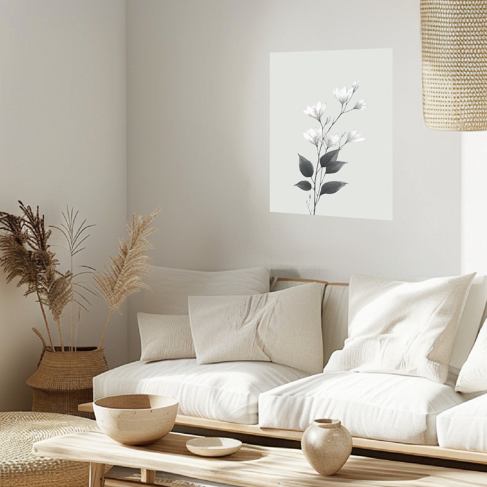 Fein gezeichnete Linien formen beim Zarte Kirschblüten Poster einen zarten Zweig, dessen helle Blüten sich sanft aus dunkleren Blättern erheben. Das Spiel aus Licht und Schatten wirkt wie eine stille Bewegung im Raum. Die Komposition ist reduziert, beinahe meditativ, und trägt die Essenz des Japandi Style in sich: Balance, Klarheit und Natürlichkeit. Auf hellem Grund entfalten sich Form und Struktur in ruhigem Gleichgewicht. Dieses Japandi Poster fügt sich besonders harmonisch in ein Schlafzimmer oder einen stillen Flur ein, wo es seine beruhigende Ausstrahlung entfalten kann. Das Motiv steht für Einfachheit, für den Augenblick zwischen Stille und Leben – ein Ausdruck von gelebter Achtsamkeit im Japandi Design.