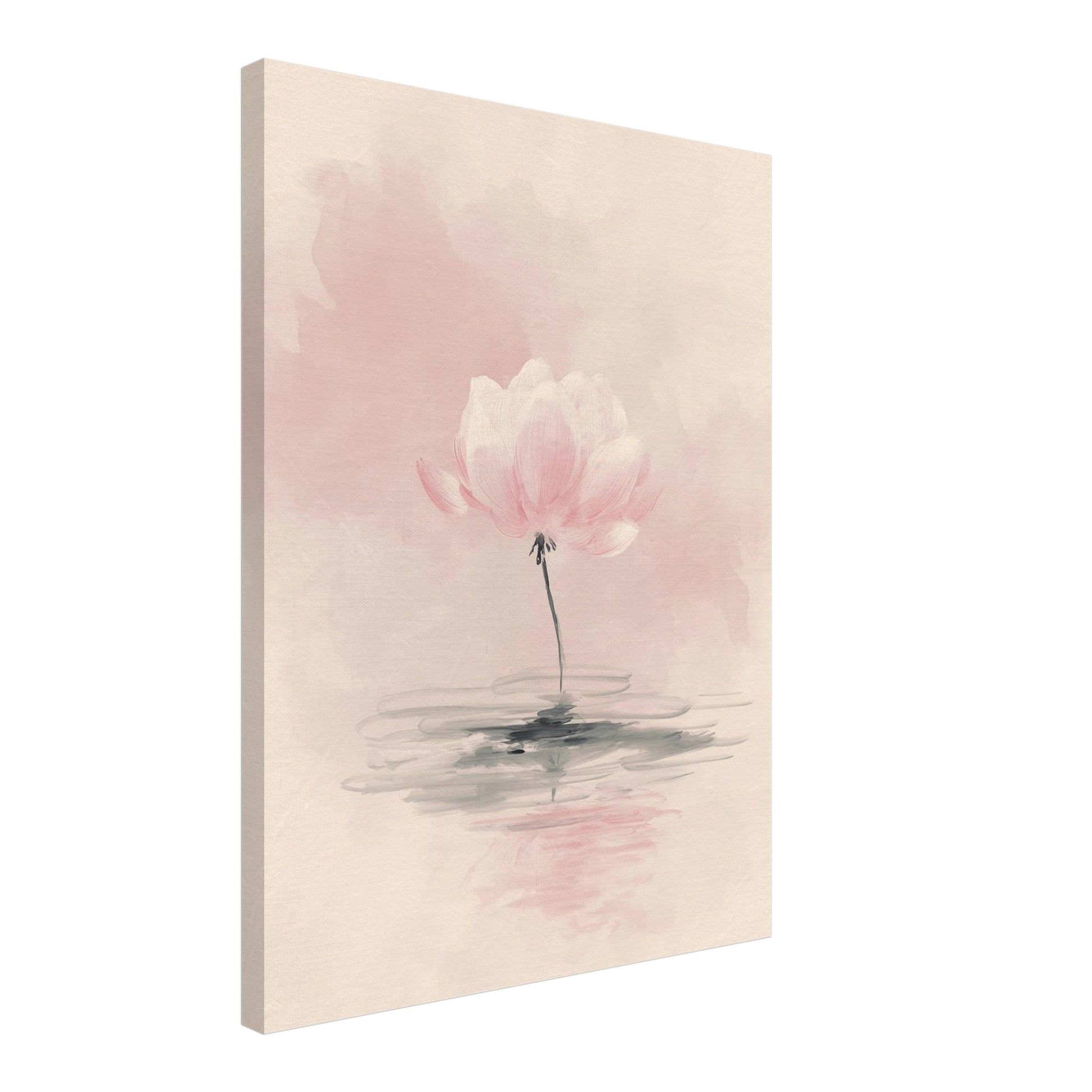 Auf der Leinwand entfaltet die rosa Blüte eine zurückhaltende, konzentrierte Ruhe. Die Struktur des Materials verleiht den Rosatönen eine feine Tiefe, die das Motiv lebendig und gleichzeitig still erscheinen lässt. Die leichte Spiegelung des Wassers führt zu einer weiten, atmenden Stimmung, die sich im Raum sanft verankert. Besonders im Flur oder Schlafzimmer wirkt das Bild wie ein leiser Ruhepol, der Klarheit schenkt. Die Komposition verbindet die stille Ordnung von Zen Design mit der gelösten Wirkung eines Leinwand Zen.