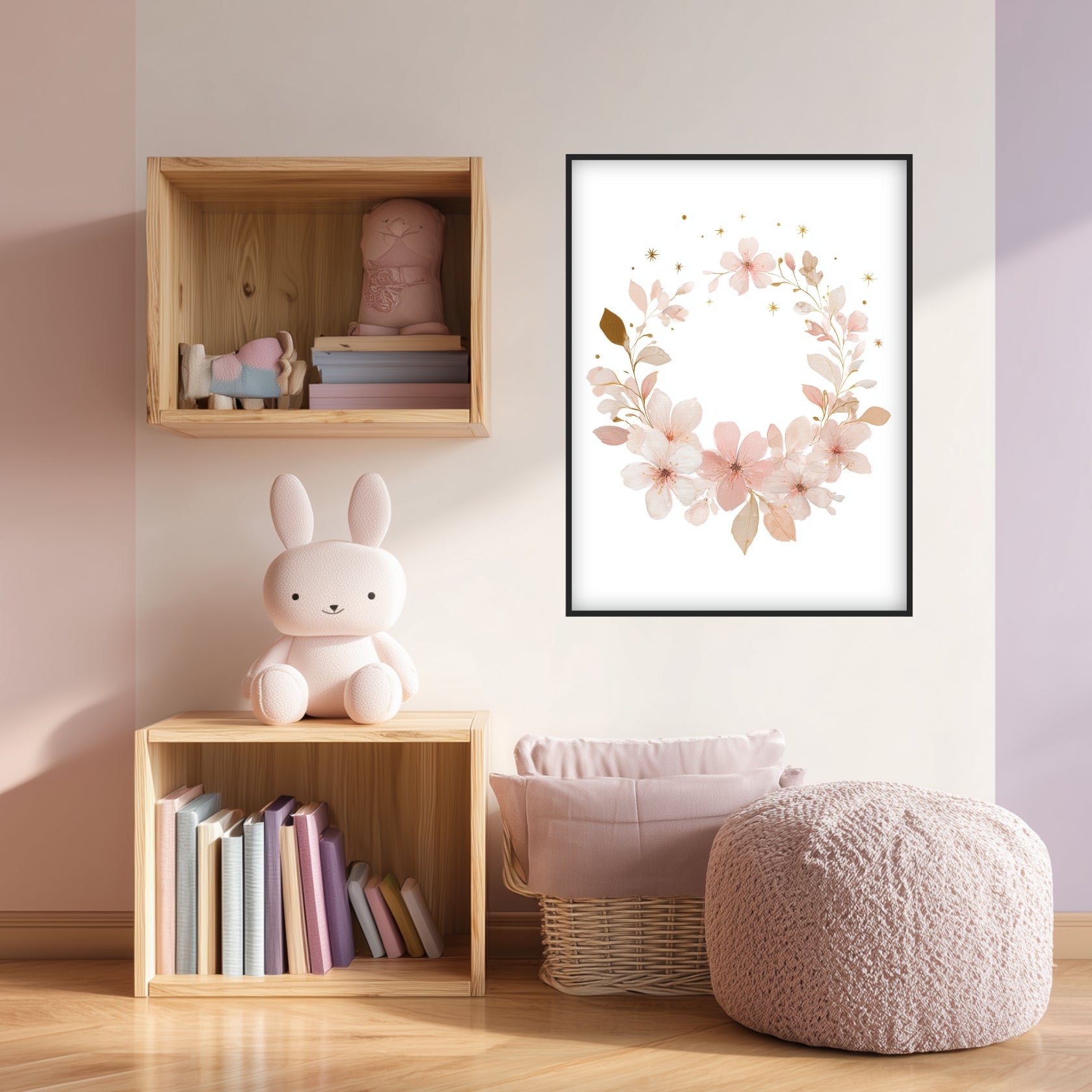 Dieses Poster zeigt einen offen gestalteten Blumenkranz aus zarten Blüten und feinen Zweigen. Die Aquarellfarben sind bewusst zurückhaltend gewählt: Rosé, Creme und helle Beigetöne sorgen für eine ruhige, sanfte Wirkung. Kleine goldene Stern- und Punktakzente lockern die Komposition auf und verleihen dem Motiv eine dezente, edle Note.