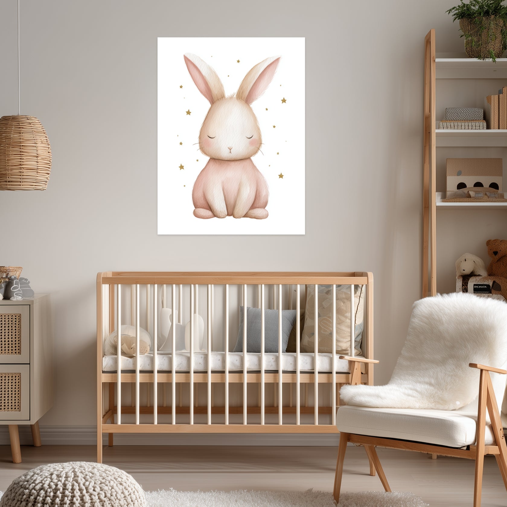 Dieses Poster zeigt einen schlafenden Hasen in zarter Aquarelltechnik. Die weichen Formen, die geschlossenen Augen und die zurückhaltende Farbpalette aus Creme, Rosé und hellem Beige vermitteln Ruhe und Sicherheit. Kleine goldene Sterne verleihen dem Motiv eine märchenhafte, kindgerechte Note.