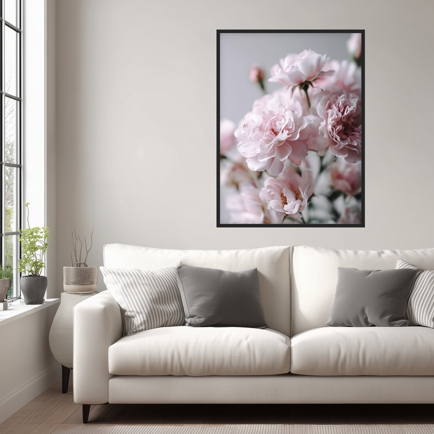 Mehrere Gartenrosen stehen dicht beieinander und füllen das Bild mit ihren fein geschichteten Blütenblättern. Die Blüten zeigen unterschiedliche Öffnungsstadien und reichen von zartem Rosa bis zu sehr hellen Nuancen. Der Hintergrund bleibt weich und zurückgenommen, wodurch die Rosen klar hervortreten. Diese ruhige Bildkomposition eignet sich besonders für das Wohnzimmer oder den Flur, wo das Poster eine sanfte, natürliche Atmosphäre schafft. Die matte Darstellung unterstreicht die feine Struktur der Blüten.