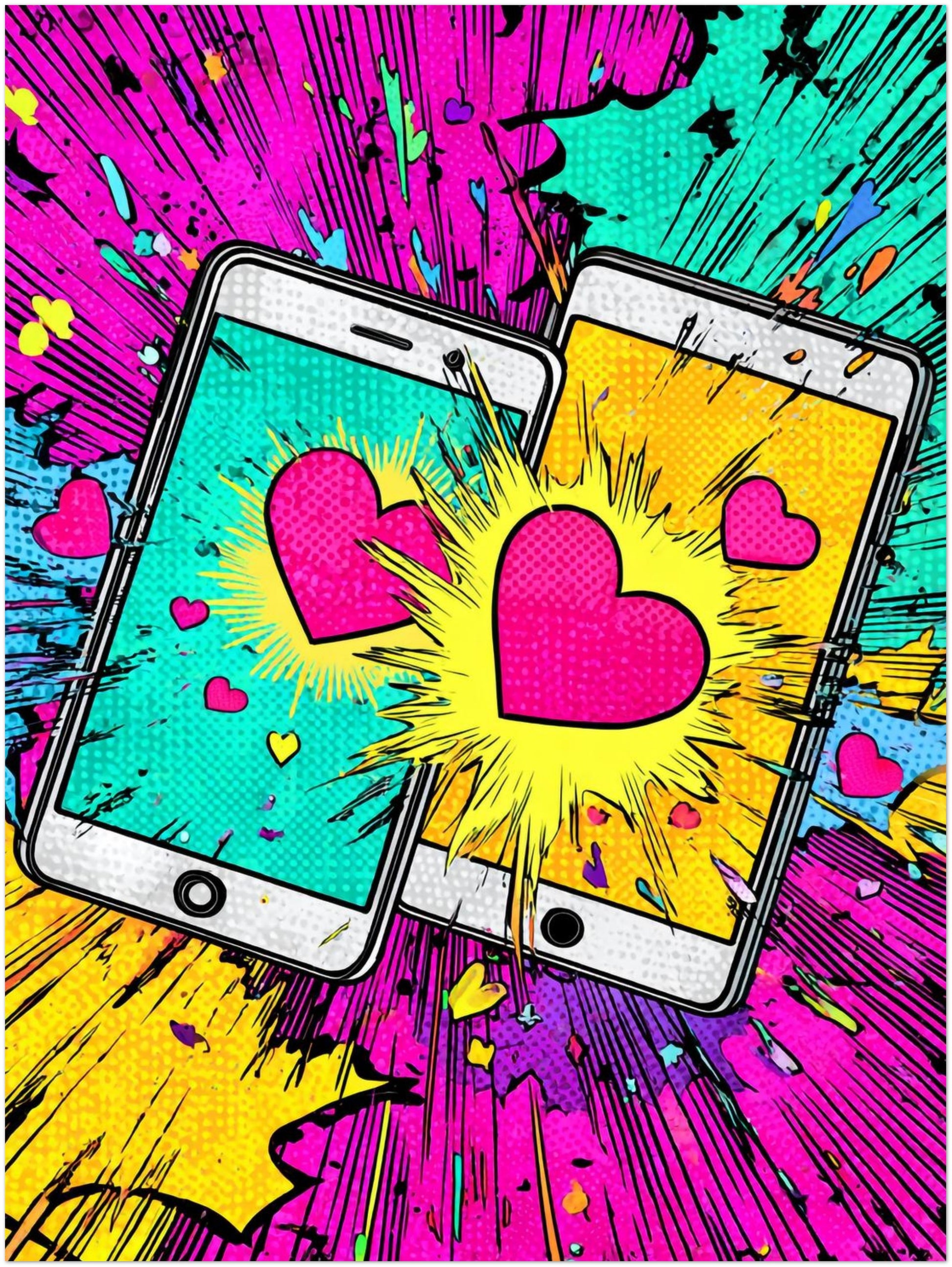 Boom! Das Pop Art Poster „Zwei Handys mit Herzen“ zündet eine Explosion aus Farbe, Form und Gefühl. Neonpink trifft auf Türkis, Gelb und Violett – ein wahrer Farbrausch, der digitale Kommunikation in pure Kunst verwandelt. Zwei Smartphones scheinen im Moment des Aufeinandertreffens zu explodieren, während Herzen und Strahlen den Hintergrund füllen. Das Werk ist eine augenzwinkernde Hommage an Social Media, Liebe im 21. Jahrhundert und visuelle Überreizung. Dieses Popular Art-Highlight zieht alle Blicke auf sich und bringt mit seinem Pop Art Motiv den Popart Stil in seiner lebendigsten Form an die Wand.