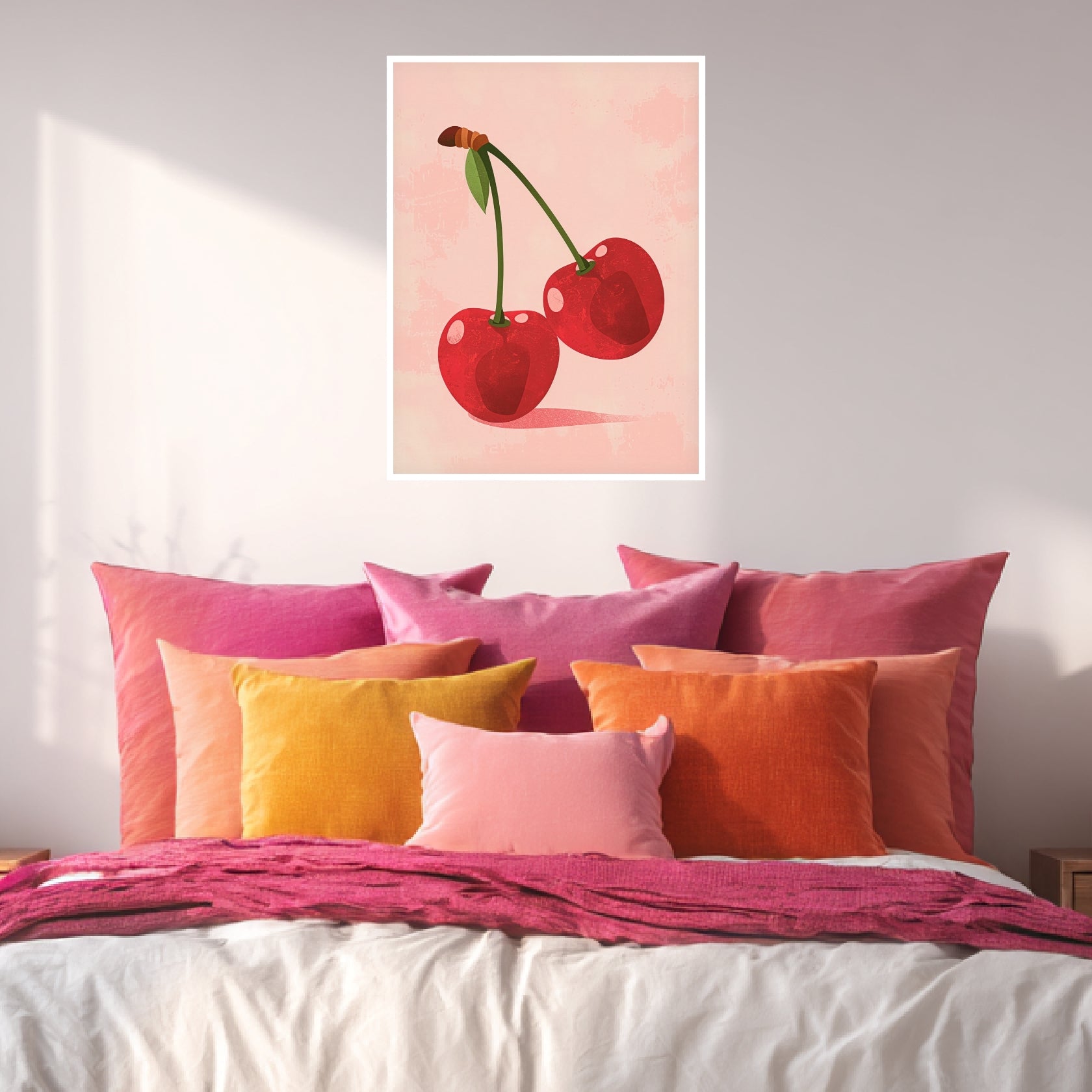 Ein sanftes Rosa als Hintergrund und zwei leuchtende Kirschen im Vordergrund – das Dopamine Decor Poster „Zwei Kirschen rosa“ verkörpert pure Lebensfreude. Die satten Rottöne und glänzenden Reflexe verleihen dem Motiv eine sinnliche Tiefe, während der helle Untergrund Leichtigkeit und Eleganz ausstrahlt. Dieses Werk im Dopamine Style füllt Räume mit Energie und Charme. Besonders in der Küche oder im Flur sorgt es als stilvolle Dopamine Deko und moderne Dopamine Art für fröhliche Akzente.