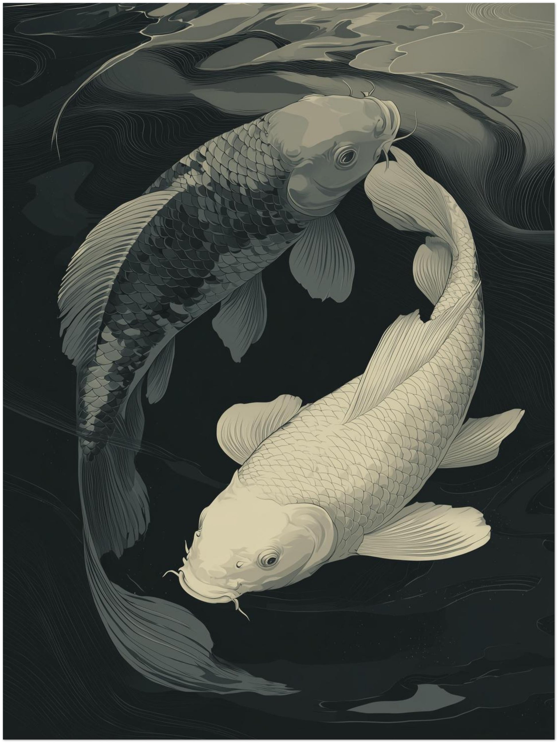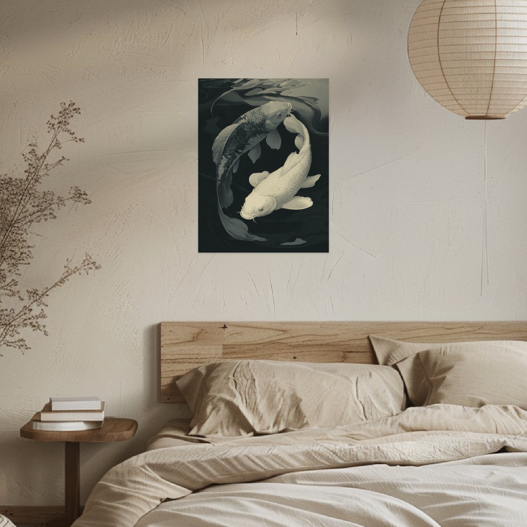 Aus der Dunkelheit des Wassers treten zwei Koi hervor, deren Bewegungen sich zu einem geschlossenen Kreis verbinden. Ihre Körper folgen einer ruhigen Linie, die das Motiv trägt und ihm Tiefe verleiht. Licht und Schatten wechseln sich sanft ab und lassen die Schuppen lebendig wirken, ohne laut zu sein. Diese Bildsprache ist tief in der Japanische Kunst verwurzelt und übersetzt sie in ein zeitgemäßes Japandi Design. Als Japandi Poster eignet sich das Motiv besonders für das Wohnzimmer oder den Flur, wo es eine ruhige, konzentrierte Atmosphäre schafft und den Raum visuell ordnet.