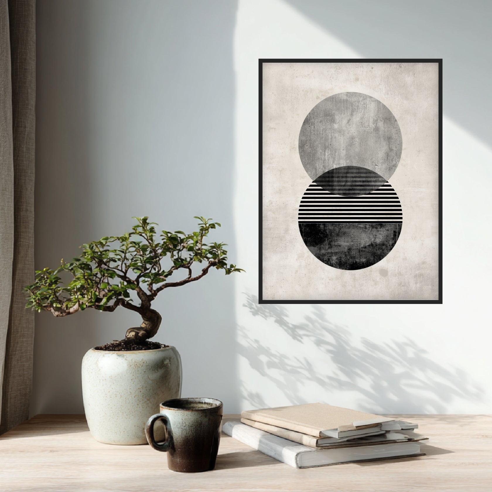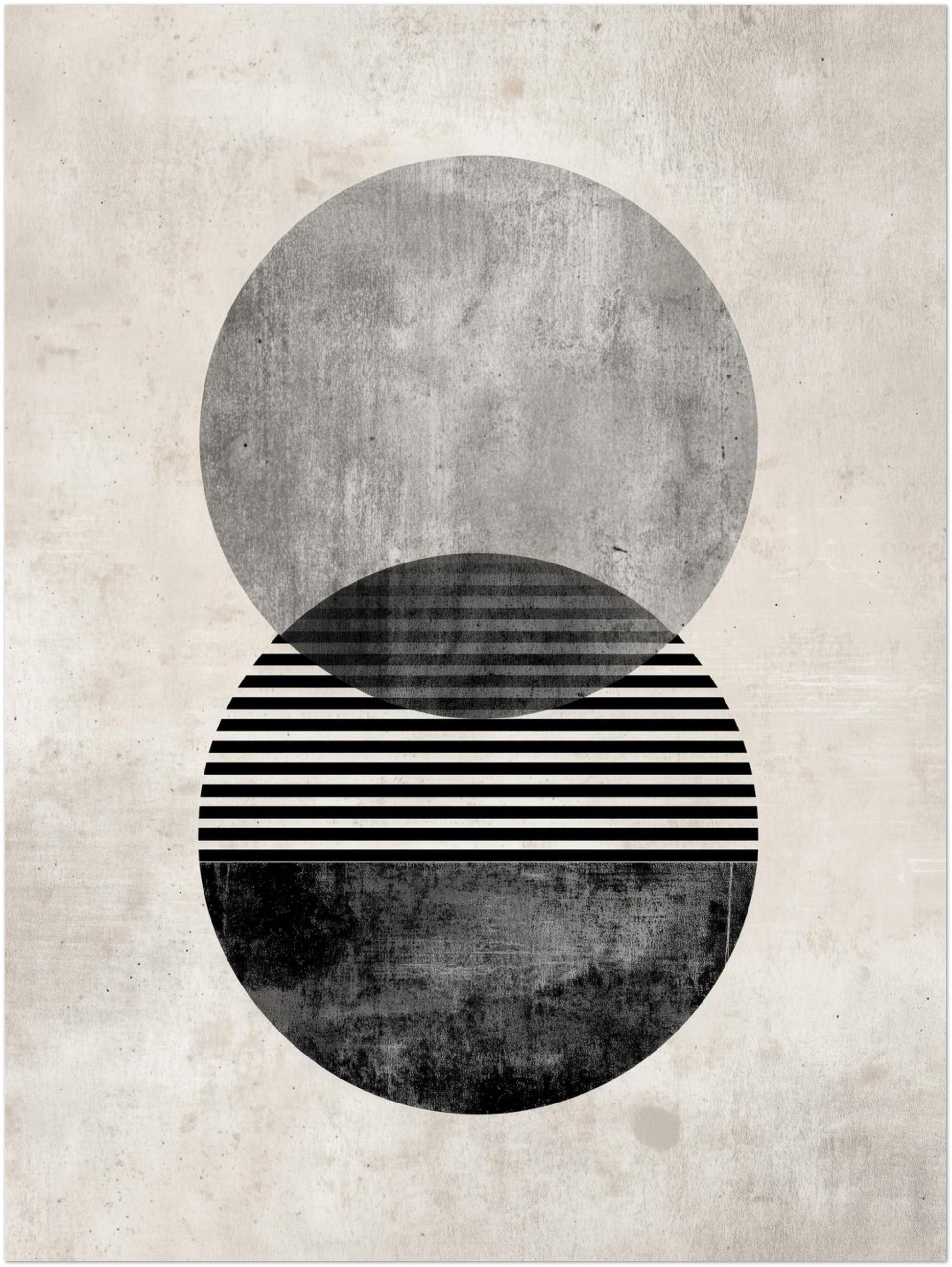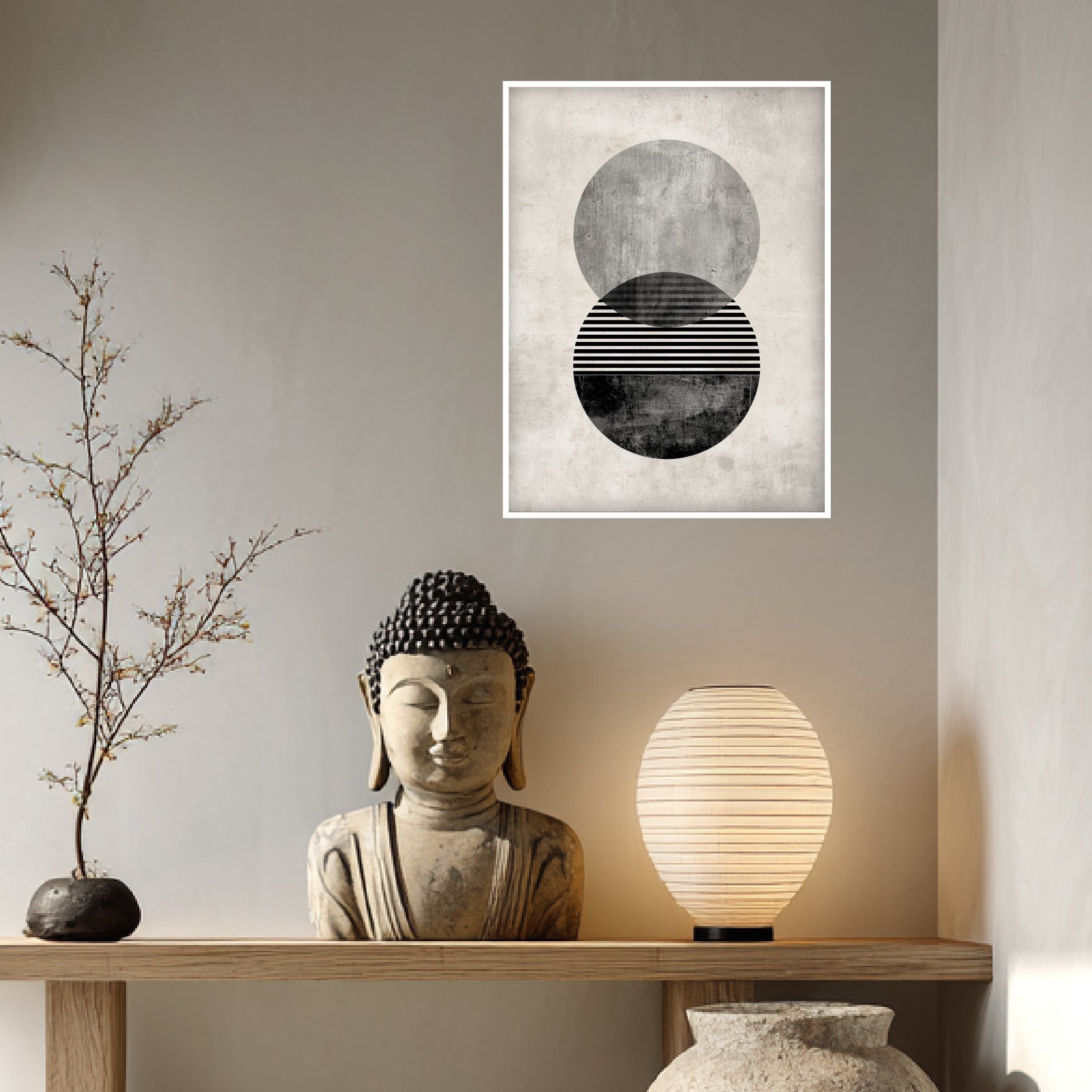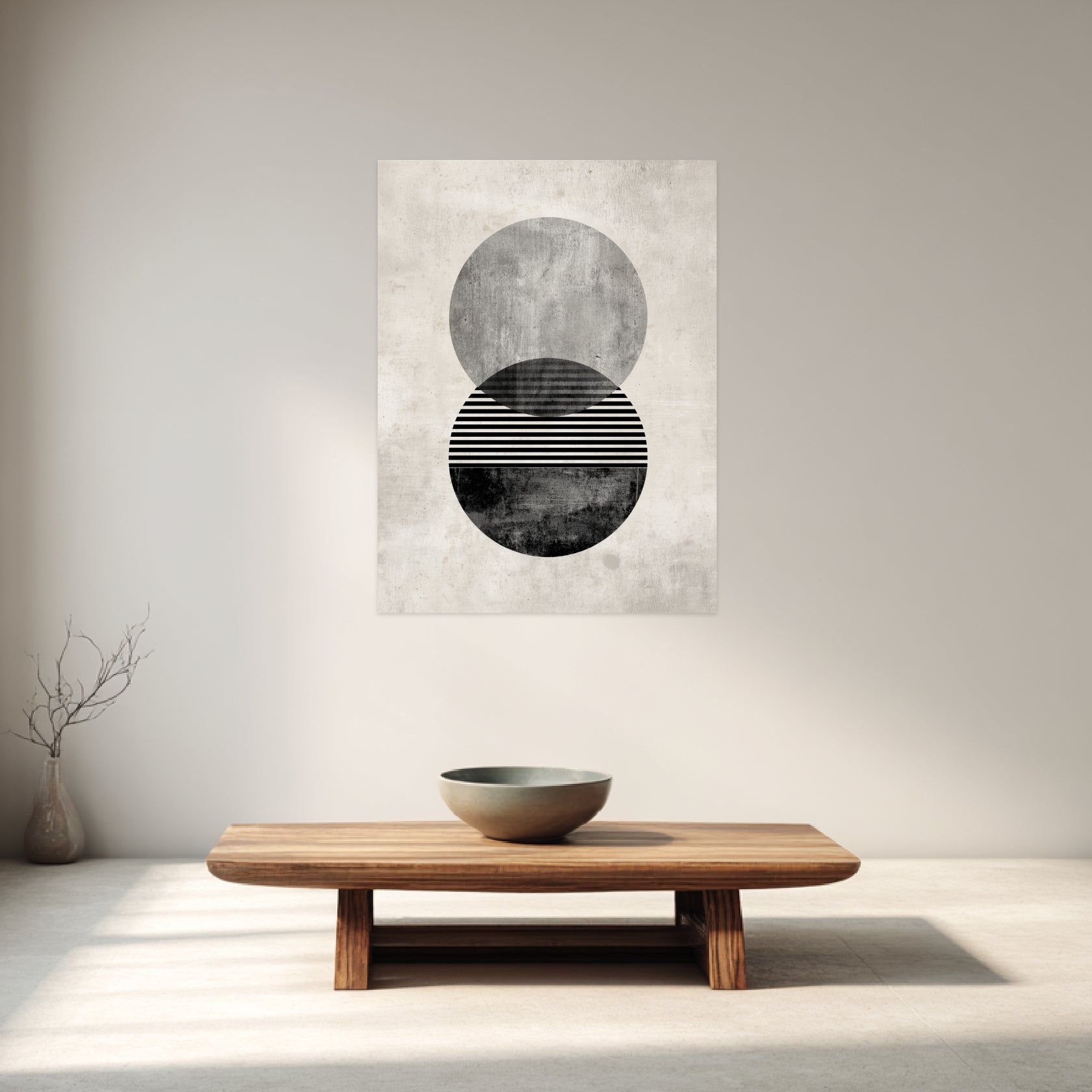 Das Motiv zeigt zwei Kreise, die sich in einer stillen Überlagerung begegnen. Der obere wirkt transparent und weich, während der untere durch horizontale Linien eine klare Struktur erhält. Die Grautöne bleiben zurückhaltend und öffnen einen ruhigen visuellen Raum, in dem Form und Leere miteinander verbunden sind. Die Komposition führt den Blick achtsam von der weichen Fläche zur geordneten Linie und schafft eine meditative Spannung. In Wohn- oder Schlafbereichen kann dieses Motiv einen ruhigen Fokuspunkt bilden. Seine Wirkung entfaltet sich in Verbindung mit Zen Poster und Zen Poster Art.